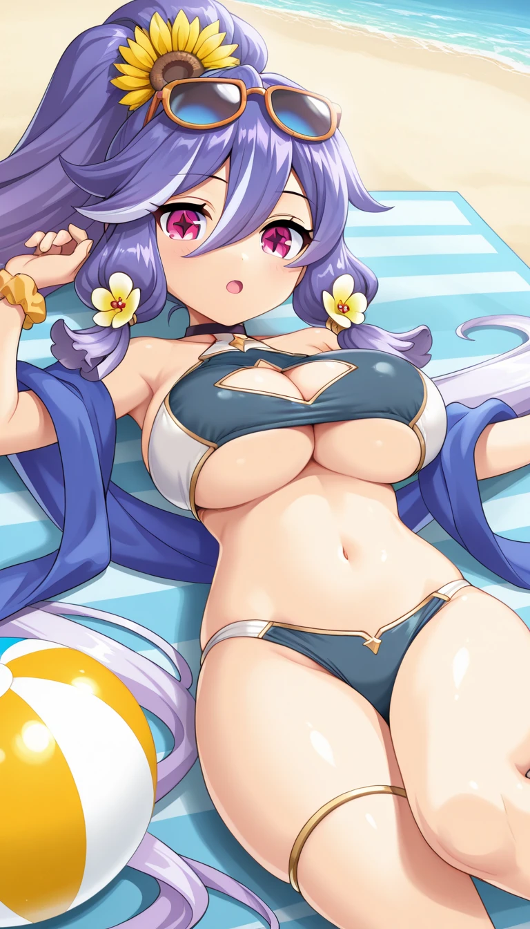 Sport-Bikini Costume: HattoriHanzou\(legend clover\), 1girl, very long hair, white hair, purple hair, two-tone hair, gradient hair, high ponytail, sidelocks, hair between eyes, hair flower, sunflower hair ornament, yellow flower, sunflower, pink eyes, star-shaped pupils, sunglasses, eyewear on head, choker, collarbone, large breasts, cleavage, cleavage cutout, underboob, bare shoulders, two-tone bikini, sports bikini, halterneck, gold trim, blue shawl, wrist scrunchie, navel, bare legs, thighlet, flip-flops, toes,