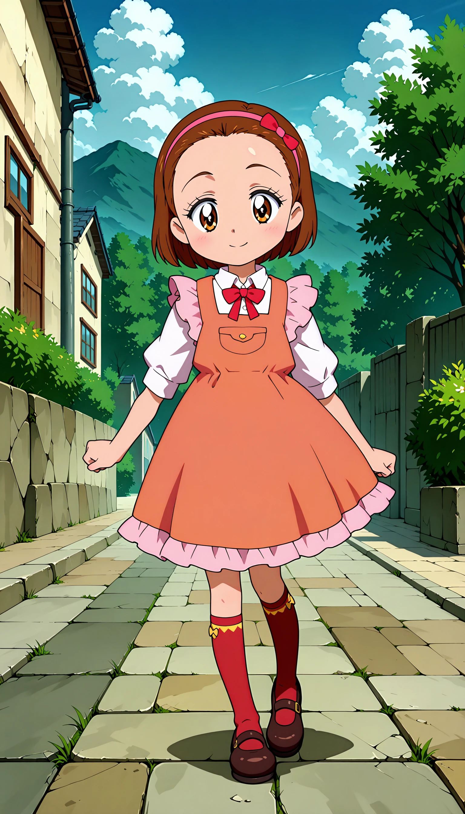 (pink shirt:1.1),(short sleeves:1.1),(pink puffy sleeves:1.1),(orange dress:1.1),(pocket:1.1),(frills:1.1),(brown boots:1.2)Weight: Between 0.7 / 1.0