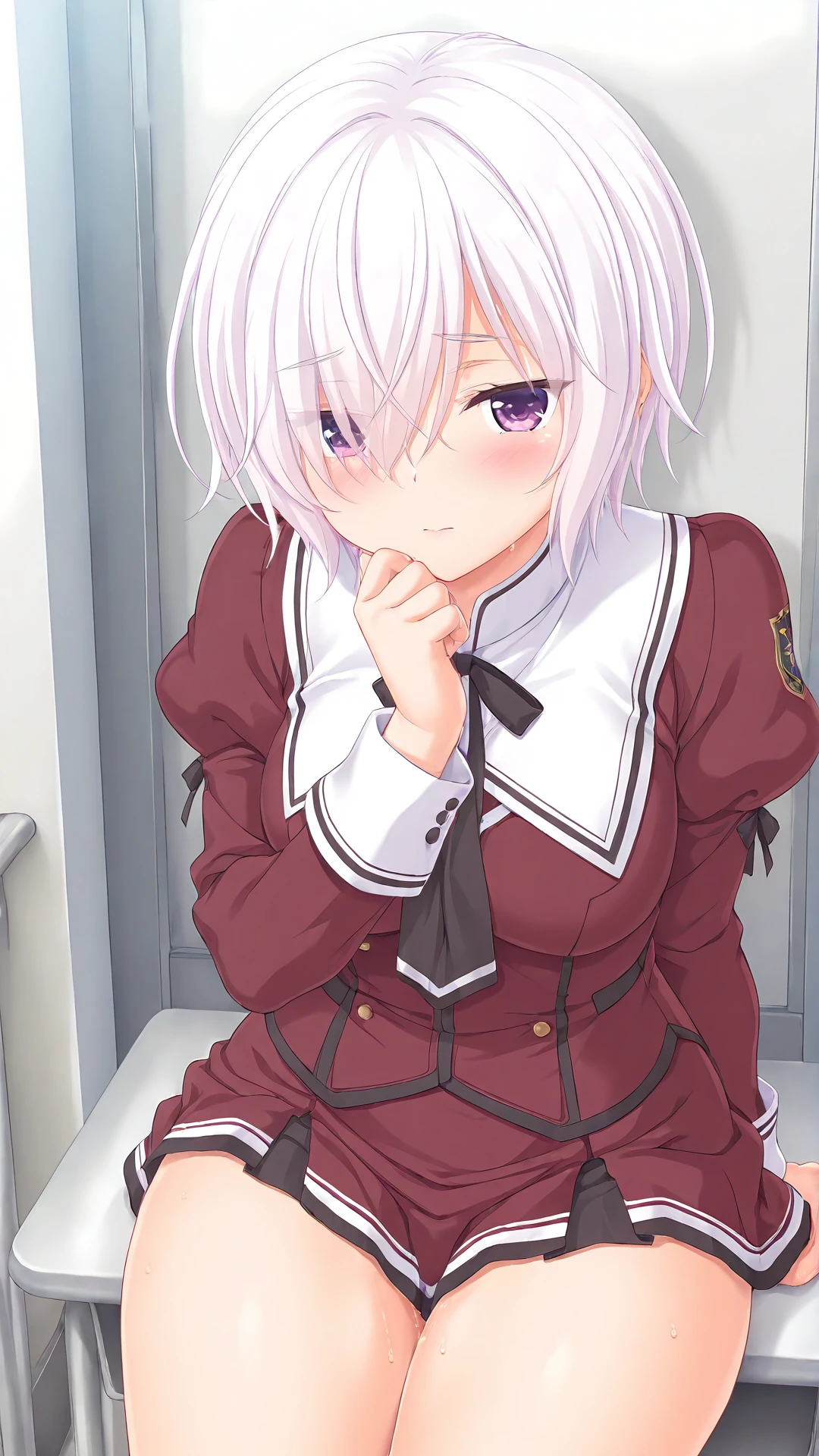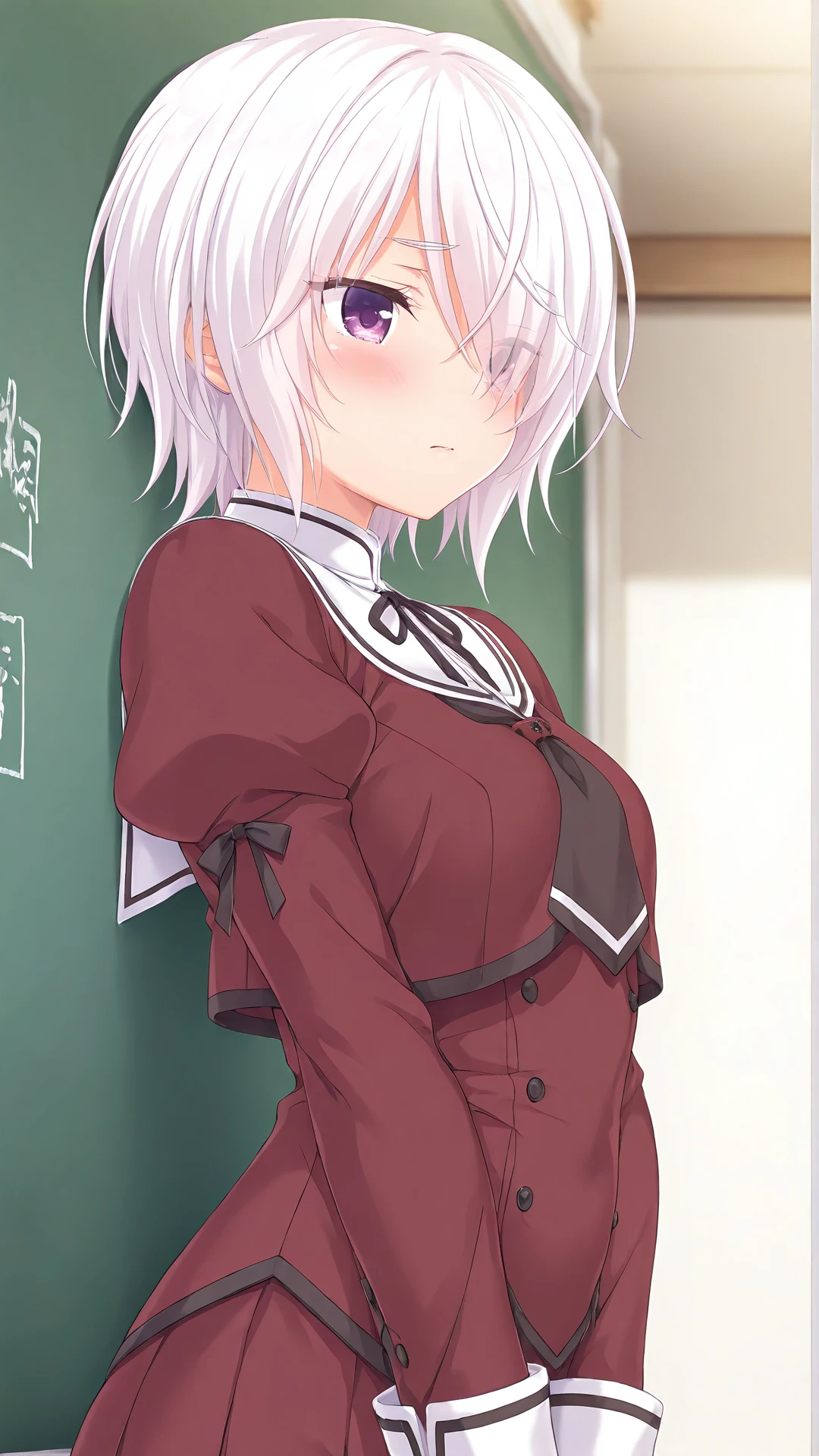 ,Shinoyama Yuu, 1girl, short hair, white hair, hair over one eye, purple eyes, school uniform, long sleeves, juliet sleeves, puffy sleeves
