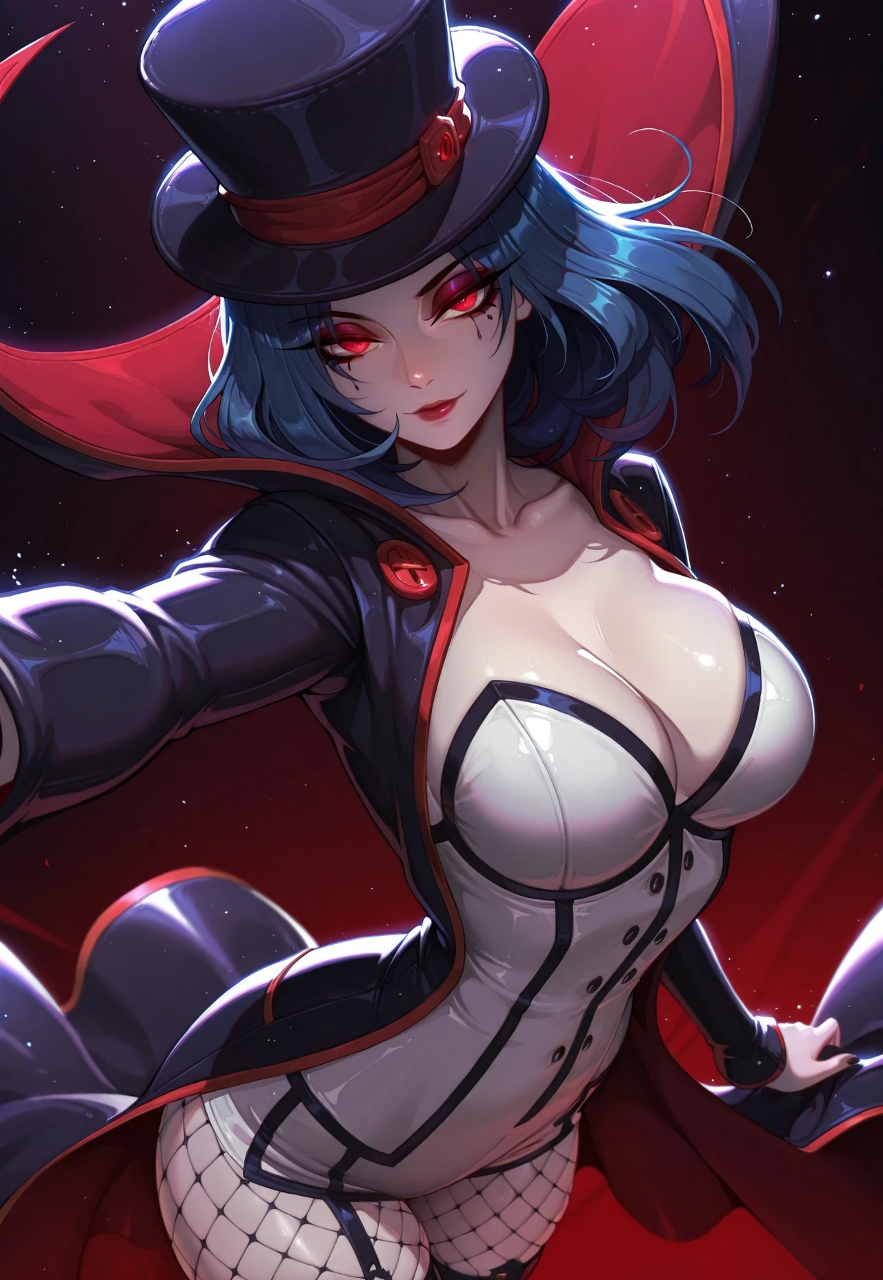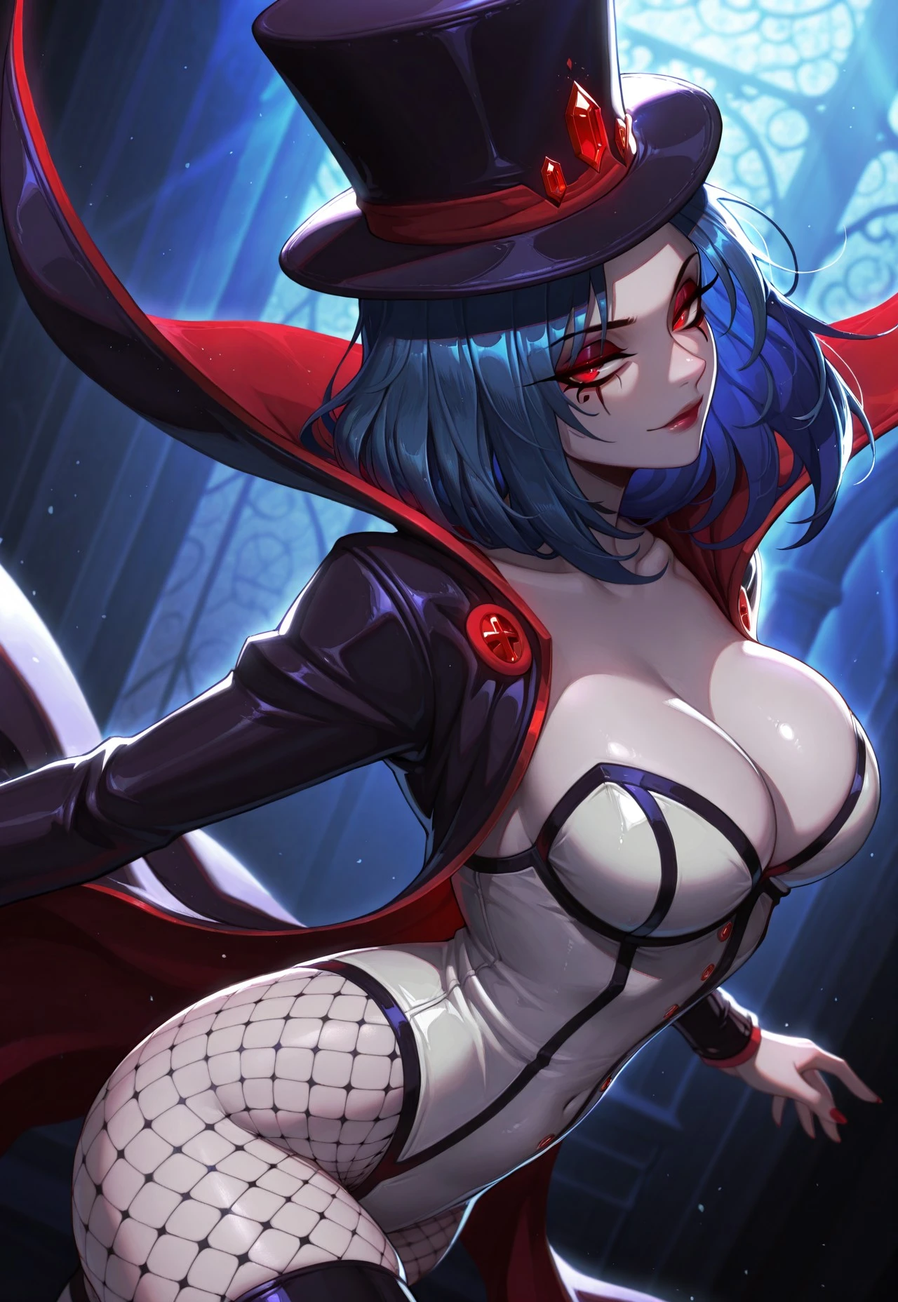 PRleblanc,multicolored dress,cleavage,blue hair,medium hair,eye makeup,,headwear,tophat,thighhighs,fishnets,