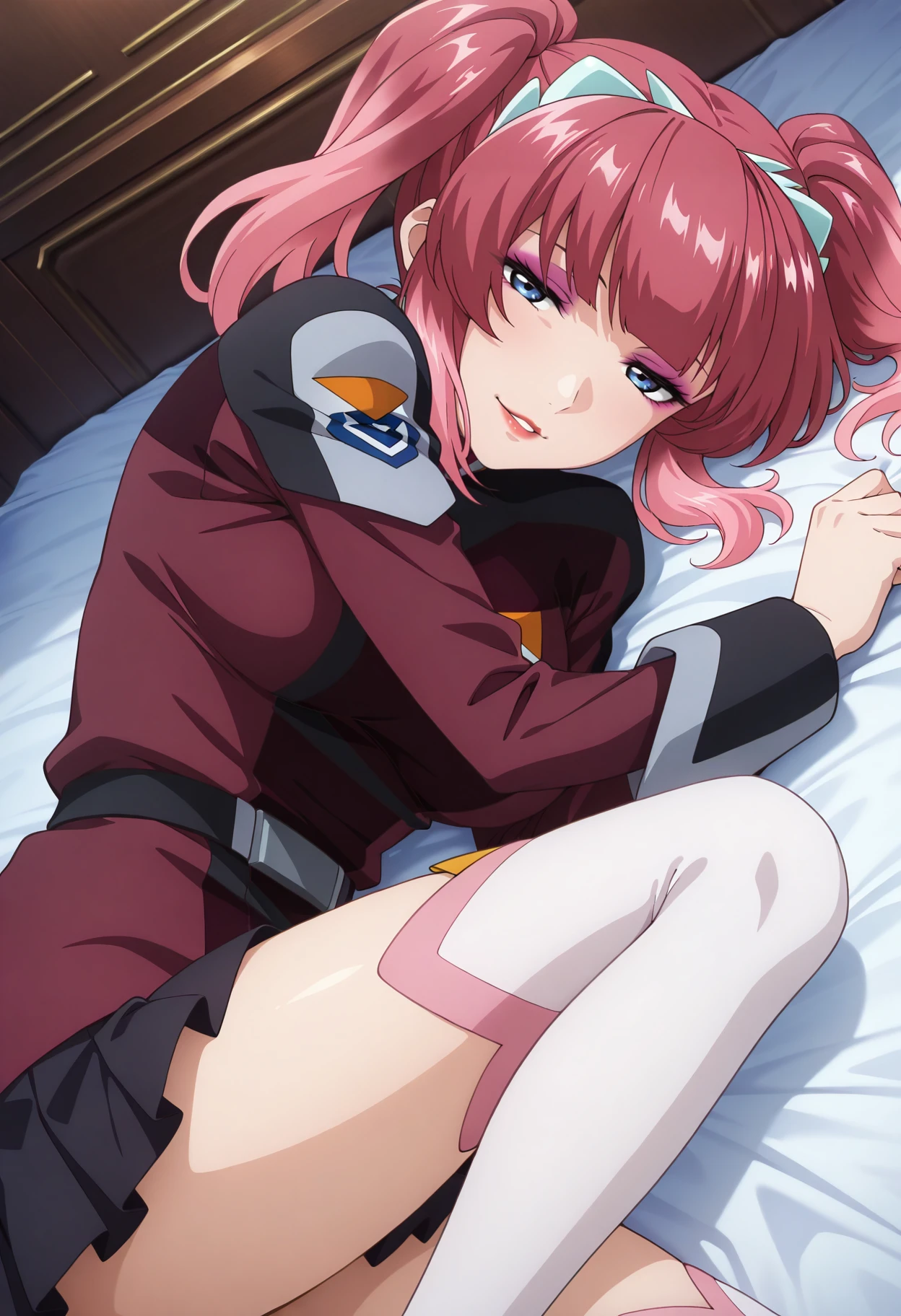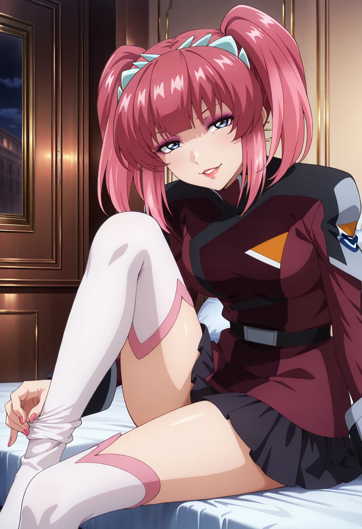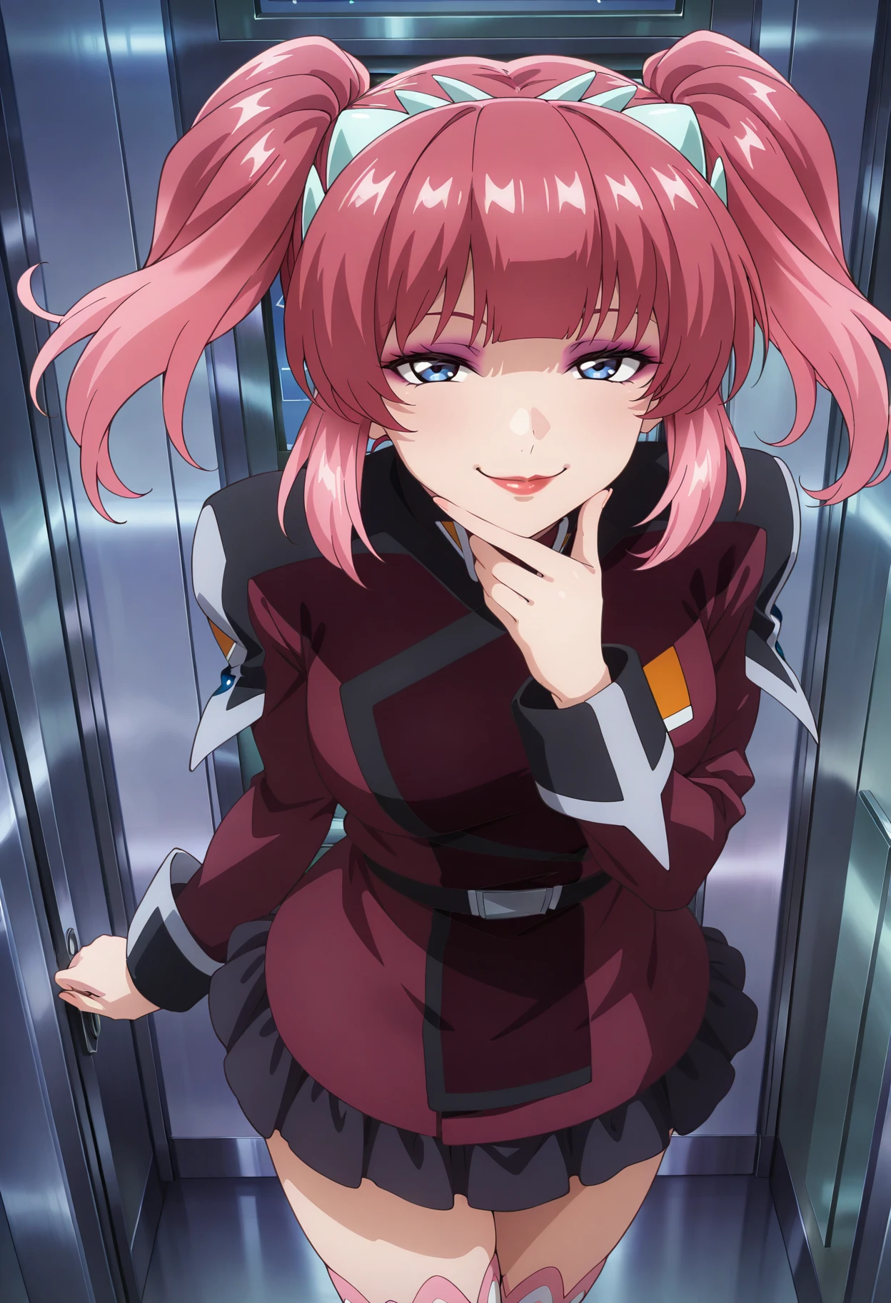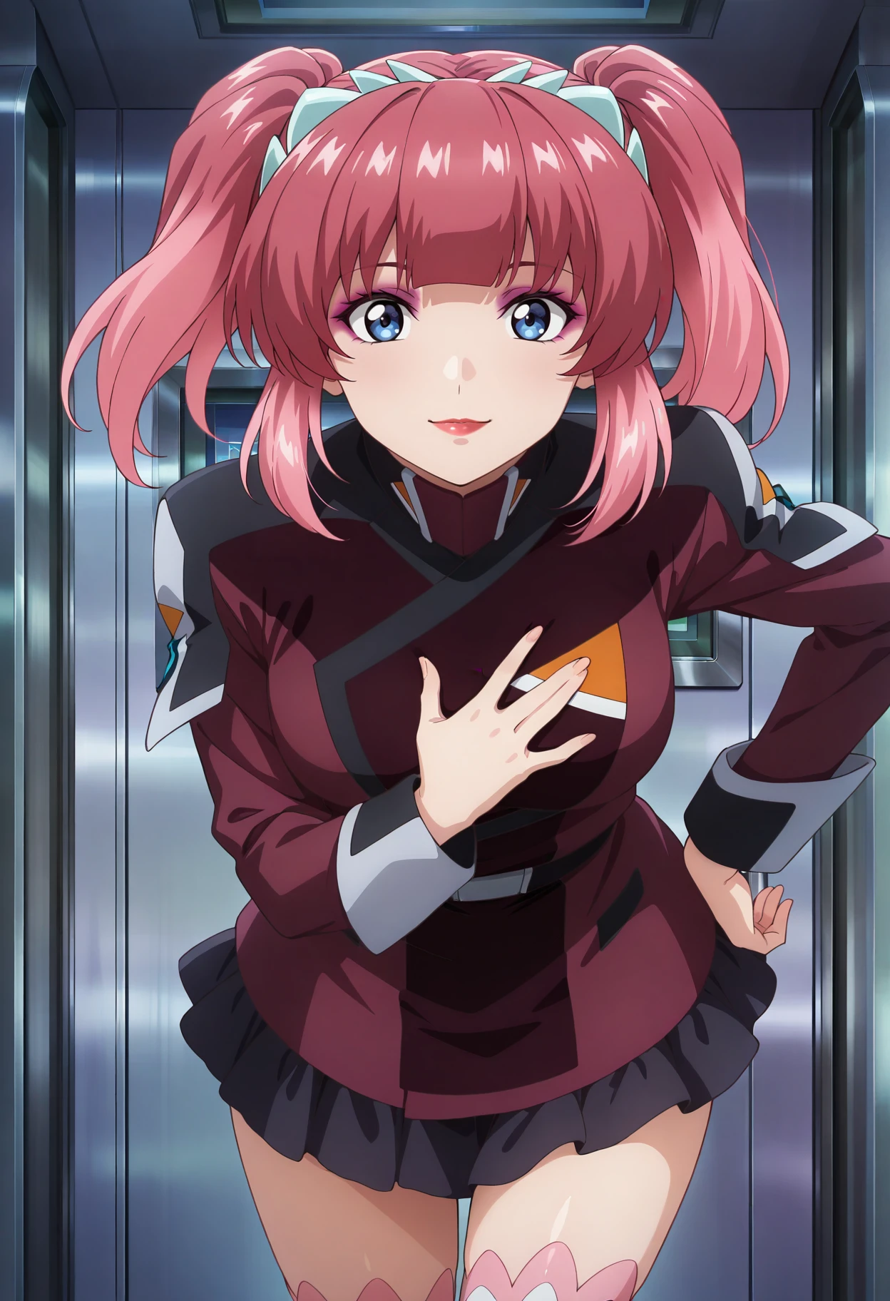 Base: agnes_g, 1girl, anime coloring, solo, short twintails, hairband, blunt bangs, pink hair, sidelocks, blue eyes, lipstick, eyeshadow, compass uniform, red jacket, black miniskirt, white frilled thighhighs, pleated skirt, belt, long sleeves, medium breasts,