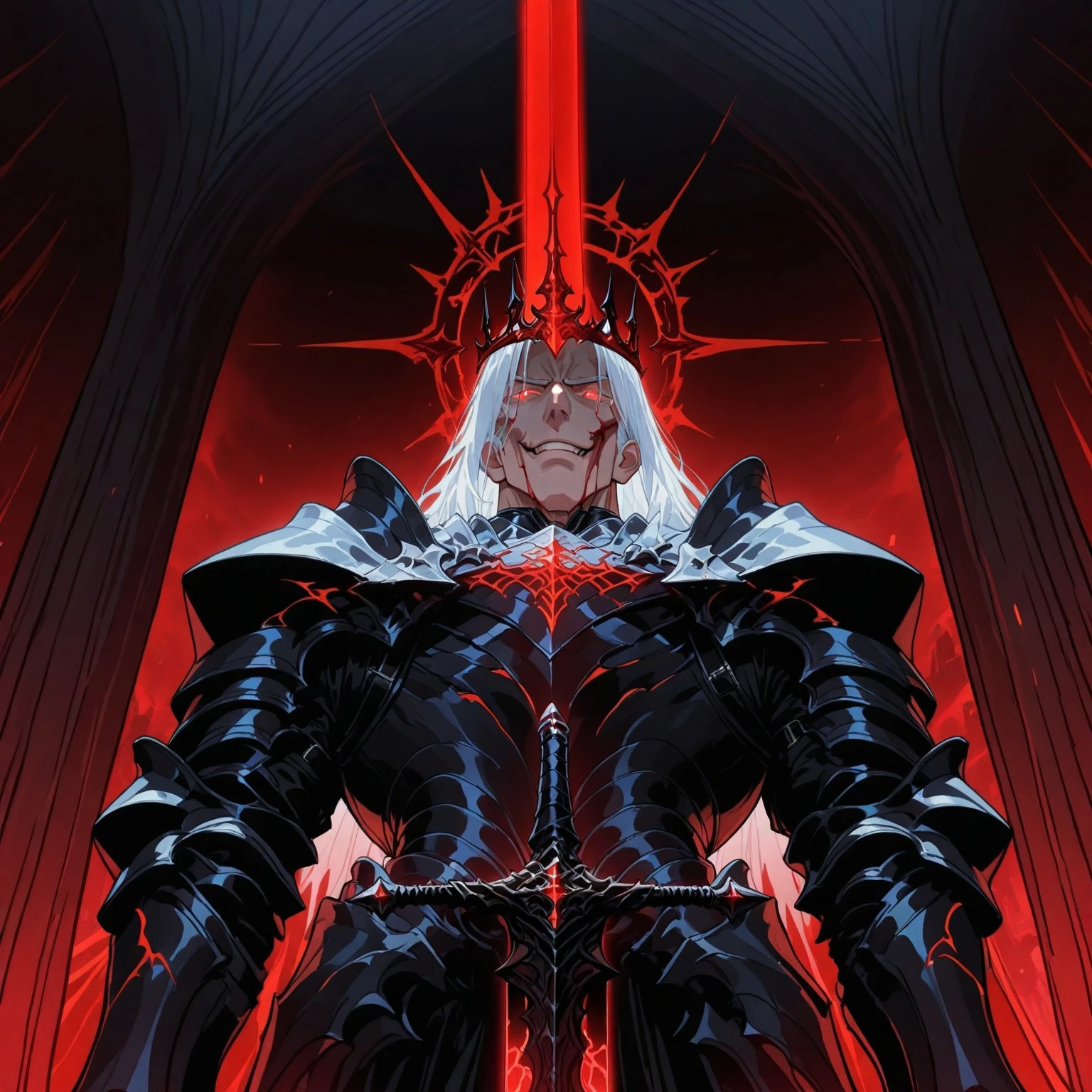 Volkath, red crown, magical red crown, angular jawline, high cheekbones, glowing red eyes, ideal outfit, default outfit, muscular