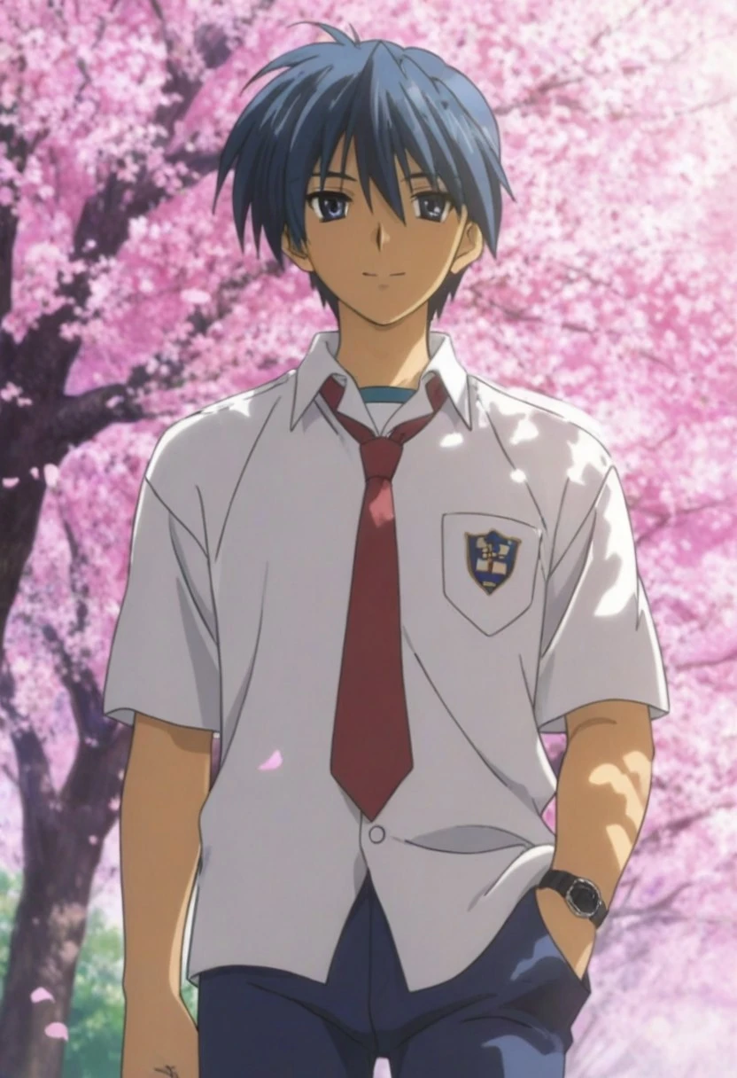 Tomoya Okazaki, blue hair, blue eyes, white collared shirt, blue undershirt, short sleeves, untucked shirt, red necktie, wristwatch, blue pants