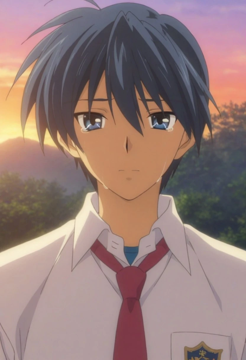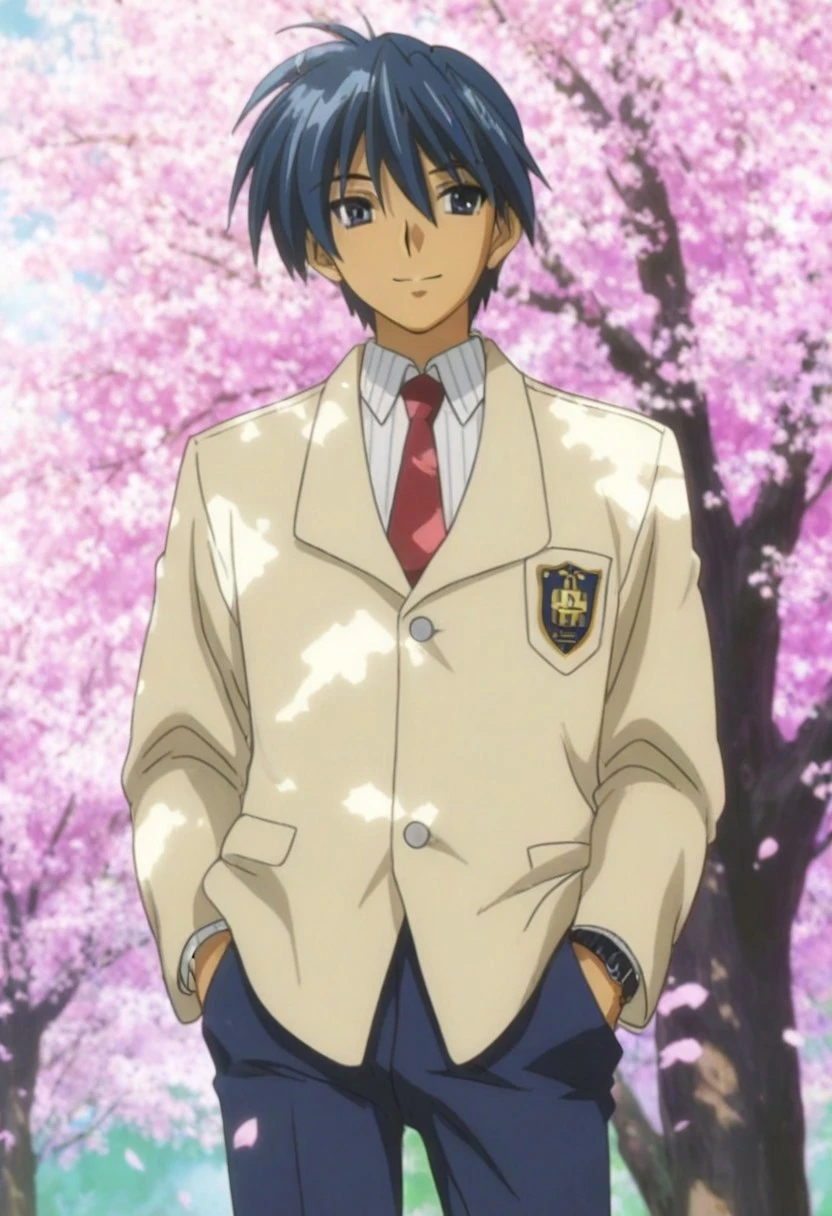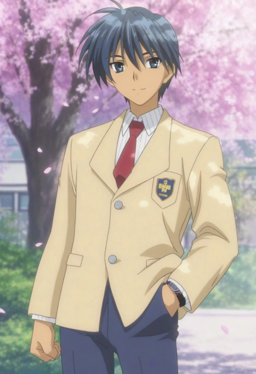 Tomoya Okazaki, blue hair, blue eyes, yellow blazer, white collared undershirt, red necktie, wristwatch, blue pants