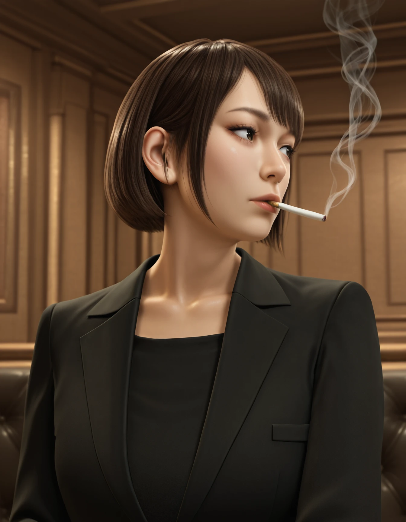 mukoda, short hair, pearl necklace, skirt suit, black jacket, blouse, black skirt