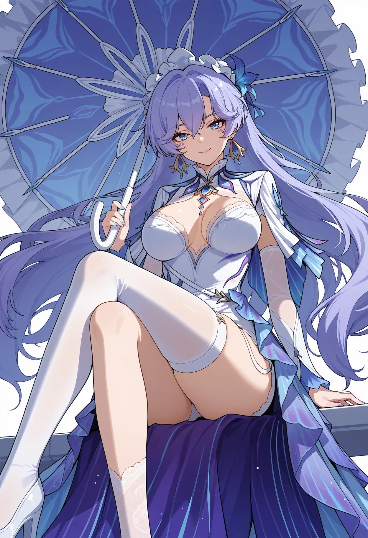 white dress,single thighhigh,high heels,single thighhigh,white footwear,white lace sock,single sock,white thighhigh,hair flower,white thighhigh,