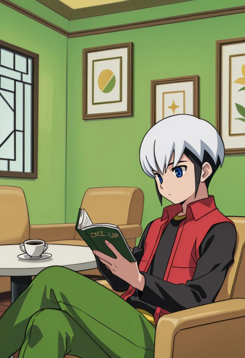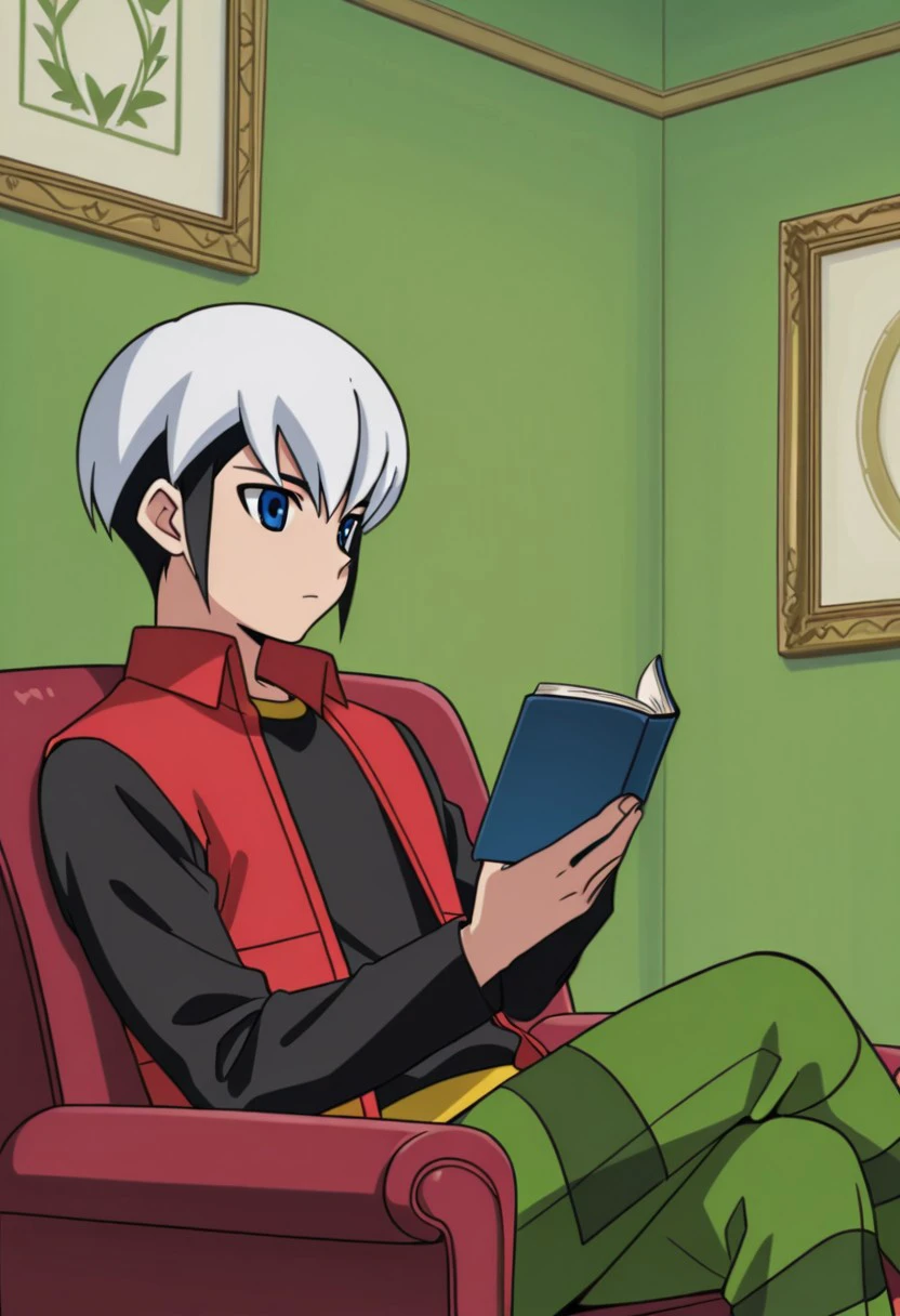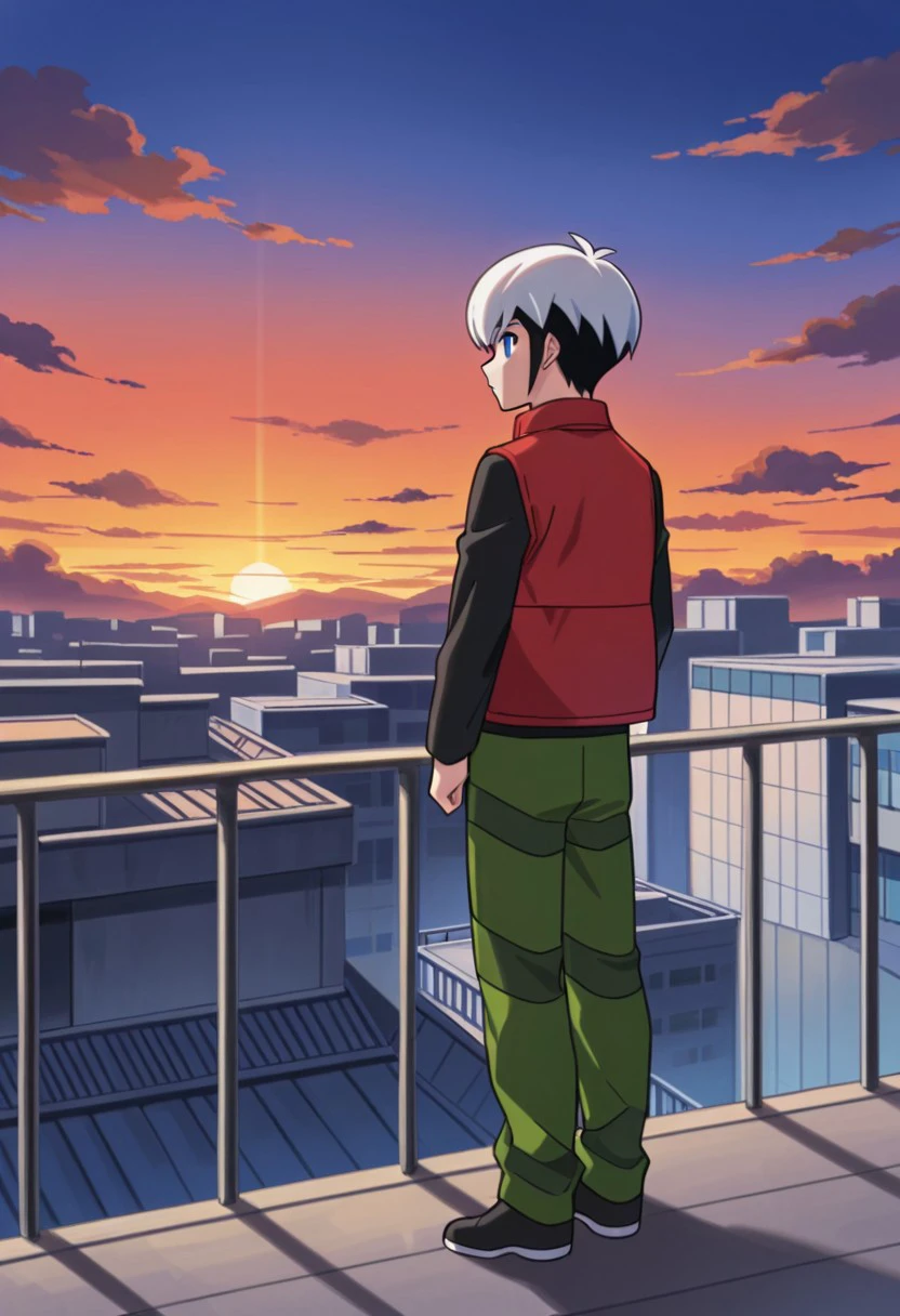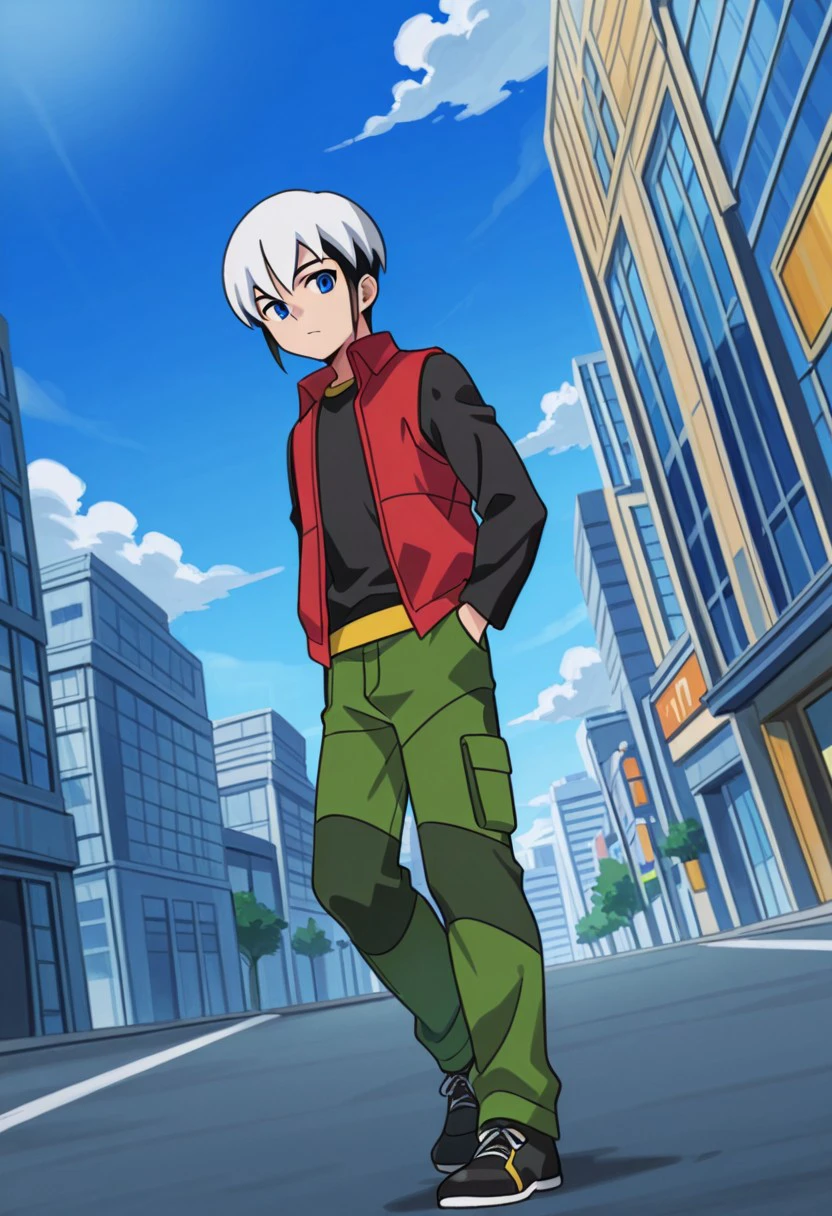 black shirt, red sleeveless jacket, green pants, black shoes