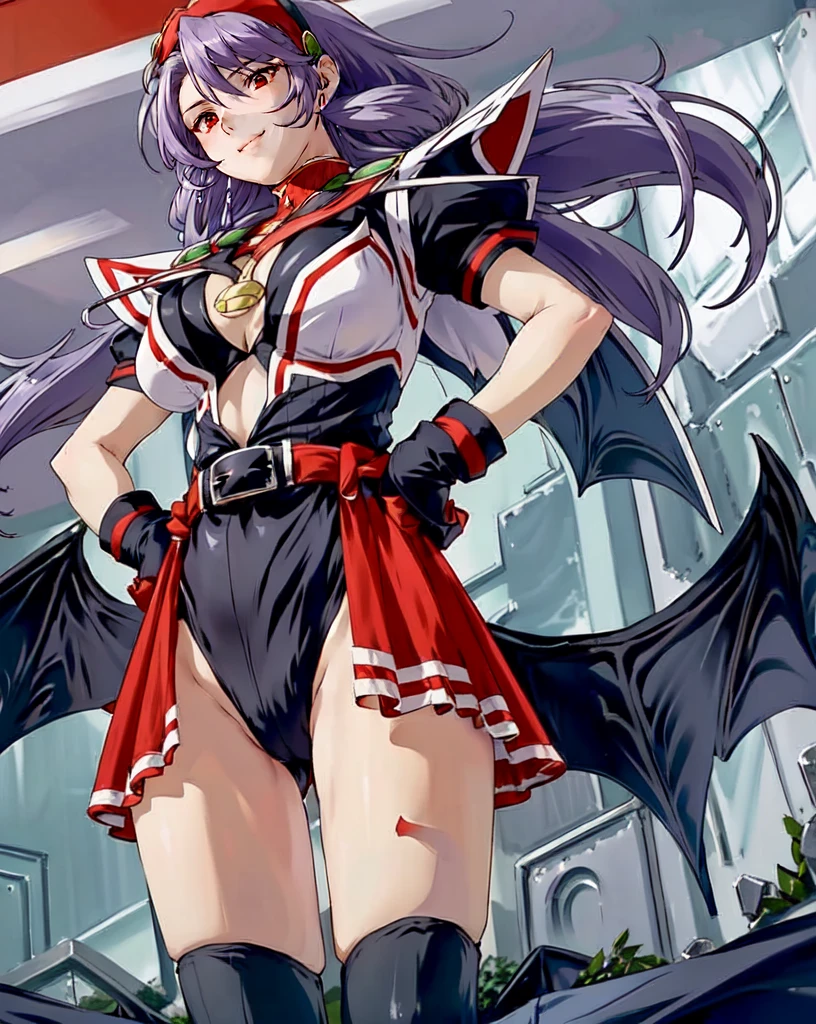 leotard,navel cutout,cleavage cutout,low wings,belt,red showgirl skirt,red gloves,Septimpurple hair,red eyes,jewelry,hairband