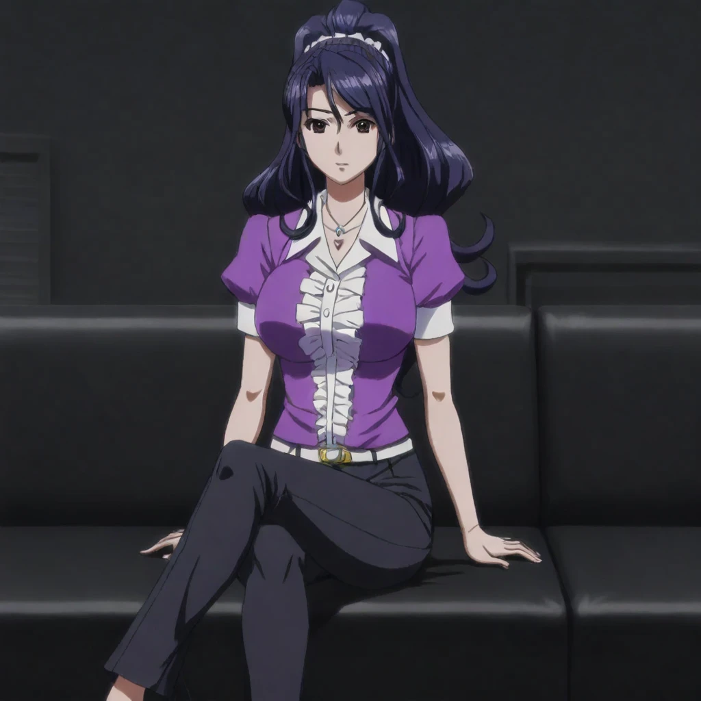 haruka seri \(aico incarnation\), dark purple hair, long hair, ponytail, sidelocks, brown eyes, necklace, jewelry, purple and white shirt, belt, armbands, pants, heels, large breasts, 1girl, solo
