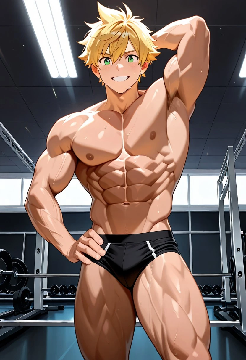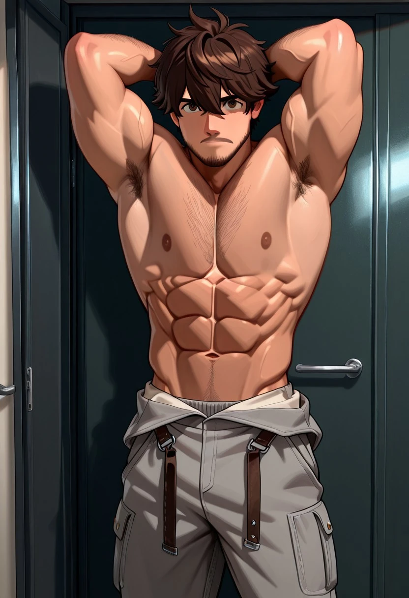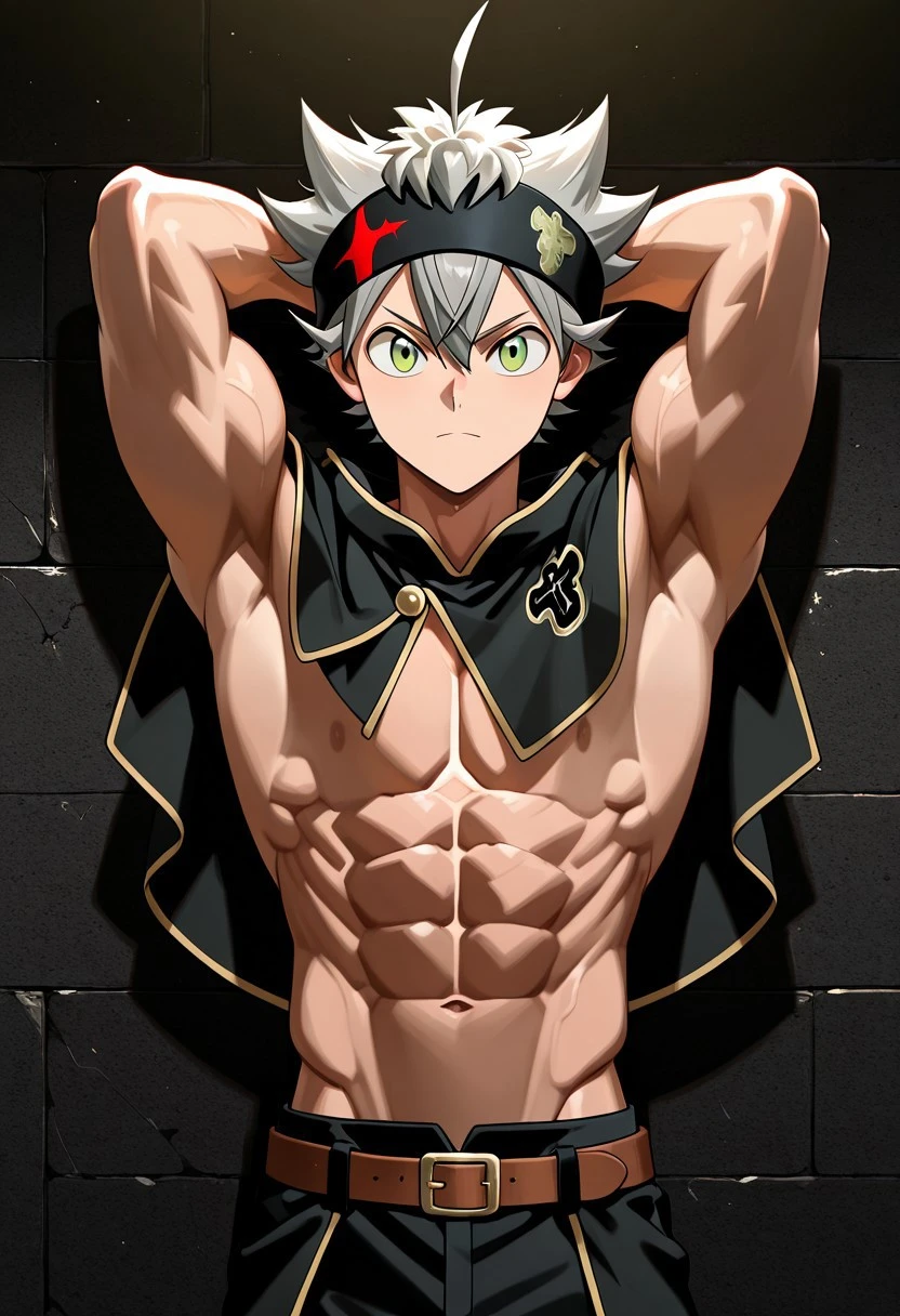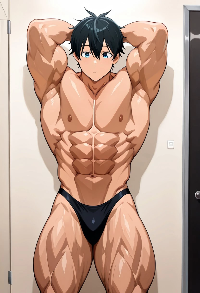 AbThigh Pose, hands behind head, abs, thighs, biceps, pecs, muscular