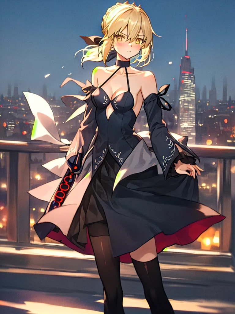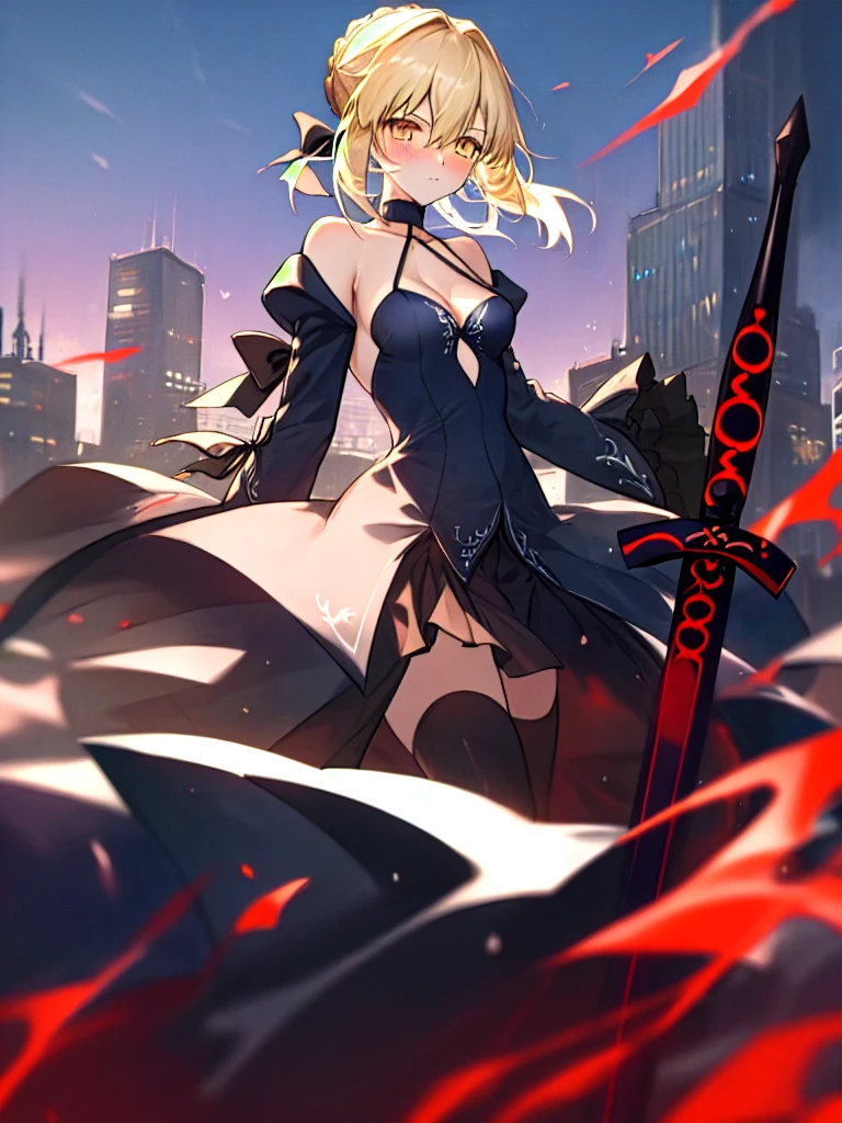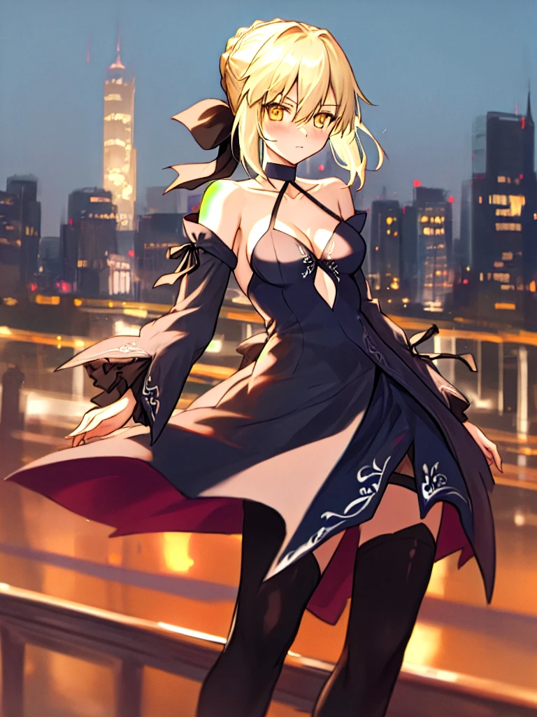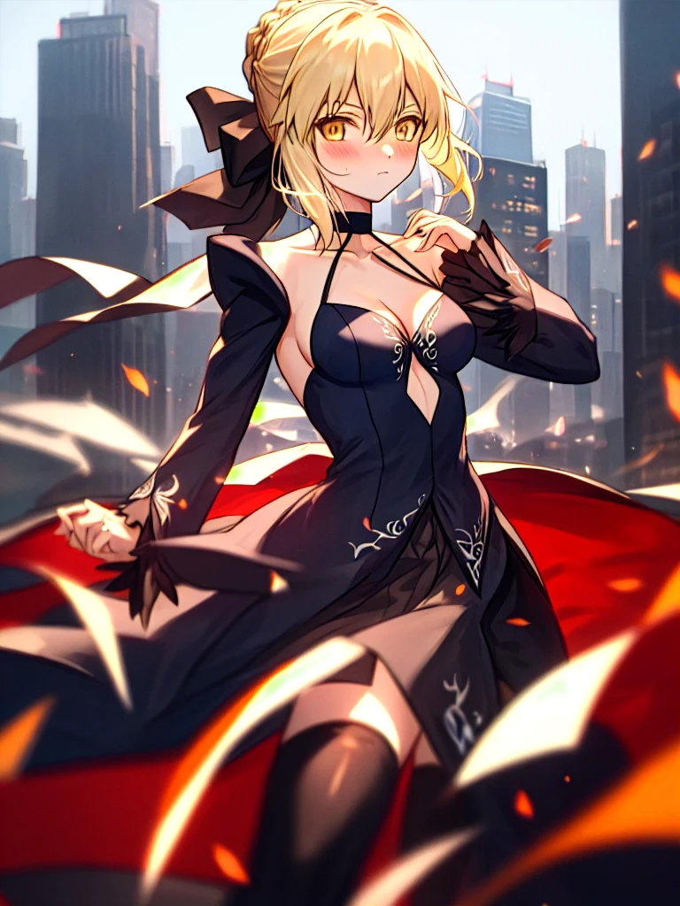 1girl,artoria pendragon (fate),blonde hair,yellow eyes,saber alter,solo,looking at viewer,braid,ribbon,medium breasts,cleavage,dress,hair ribbon,collarbone,sidelocks,hair between eyes,bare shoulders,black ribbon,long sleeves,closed mouth,black dress,french braid,excalibur morgan (fate),blush,short hair,thighhighs,choker,hair bun,single hair bun,black thighhighs,city background