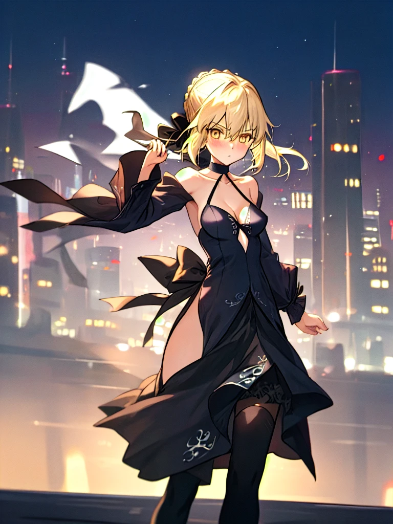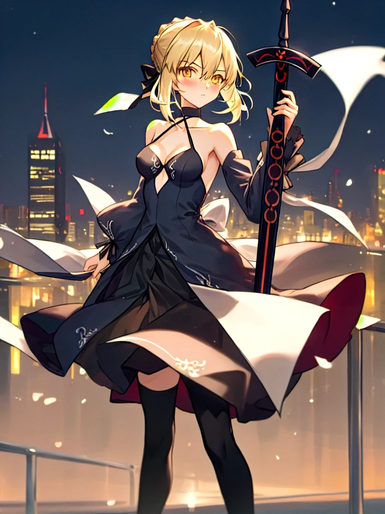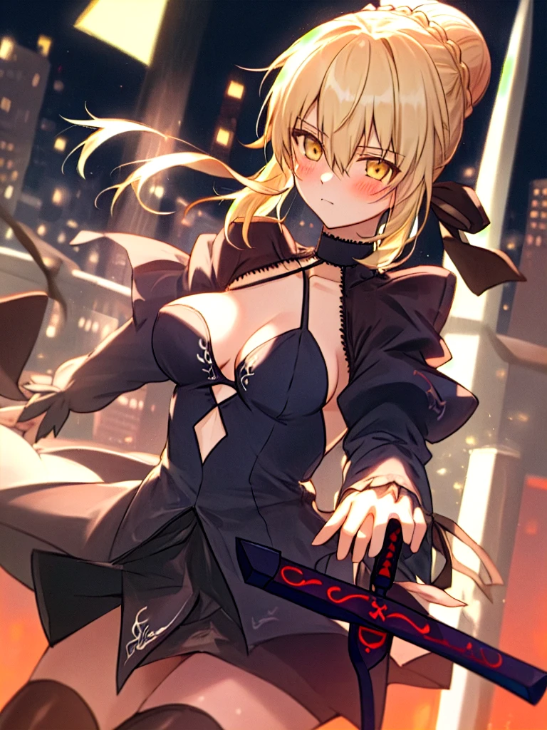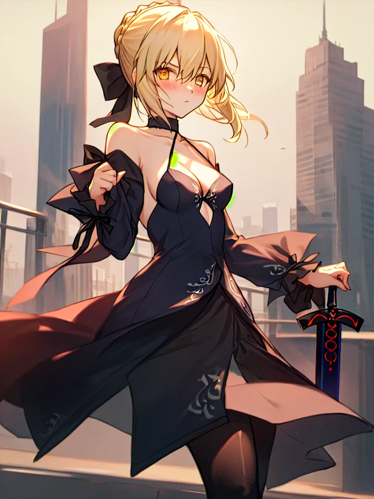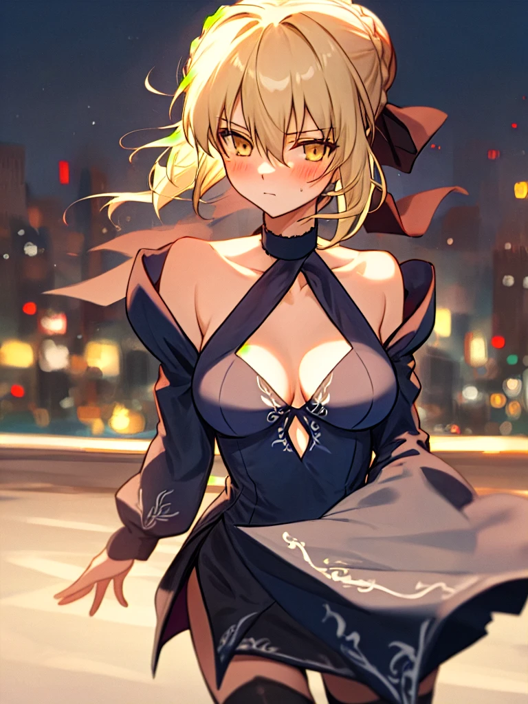 1girl,artoria pendragon (fate),blonde hair,yellow eyes,saber alter,solo,looking at viewer,braid,ribbon,medium breasts,cleavage,dress,hair ribbon,collarbone,sidelocks,hair between eyes,bare shoulders,black ribbon,long sleeves,closed mouth,black dress,french braid,excalibur morgan (fate),blush,short hair,thighhighs,choker,hair bun,single hair bun,black thighhighs,city background