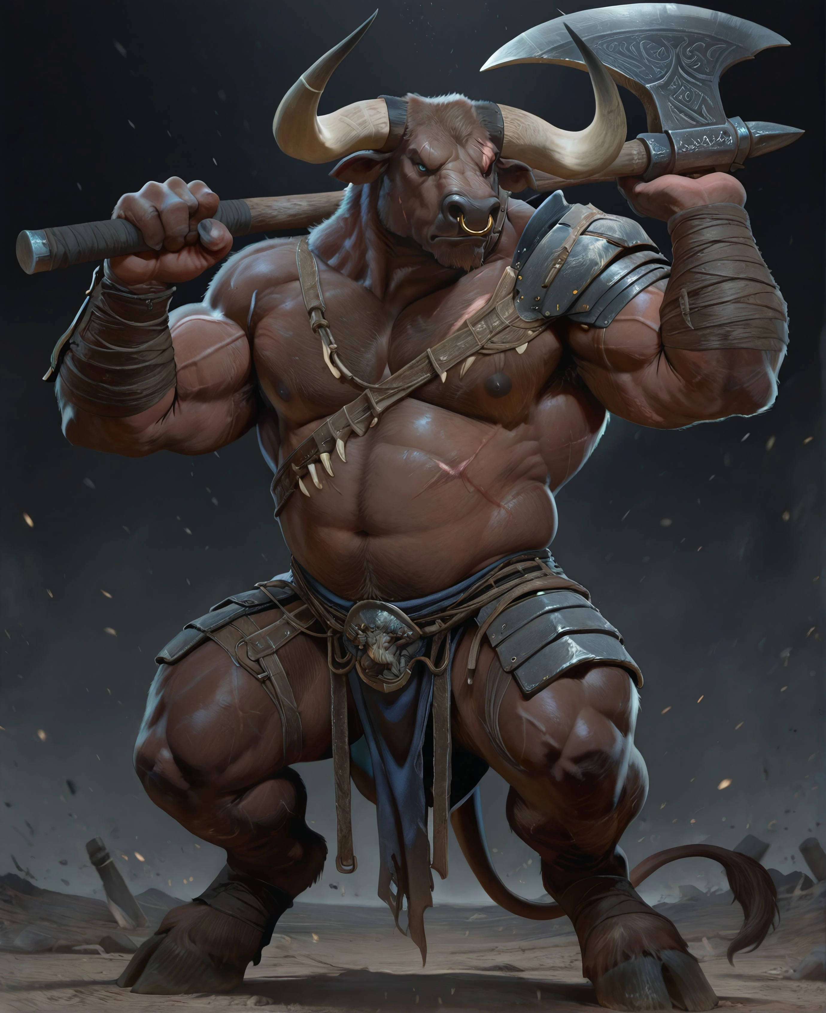This is sorta my personal take on Minotaurs. Most models do a pretty good job but a lot of models are trained on furry bovine characters, which I was hoping this would lean more to a 'monster/animalistic' minotaur.