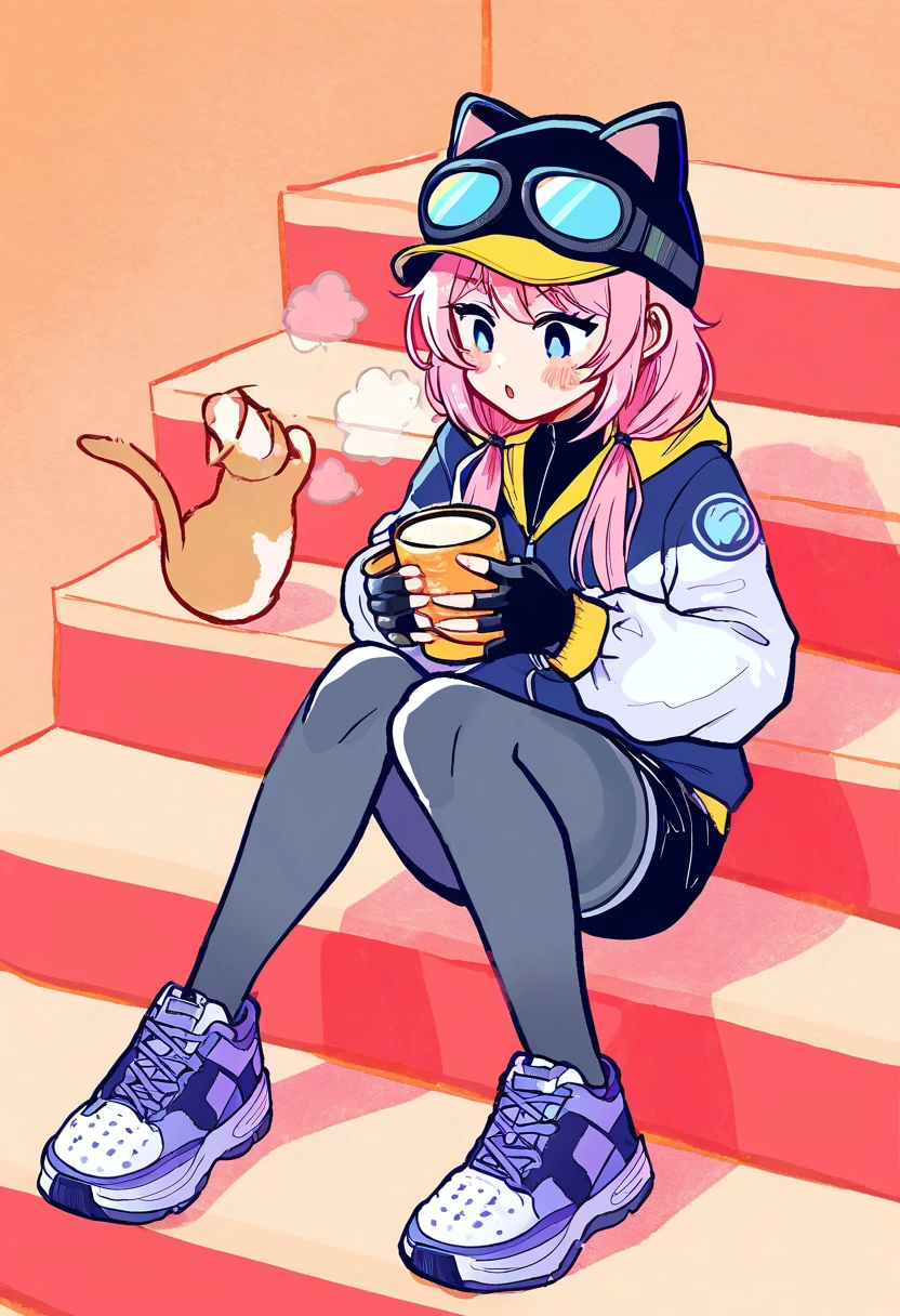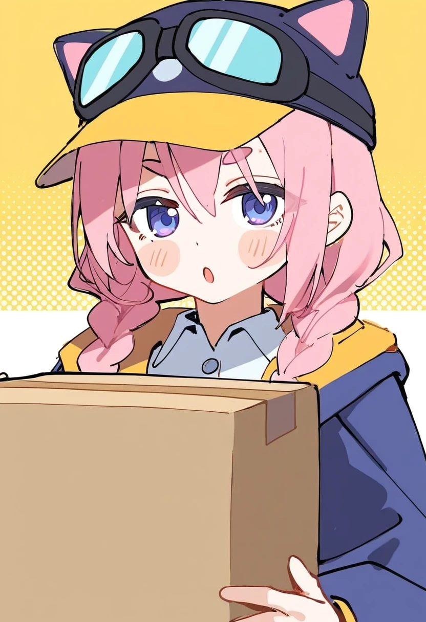 1girl,steam delivery girl,hat,pink hair,blue eyes,gloves,backpack,bag,baseball cap,goggles,fingerless gloves,jacket,braid,black gloves,cat hat,twin braids,goggles on headwear,zipper,animal ears,long sleeves,zipper pull tab,shirt,cat ears,collared shirt,white shirt,long hair,small breasts,可选添加nemupan作为官方画风(效果不佳)