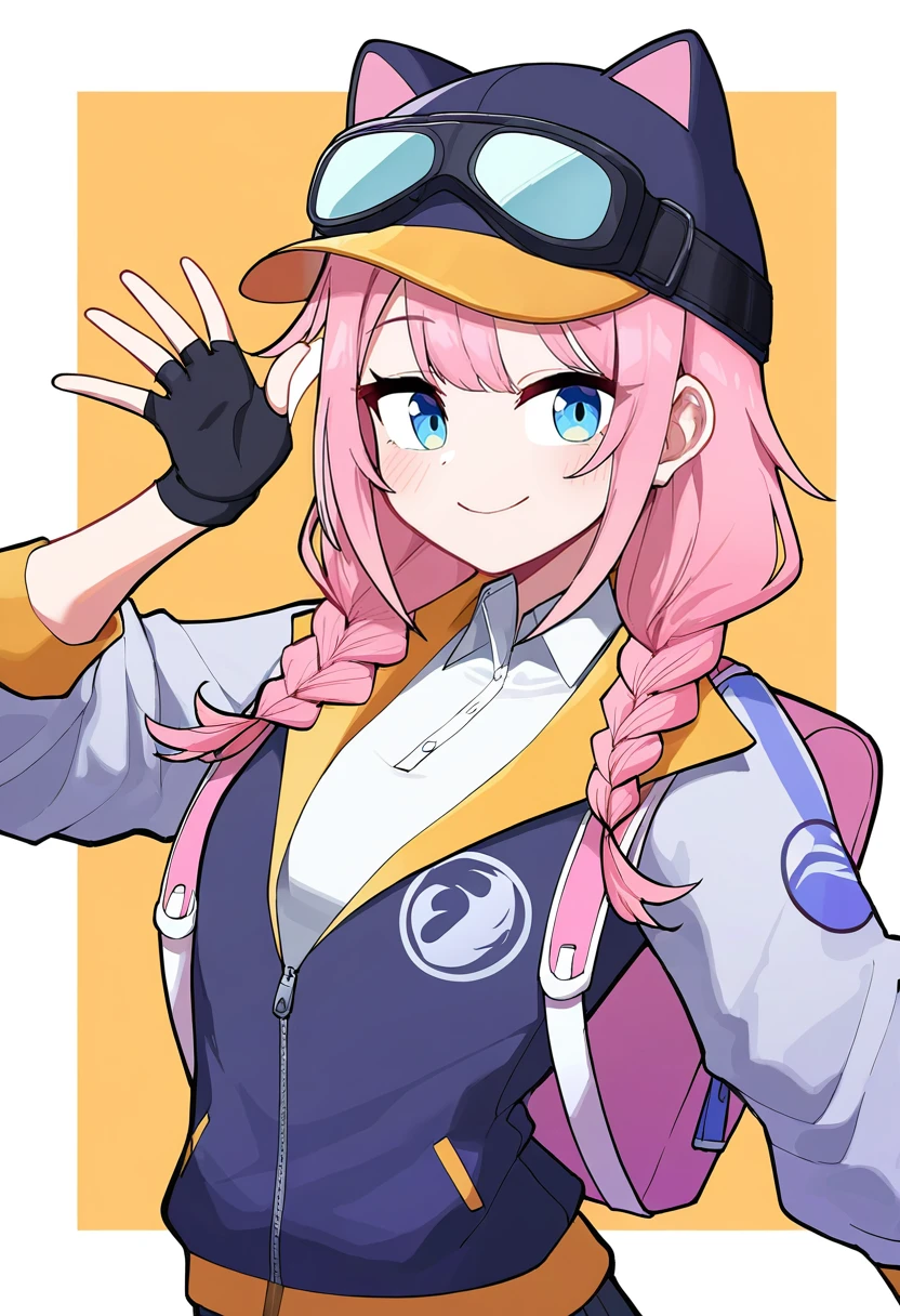 1girl,steam delivery girl,hat,pink hair,blue eyes,gloves,backpack,bag,baseball cap,goggles,fingerless gloves,jacket,braid,black gloves,cat hat,twin braids,goggles on headwear,zipper,animal ears,long sleeves,zipper pull tab,shirt,cat ears,collared shirt,white shirt,long hair,small breasts,