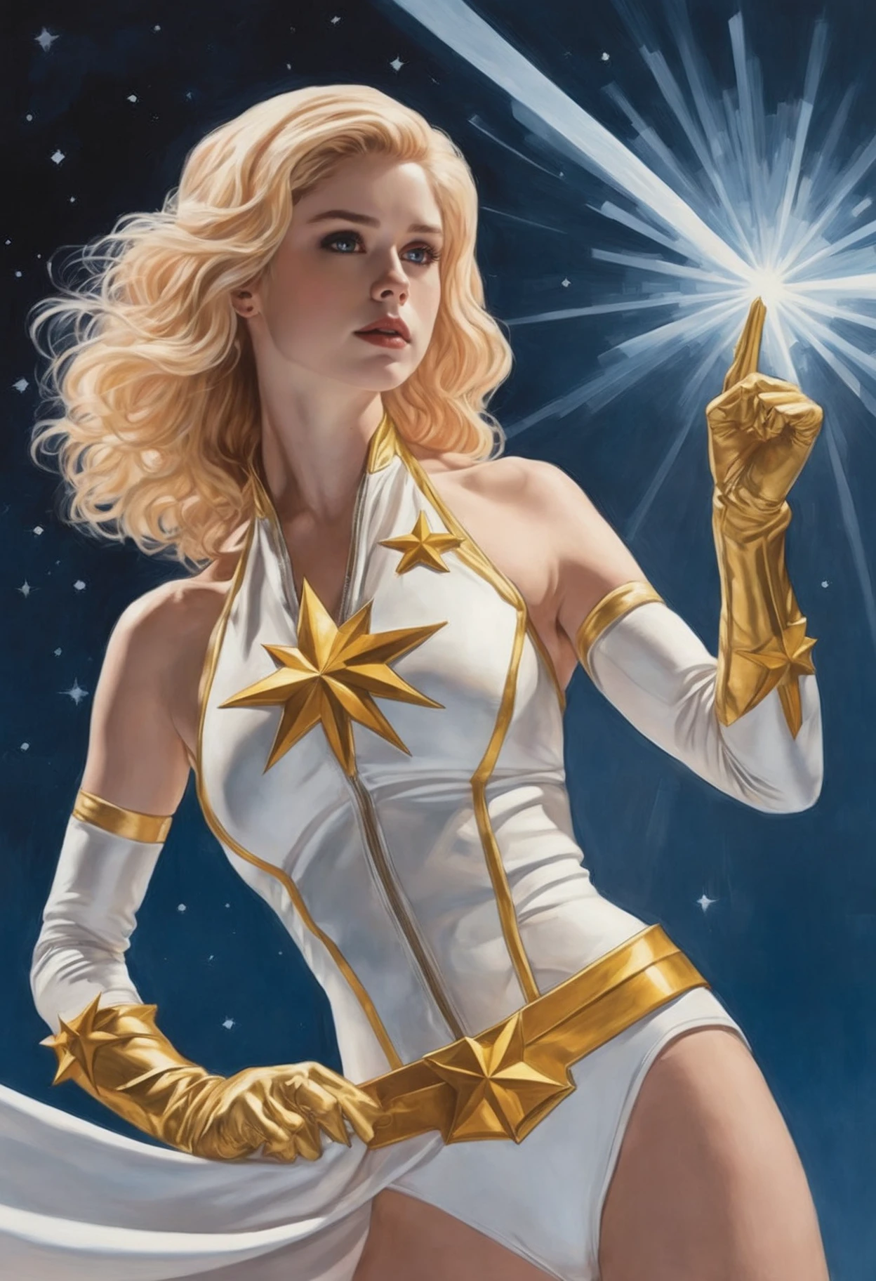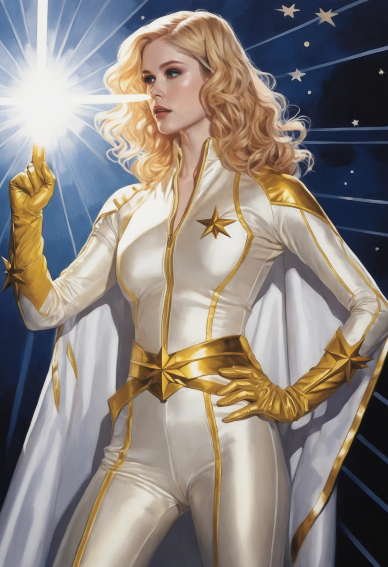 Erin Moriarty who plays Starlight in The Boys. Images used were from around 2016-2019. Use erin_moriarty to generate Erin, add starlight_costume to generate her dressed in her Starlight costume from the show.
