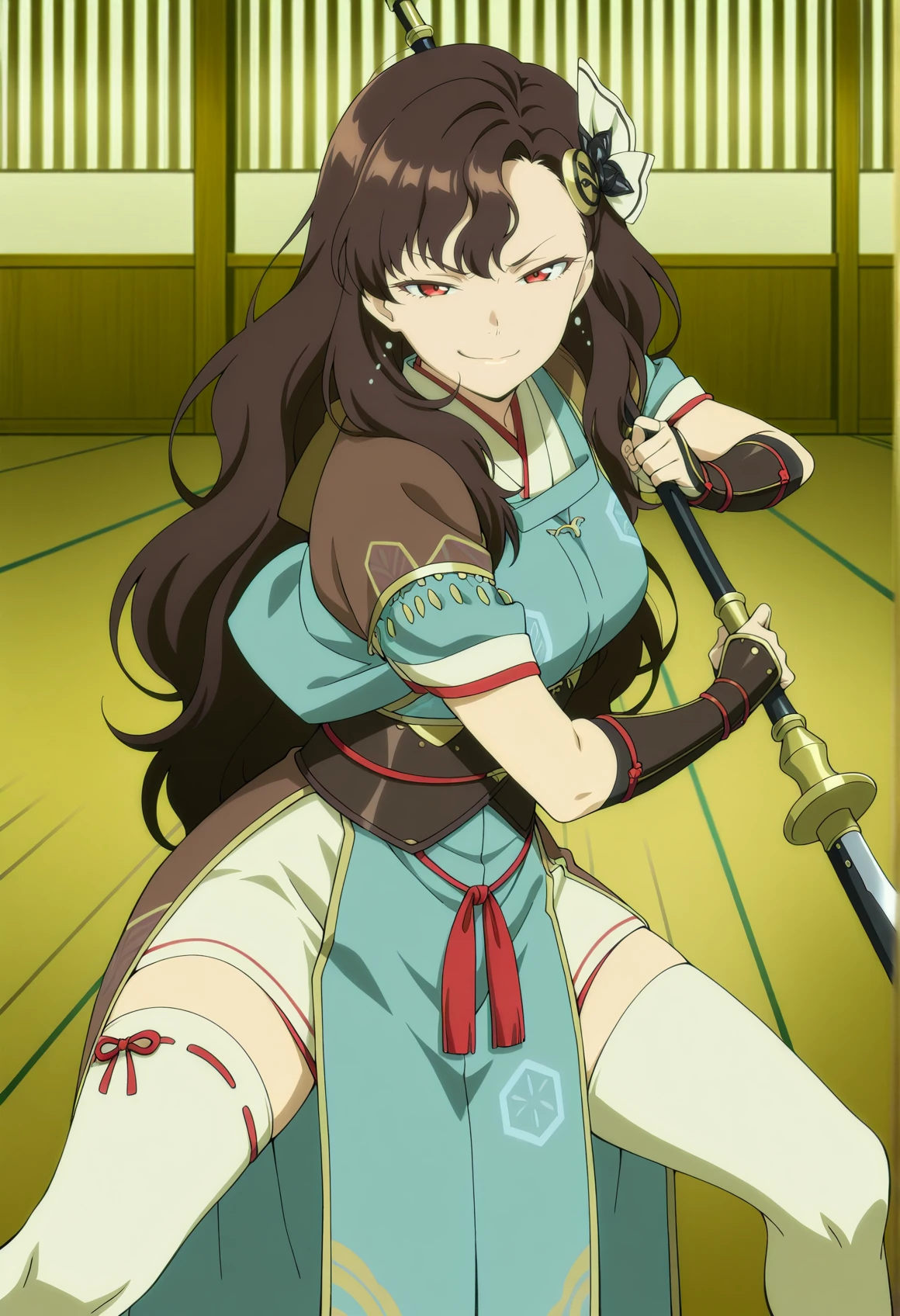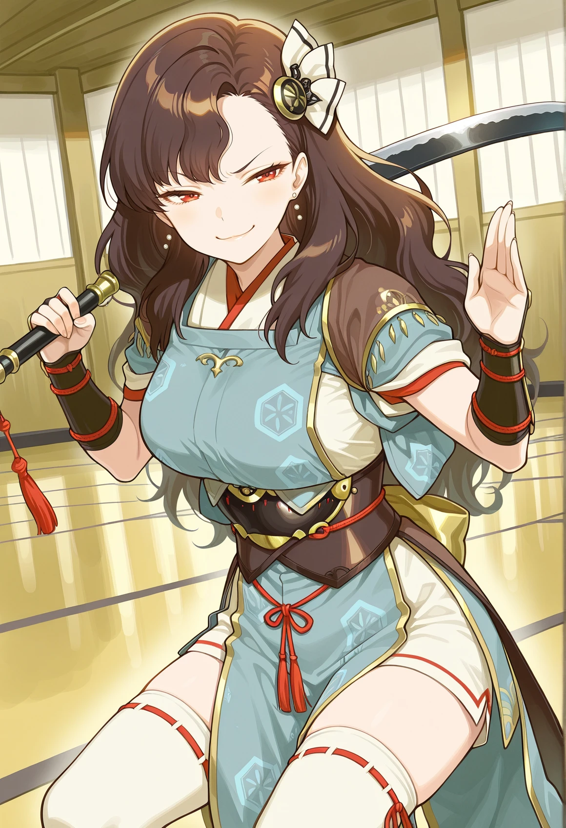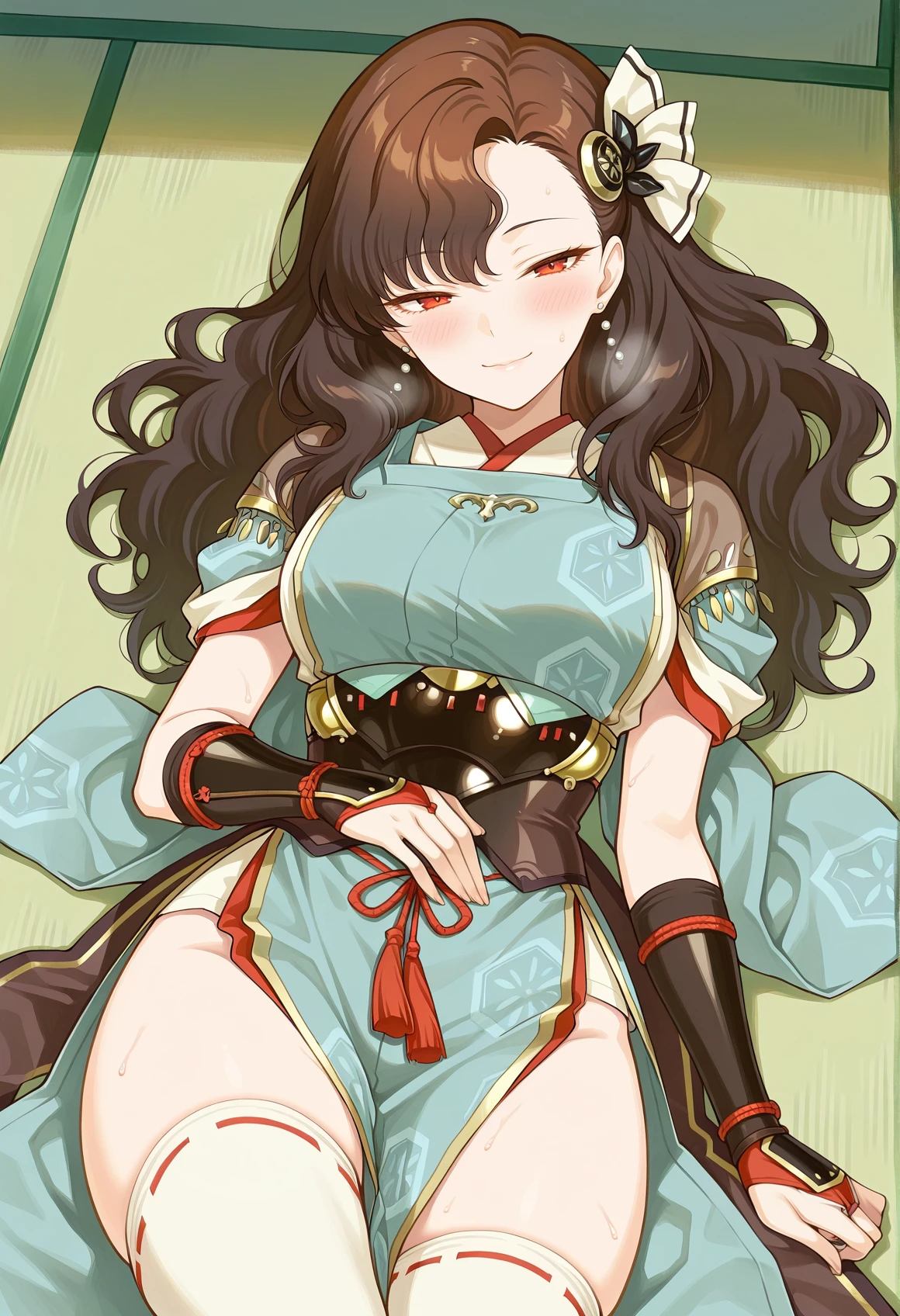 Notable tags: brown hair, long hair, curly hair, earrings, red eyes, hair ornament, japanese clothes, short sleeves, gauntlets, side slit, thighhighs