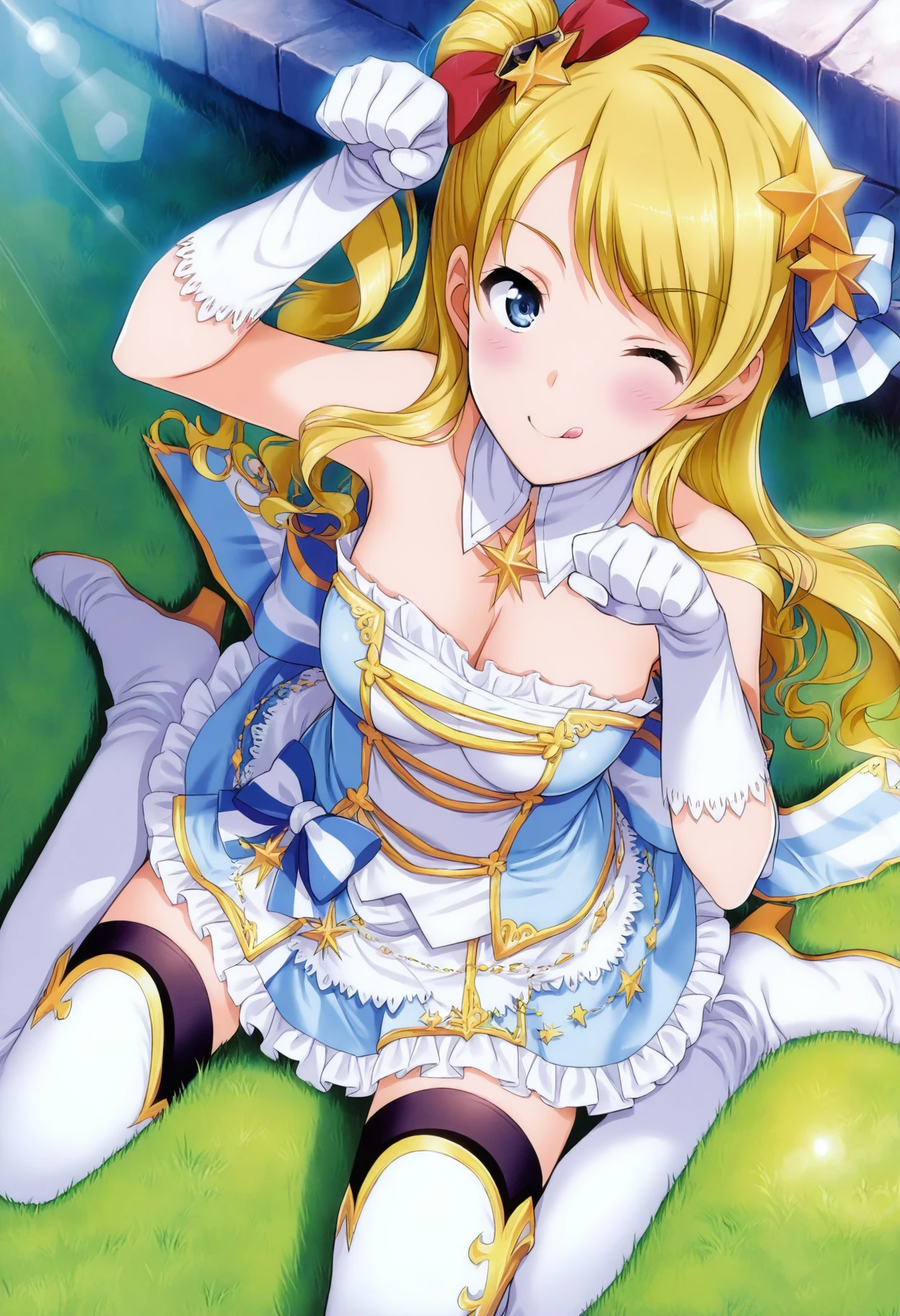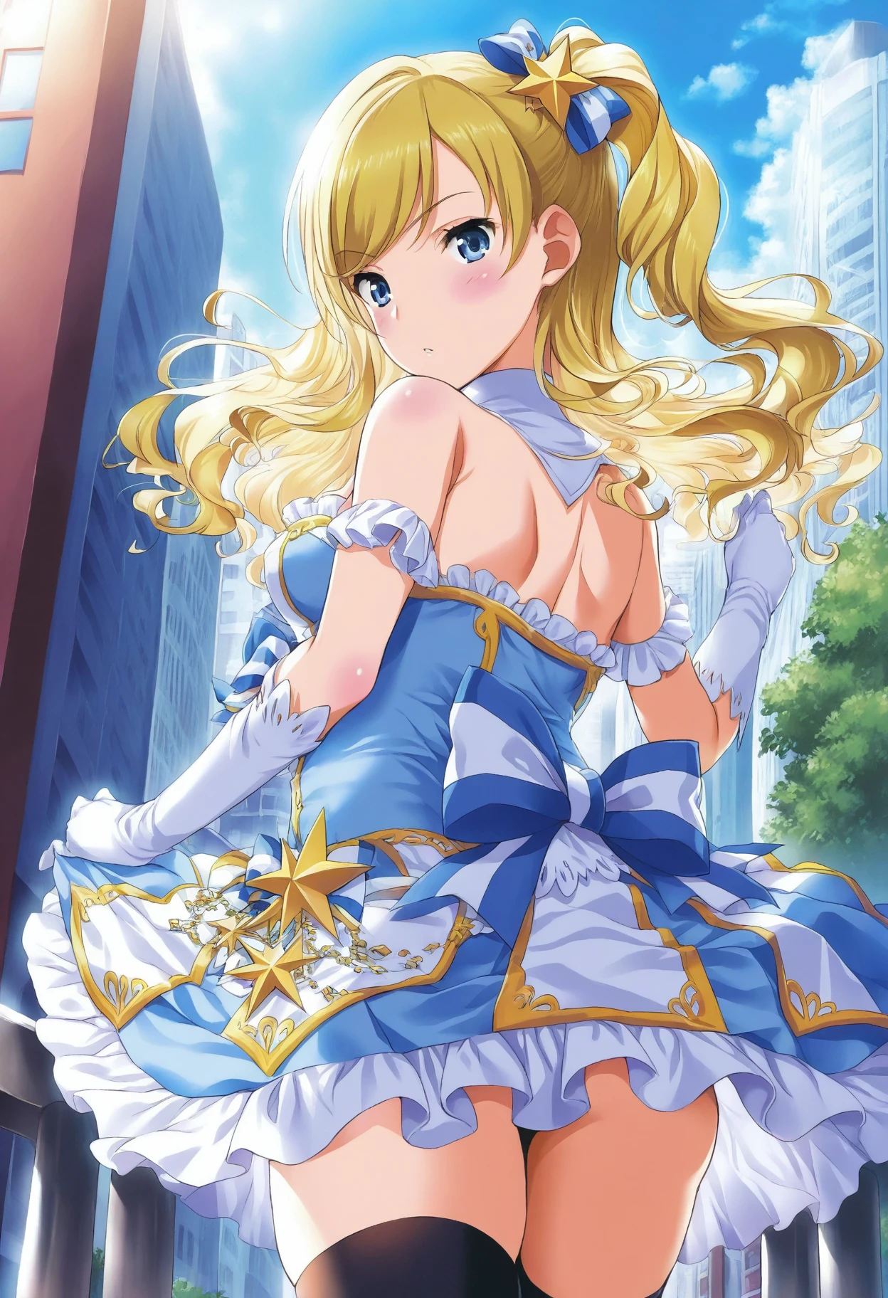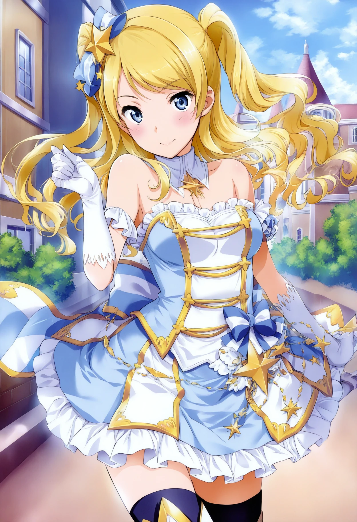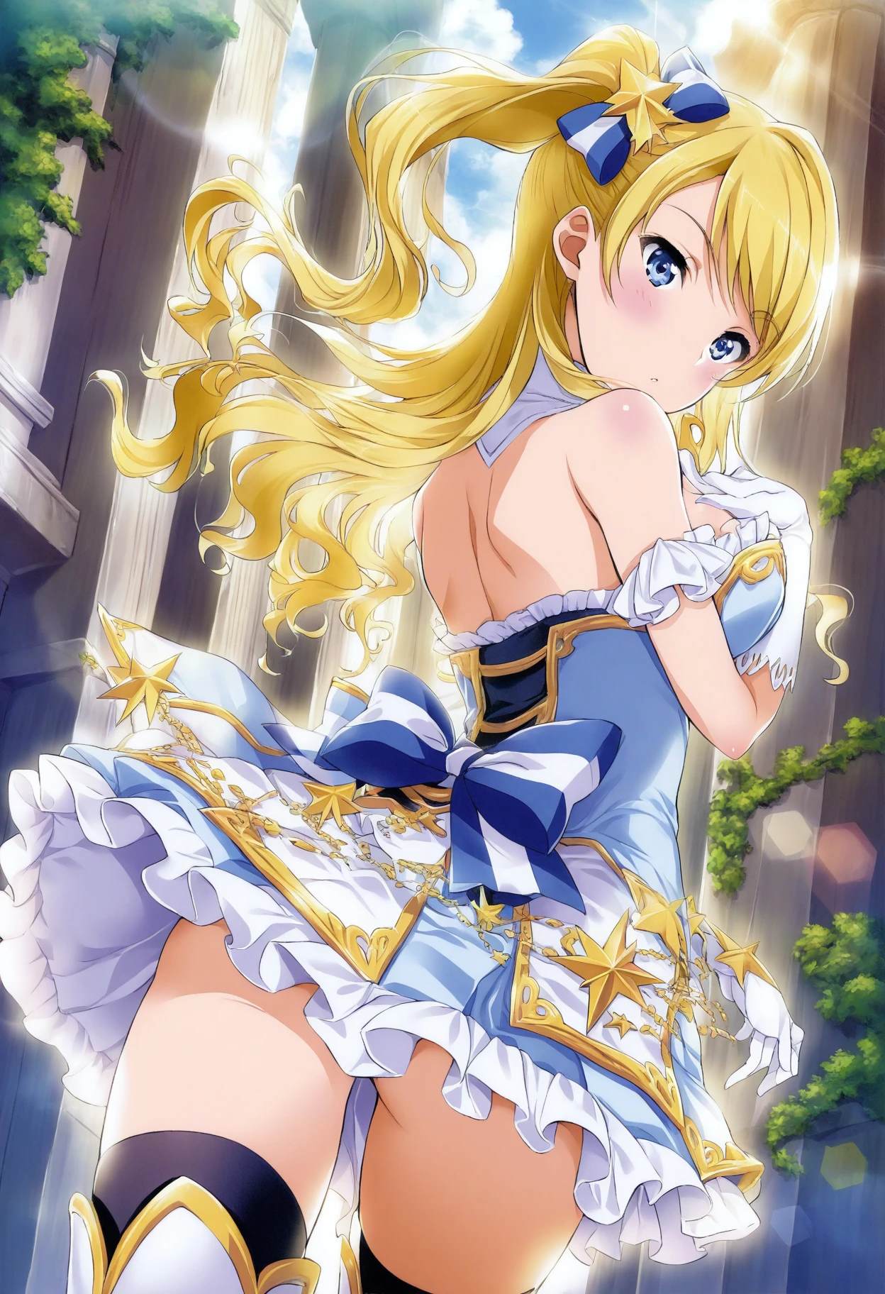 Clothing: star hair ornament, blue dress, detached collar, elbow gloves, blue bow, thigh boots,