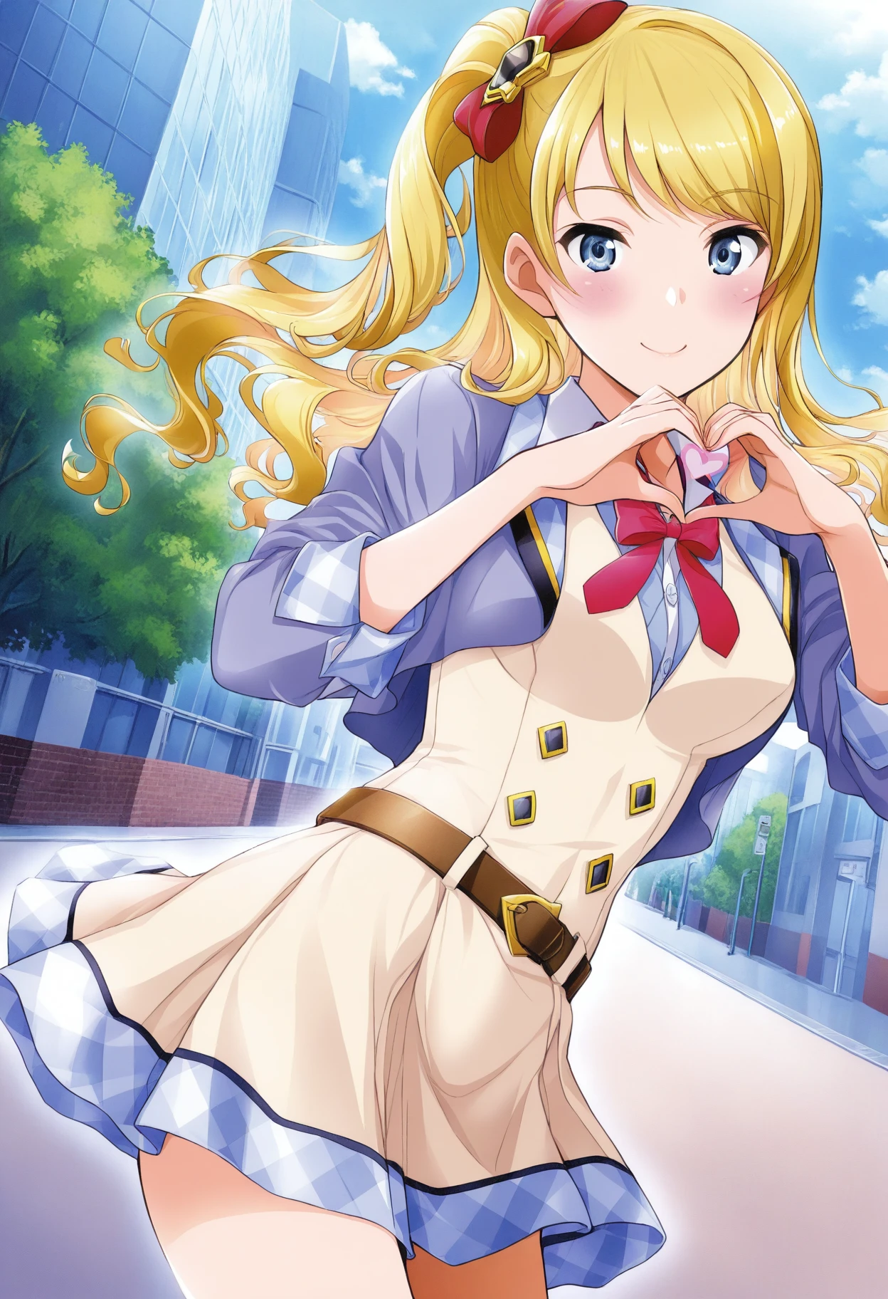 c-fran, long hair, blonde hair, blue eyes, one side up, hair bow, collared shirt, red bowtie, beige short dress, brown belt, blue cropped jacket, long sleeves,
