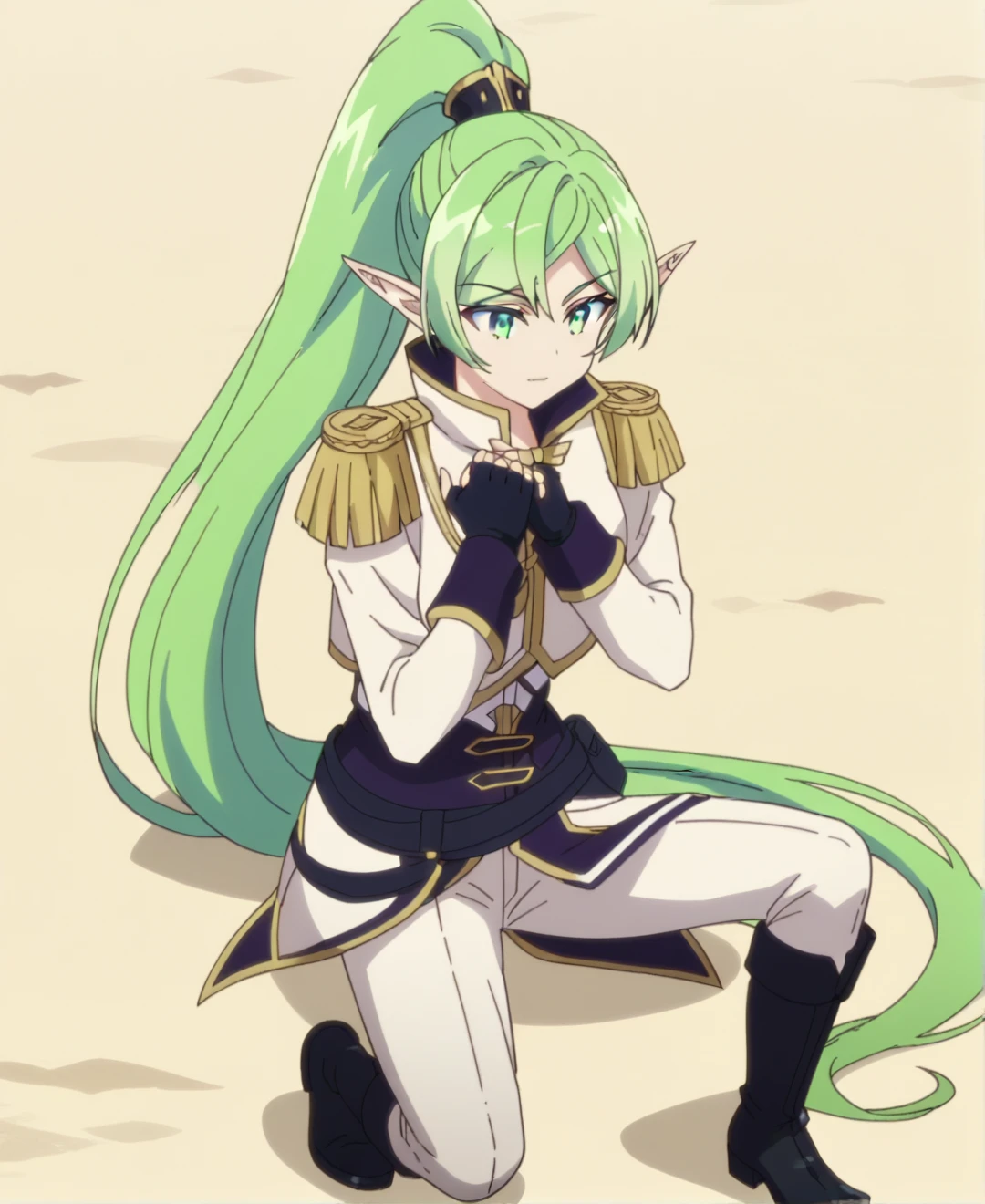 Tijuana, 1girl, long hair, pointy ears, elf, solo, green hair, very long hair, green eyes, ponytail, high ponytail,