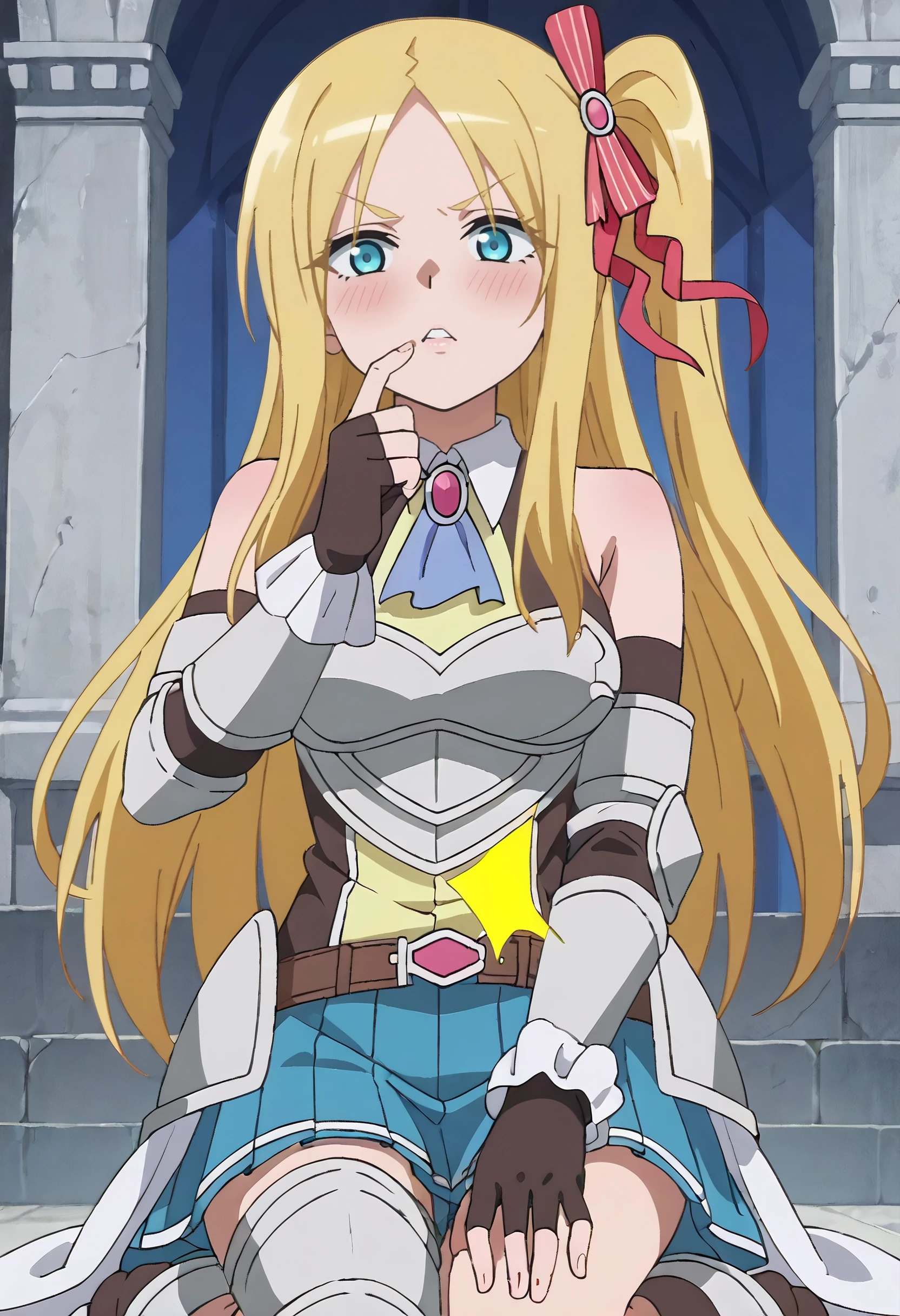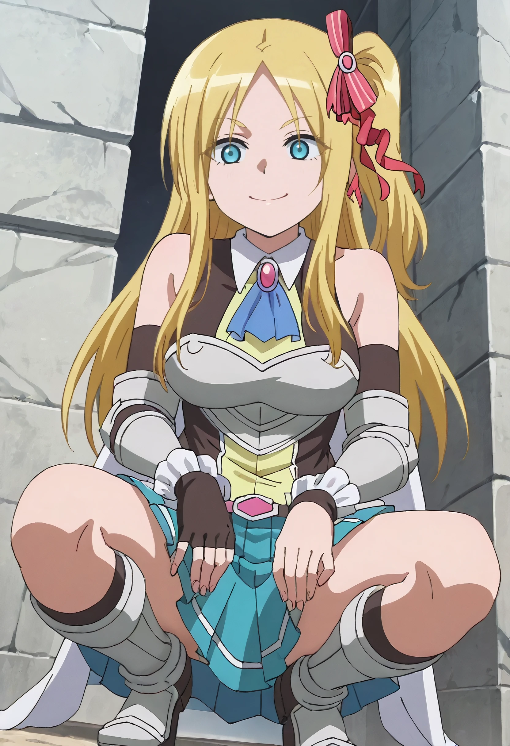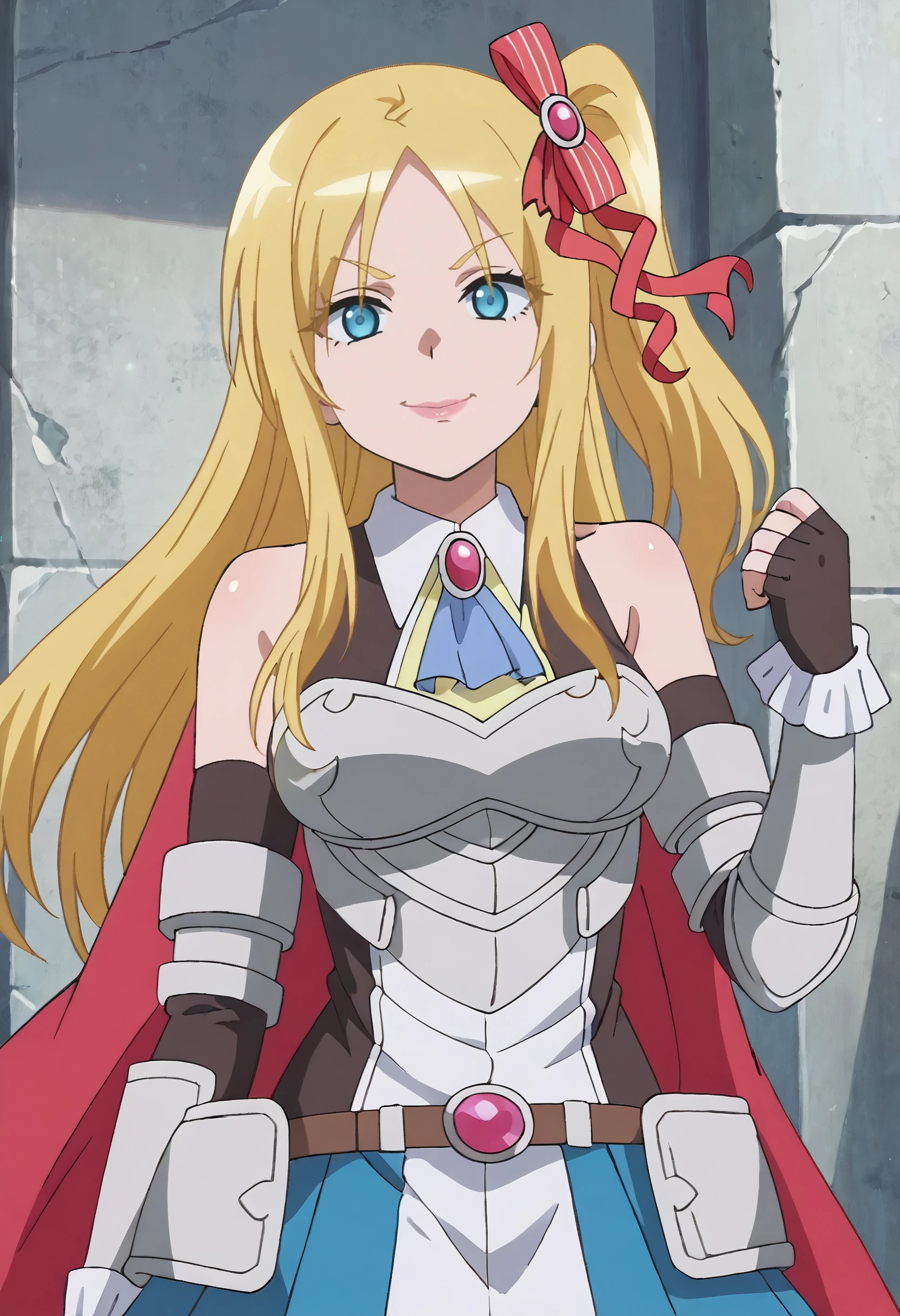GloriaOutfit, one side up, bare shoulders, armor, ribbon, gloves, hair ribbon, breastplate, bow, hair bow, ascot, black gloves, skirt, fingerless gloves, blue ascot, hair ornament, gauntlets, boobplate, armored dress, sleeveless, pleated skirt, brooch, red ribbon, elbow gloves, blue skirt, black shirt, shirt, striped bow, sleeveless shirt, armored boots, side ponytail, waist cape,