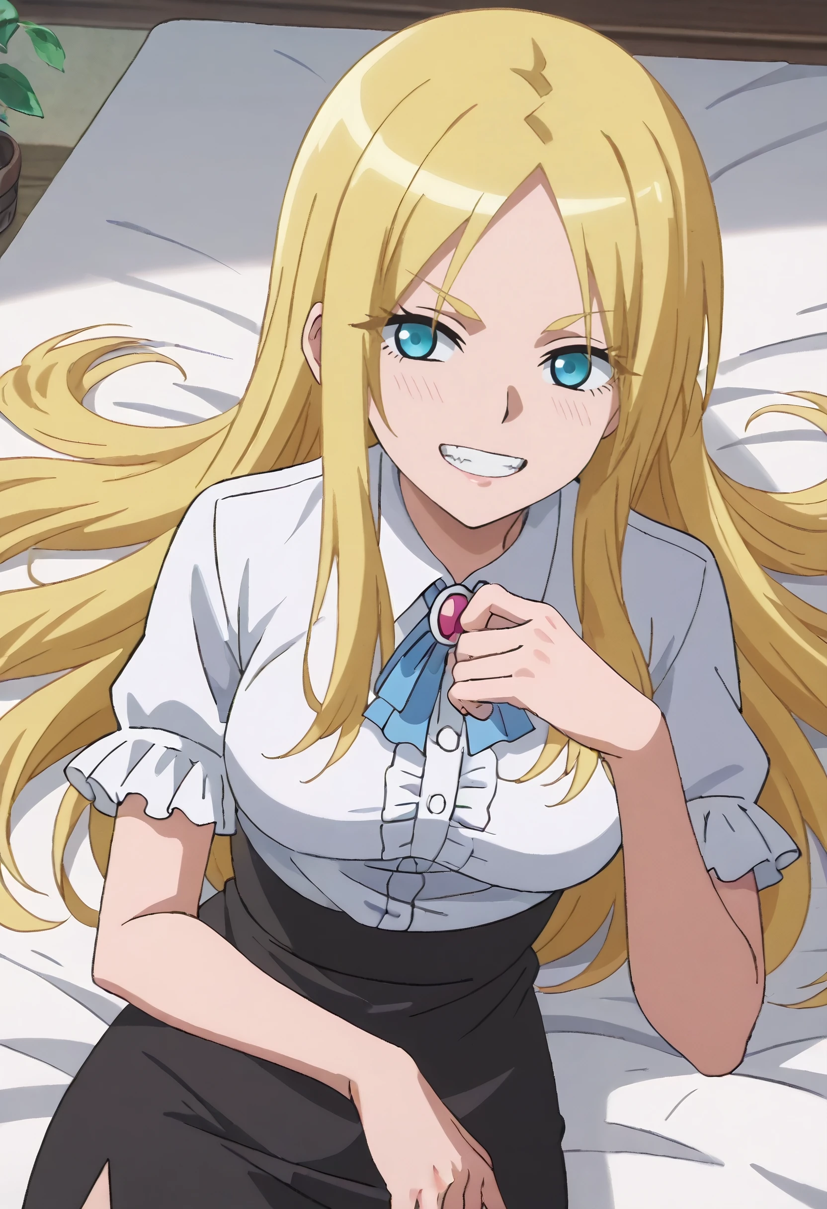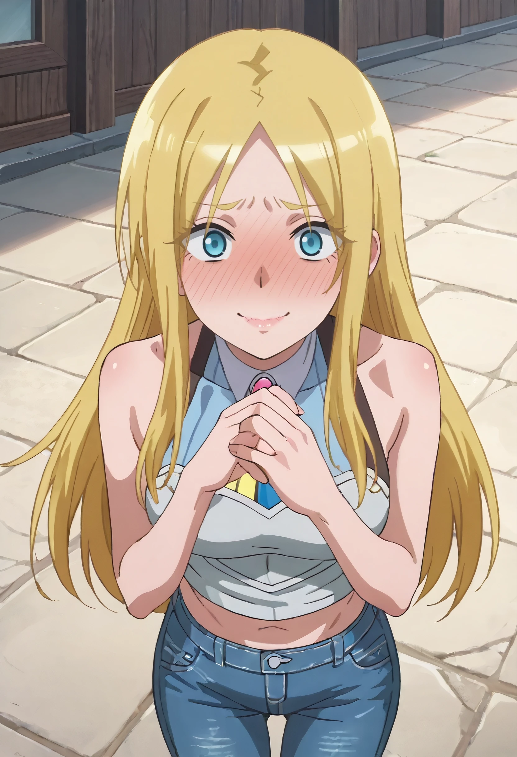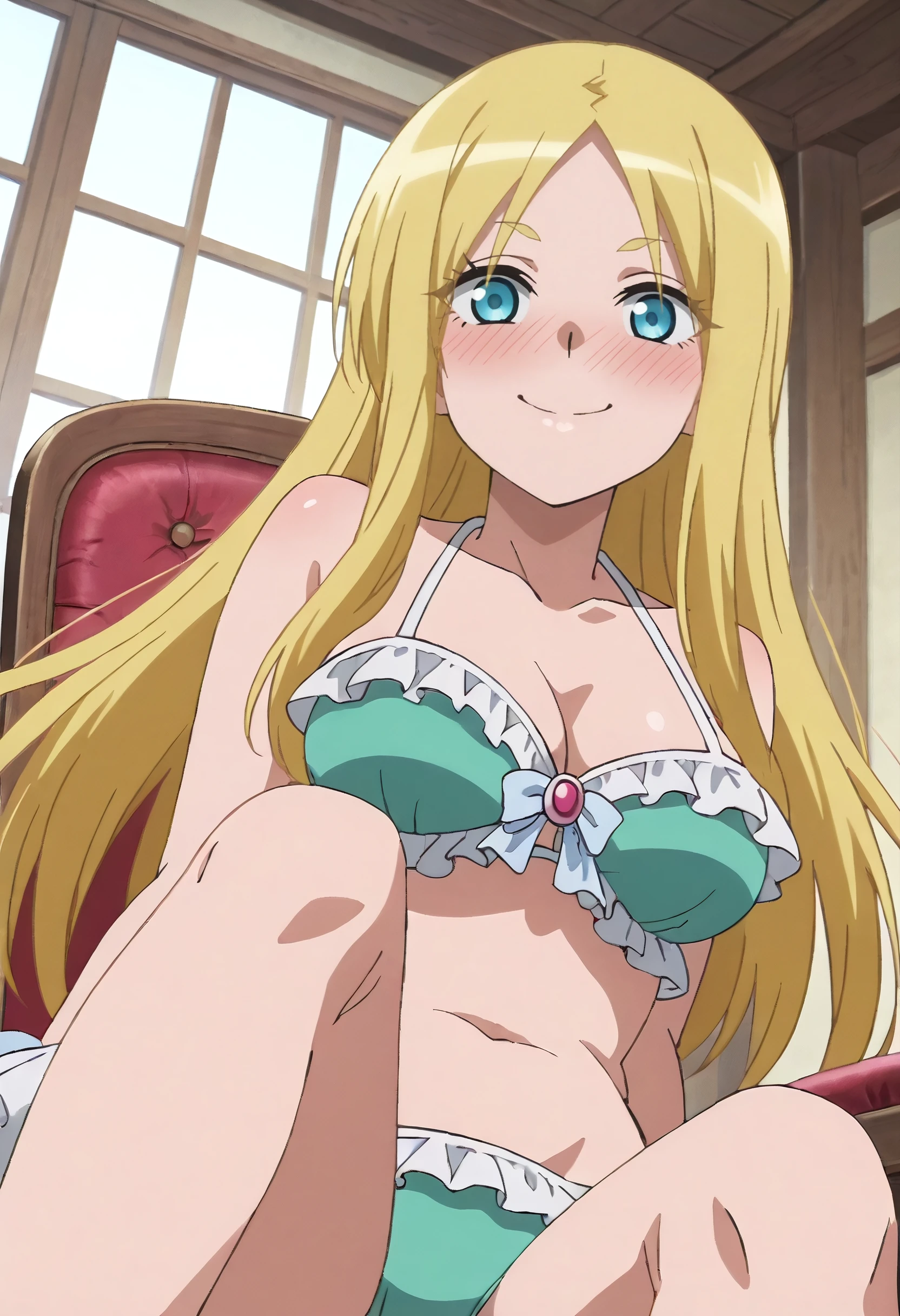 MOKGloria, blonde hair, long hair, blue eyes, parted bangs,