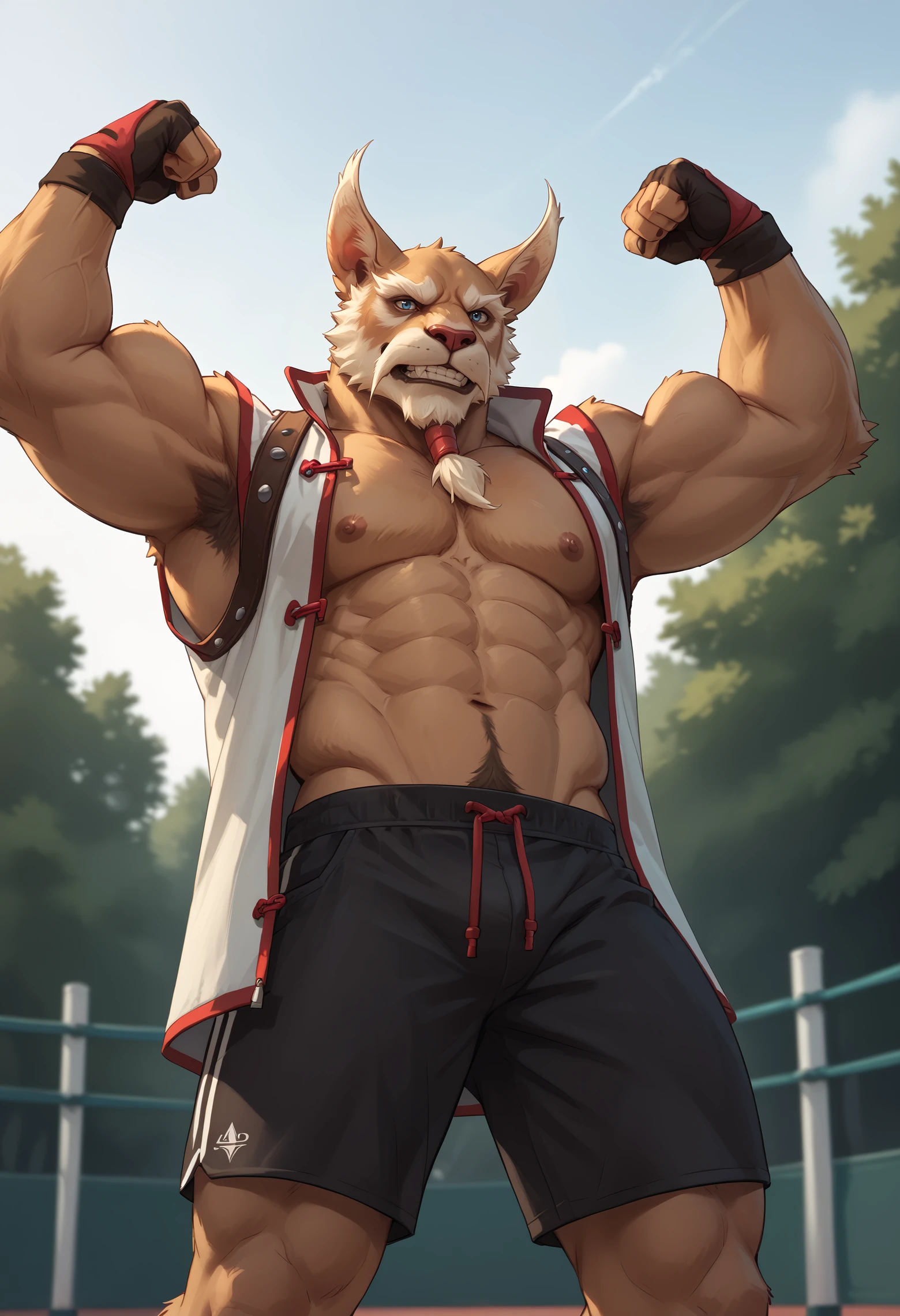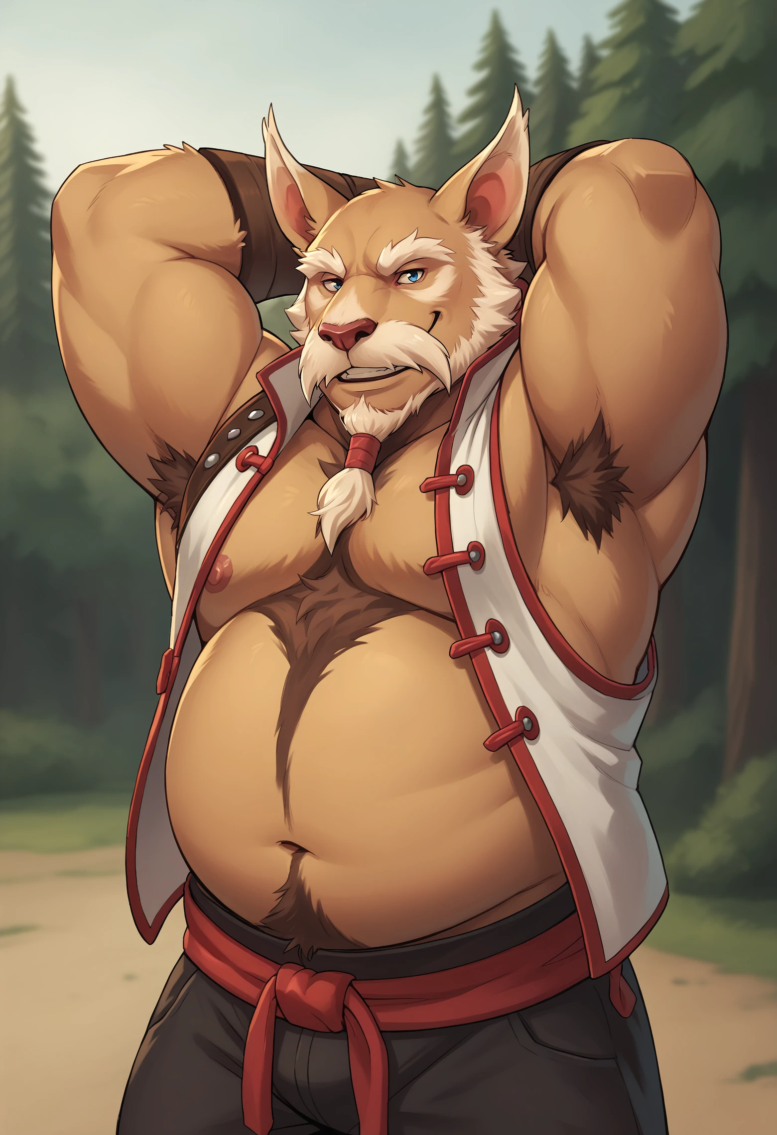 Reinforcement tags: brown fur, belly, beard, fat, blue eyes, musclegut, large pectorals, thick thighs
