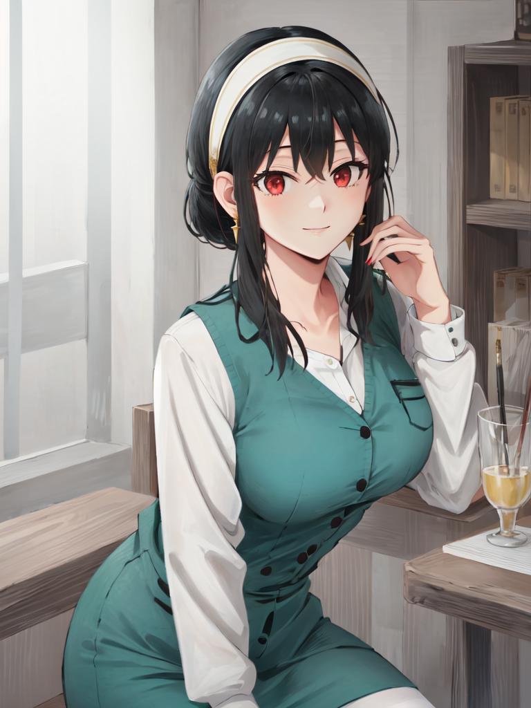 yor briar, <lora:yor:0.7:NP> 1girl, black hair sideburns updo red eyes, medium breasts, bangs, gold earrings smile :> { white open-collared shirt, turquoise vest, turquoise Pencil Skirt, office | long length red sweater_dress, off shoulder, long sleeves collarbone cleavage, dining room }, black pantyhose, white hairband