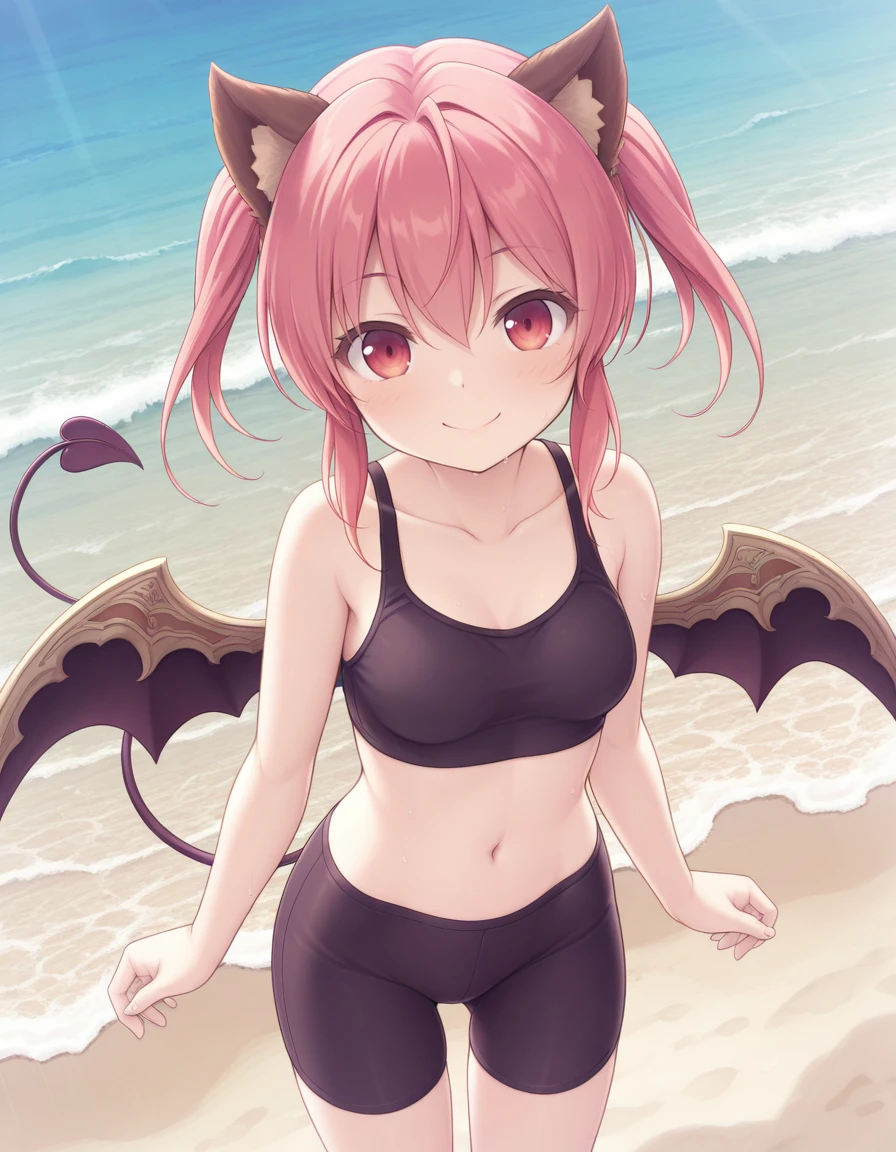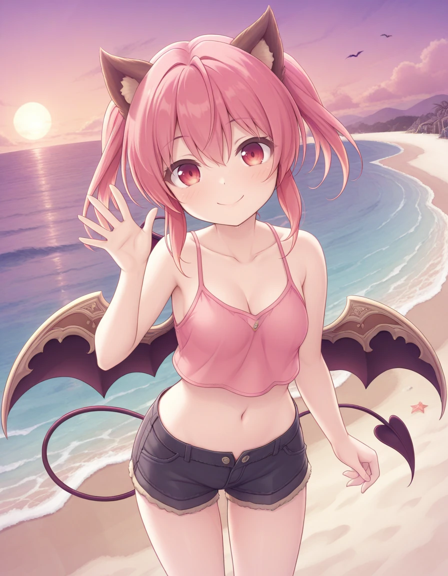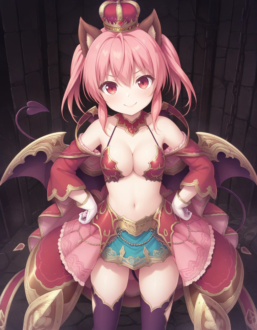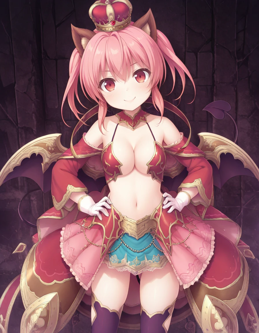 I just woke up so I won't ramble on. The model works well enough, tags such as animal ears, pink hair, tail, wings, red eyes, demon tail, demon wings, twintails,cown, gloves, thighhighs, skirt, bareshoulders, cleavage, and the trigger word usually makes an accurate depiction. View from behind is a little bit weird. I tried.