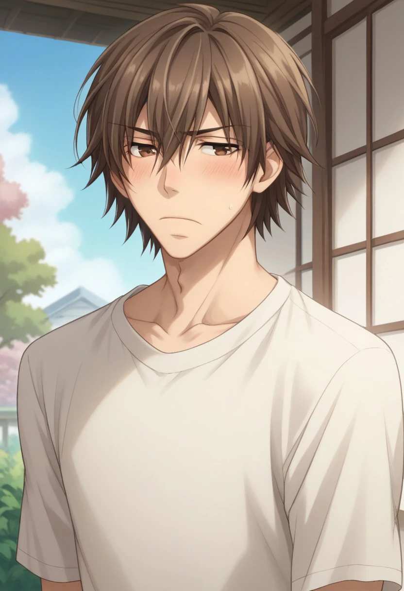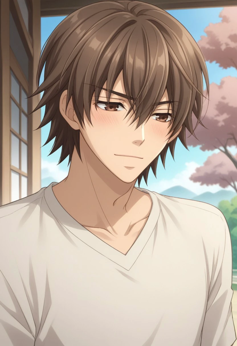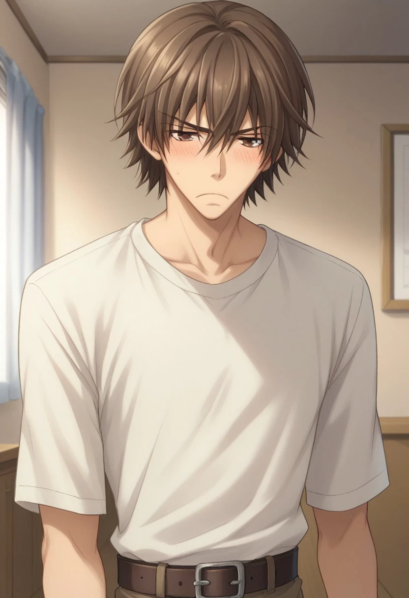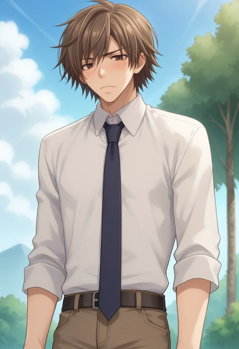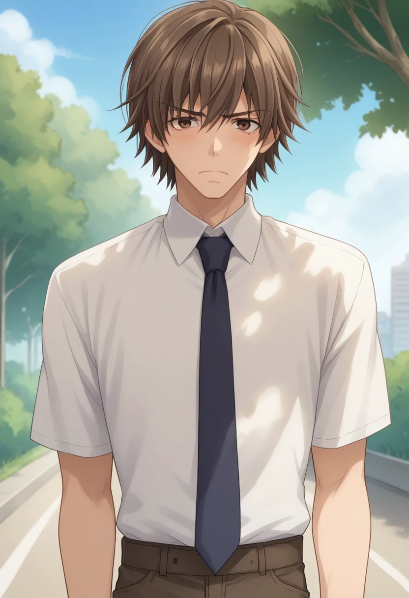 hiroki, 1boy, male focus, brown hair, necktie, brown eyes, shirt, white shirt, collared shirt, pants