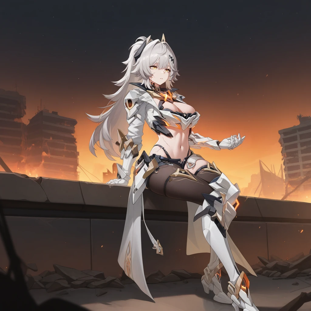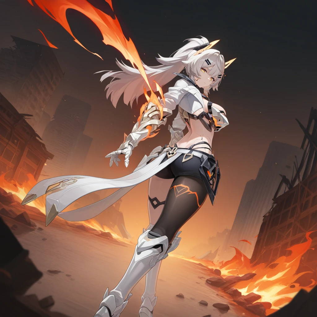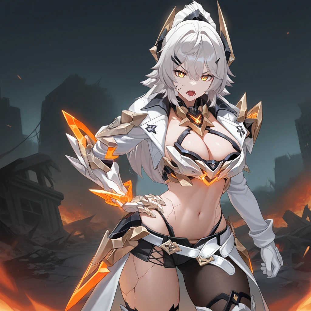 HeliaHi3, Hel_V83, grey hair, yellow eyes, long hair, white armor, halterneck, chest armor, armored bra, armor, cropped jacket, open jacket, white jacket, cleavage cutout, high collar, midriff, navel, panty strap, scar, hip armor, high ponytail, headgear, asymmetrical legwear, white sleeves, long sleeves, shoulder armor, cracked skin, armored gloves, white gloves, single gauntlet, armored collar, waist cape, orange trim, cross-laced shorts, black shorts, micro shorts, single leg pantyhose, black pantyhose, loose belt, open belt, white belt, multiple belts, armored boots, white footwear, knee boots, knee pads, hairclip,