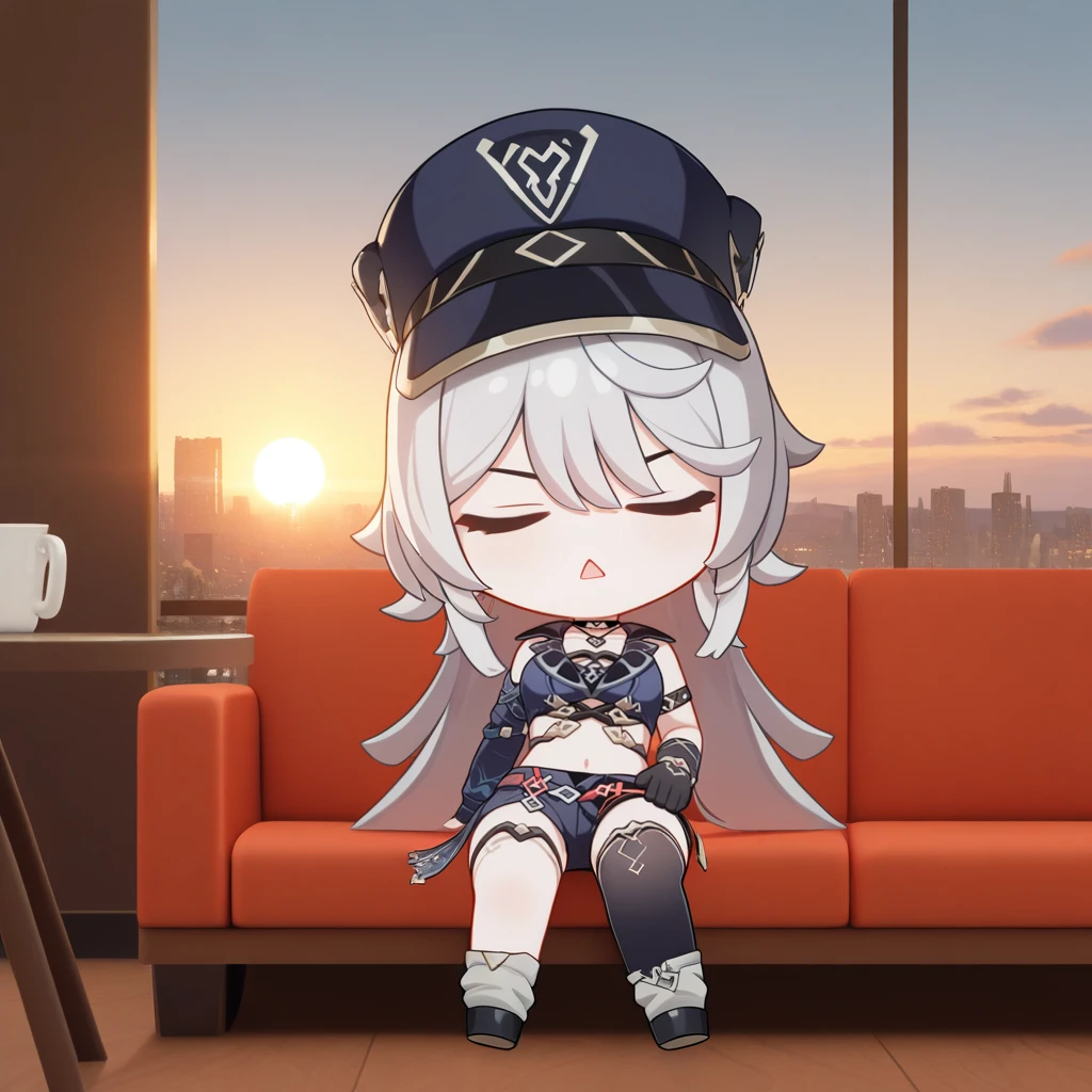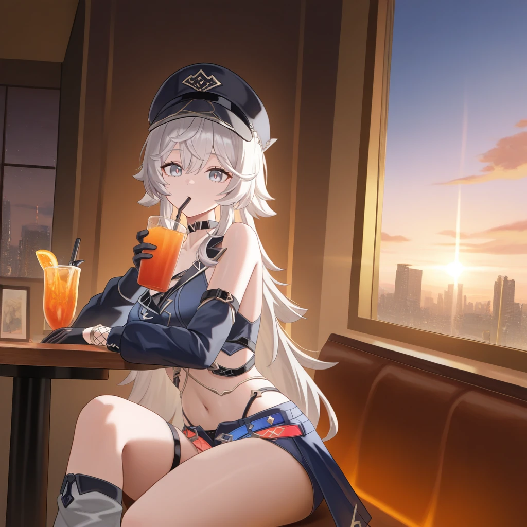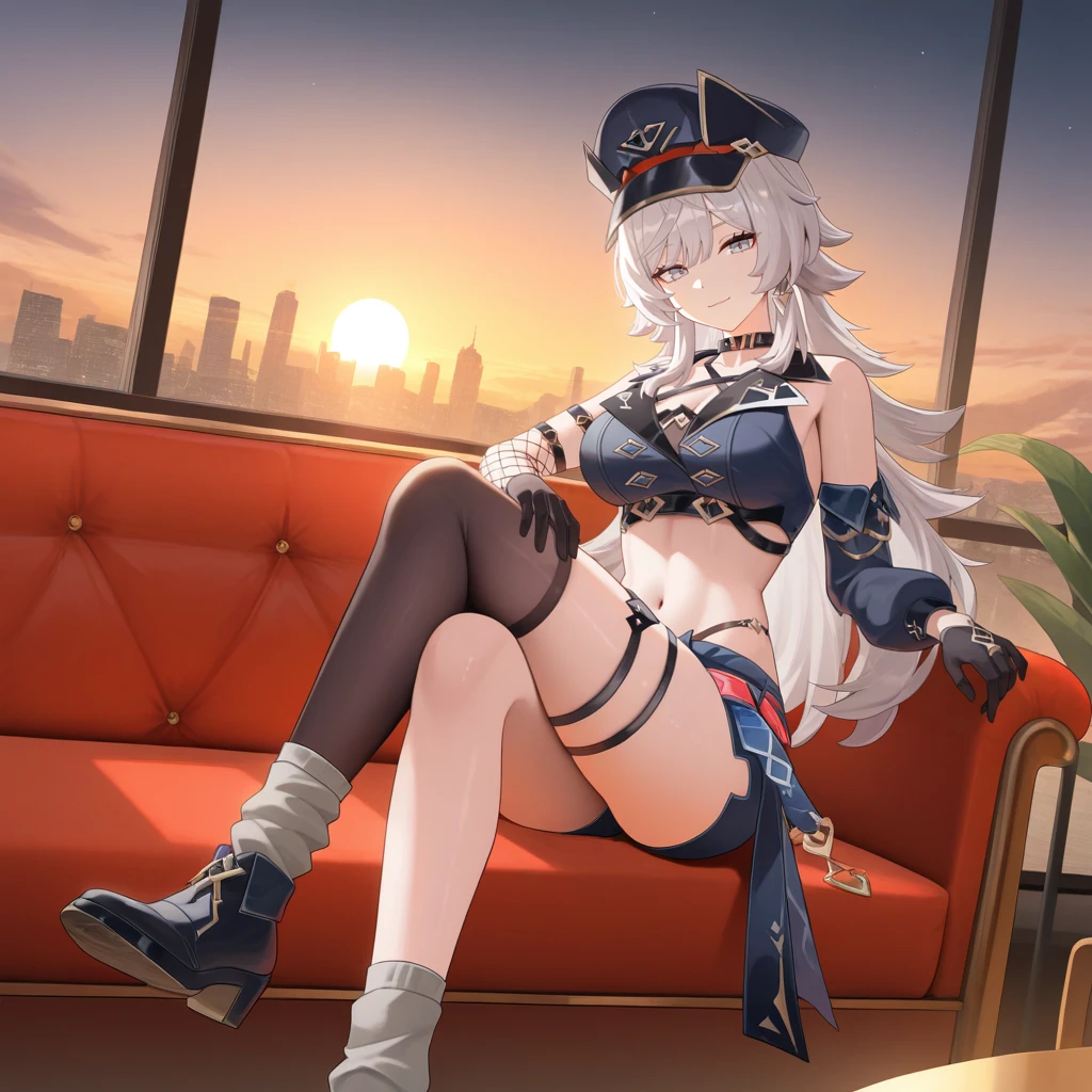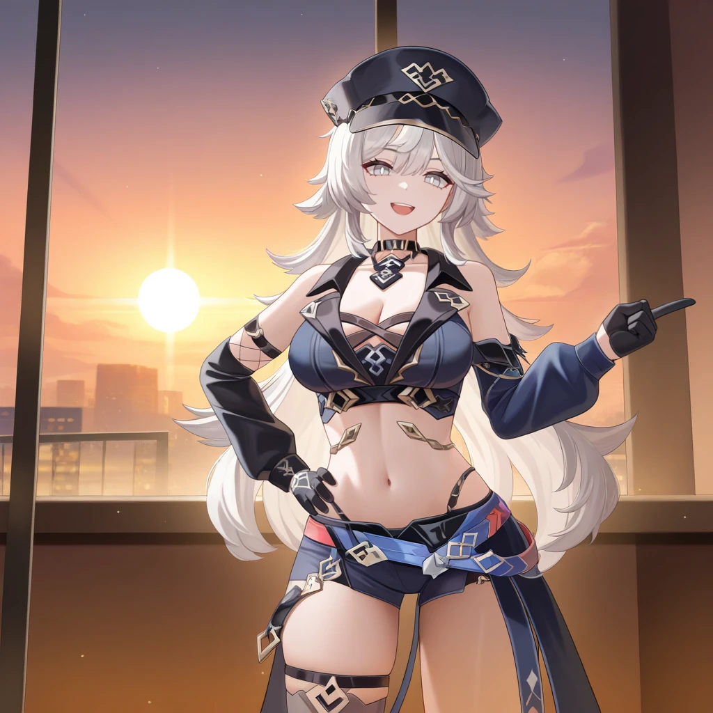 HeliaHi3, Hel_Pnk, grey hair, long hair, grey eyes, peaked cap, black headwear, fishnet armwear, arm belt, sleeveless shirt, crop top, dark blue shirt, black collar, collarbone, black choker, underbust, criss-cross straps, navel, short shorts, dark blue shorts, open skirt, black skirt, crossed belts, multicolored belts, stole, single thighhigh, black thighhighs, thigh strap, black gloves, gloves, single detached sleeve, puffy sleeves, asymmetrical armwear, single arm warmer, loose socks, grey socks, ankle boots, black footwear,