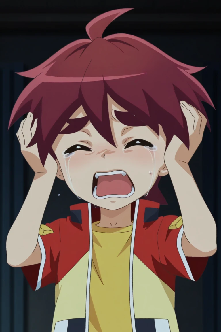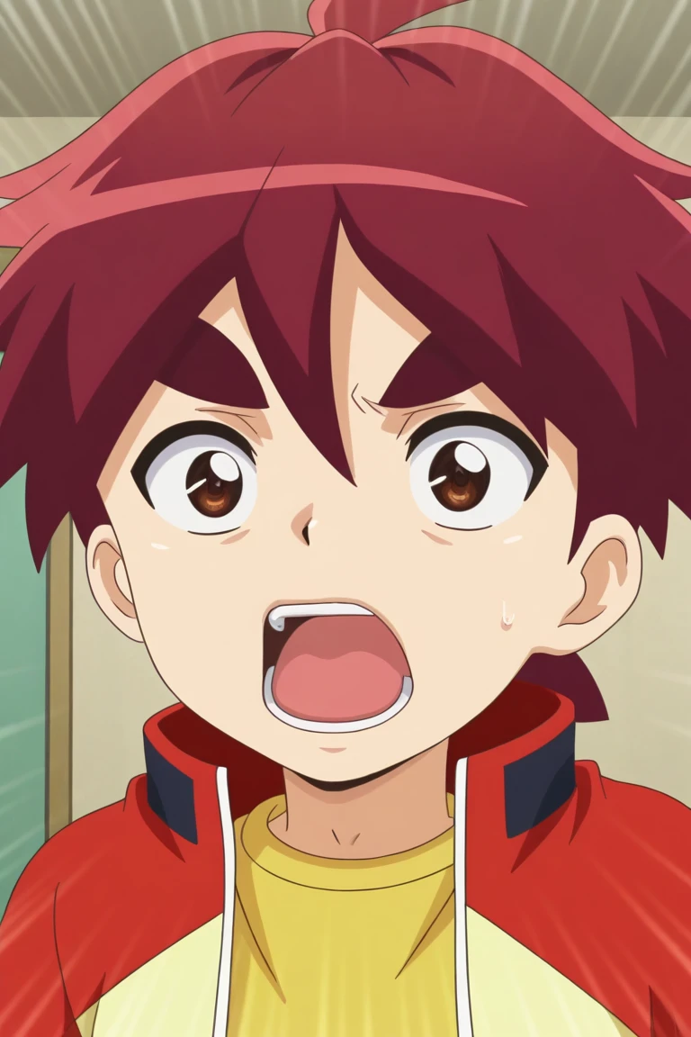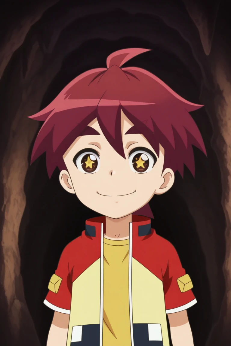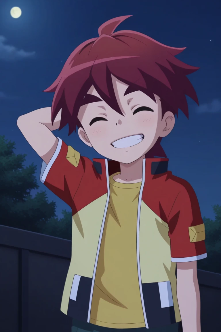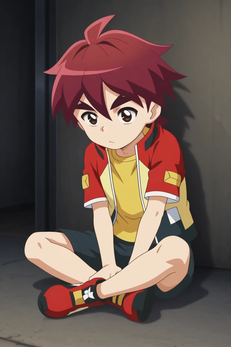 *jason, red hair, brown eyes, red jacket, yellow shirt, black shorts, red shoes
