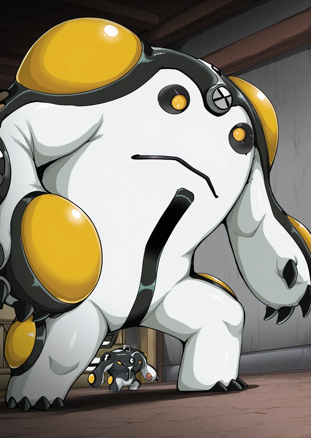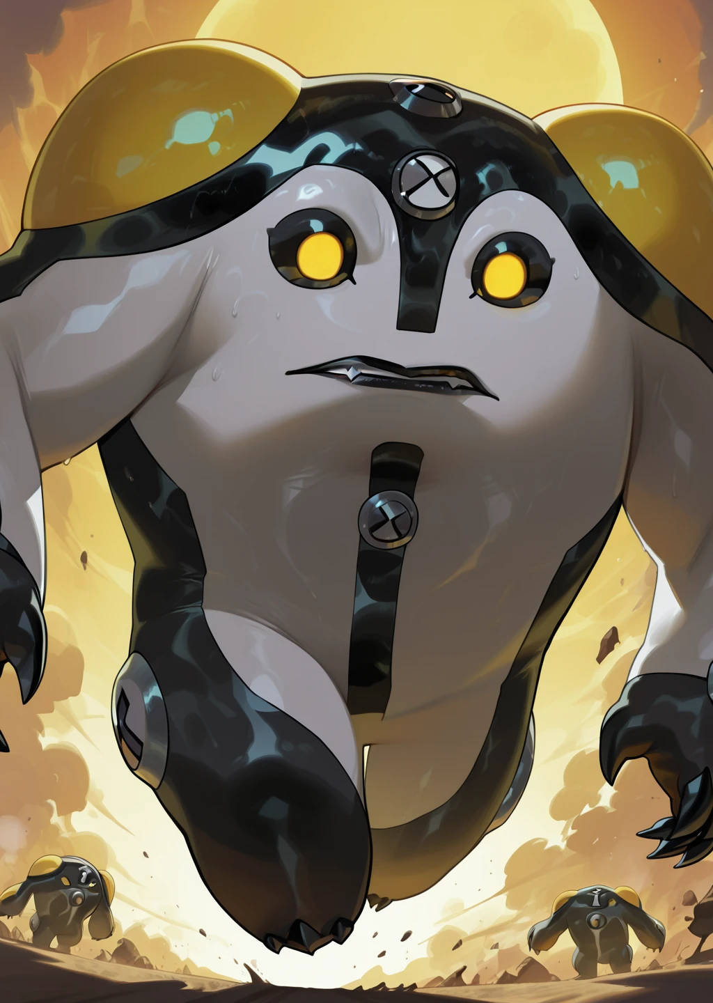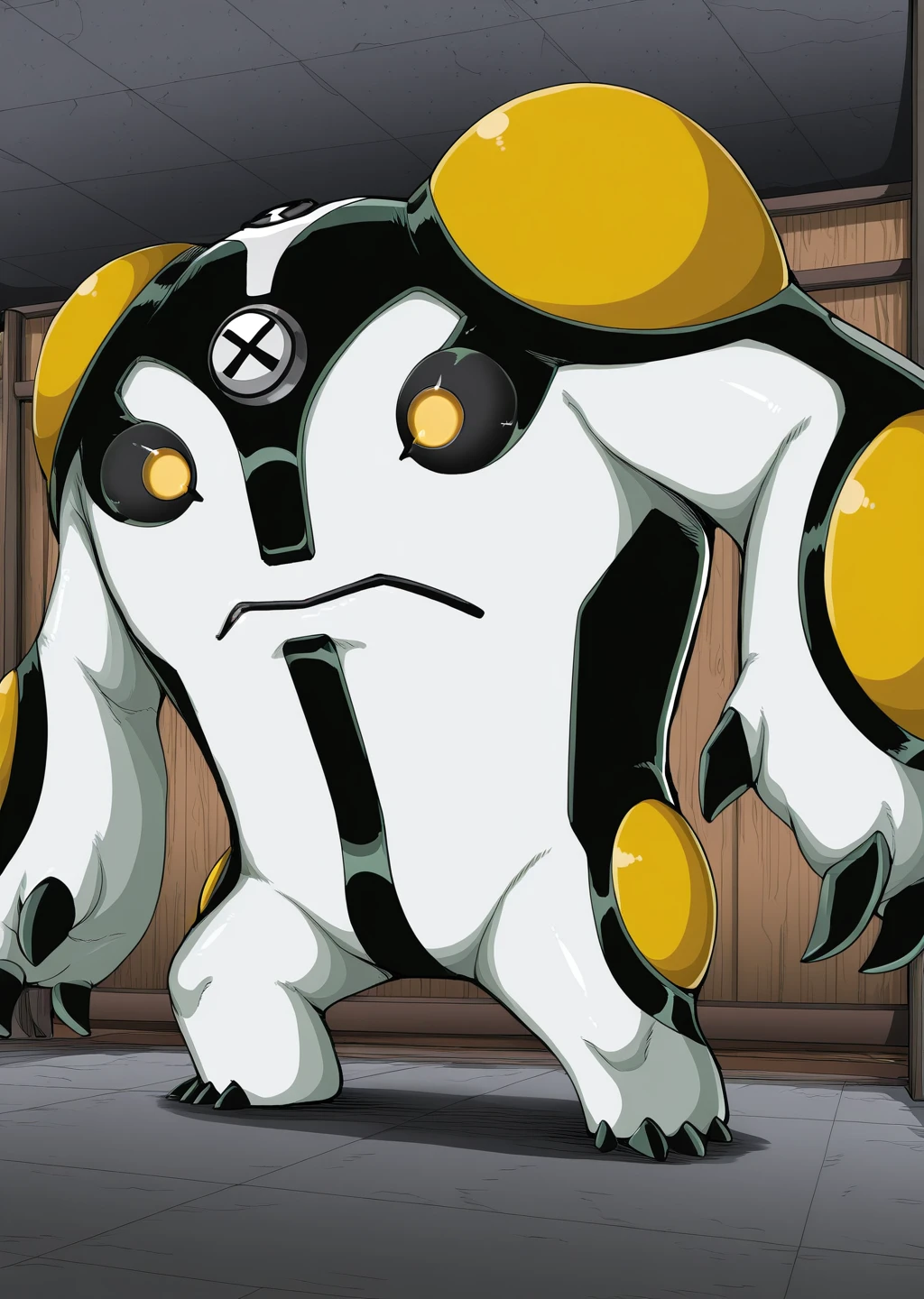 cannonbolt, yellow eyes, creature, black and white skin, yellow orbs, armour, black lips,