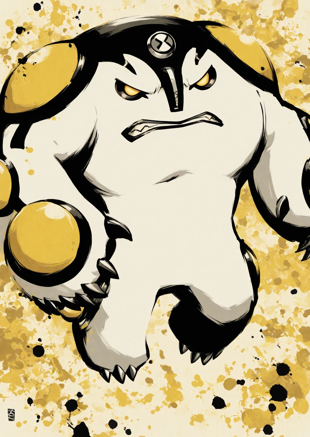 Prompts: cannonbolt, yellow eyes, creature, black and white skin, yellow orbs, armour, black lips,