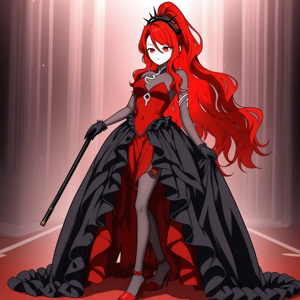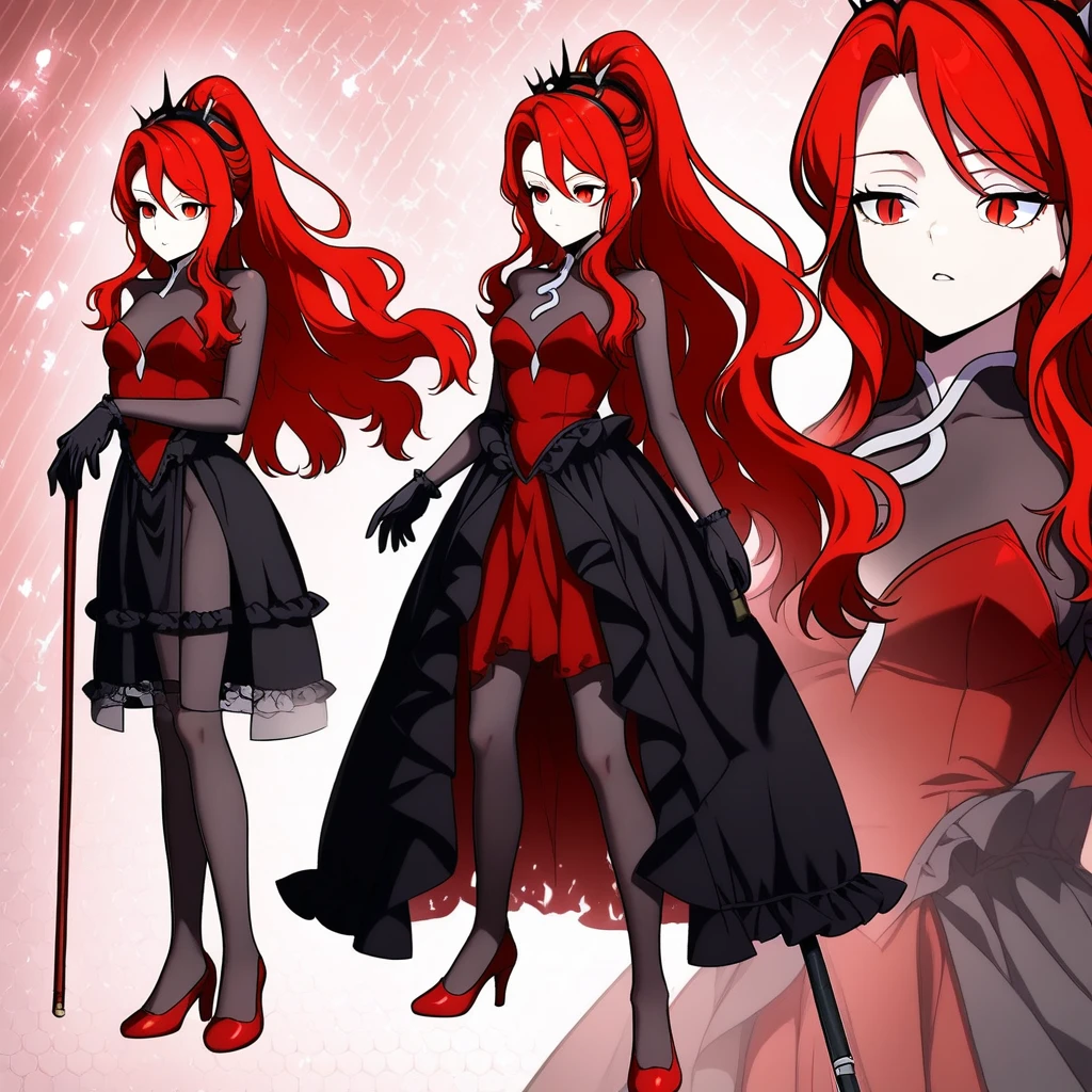 red eyes, long hair, red hair, hair between eyes, thick hair, swept bangs, high ponytail, crown-like headband, spiked headband, strapless red dress, high-low skirt, red skirt, black overskirt, front-slit skirt, ruffled skirt, wavy skirt, black frills, black sheer bodysuit, see-through inner layer, transparent sleeves, high collar, long sleeves, black pantyhose, short gloves, frilly gloves, black gloves, red high heels, cane, snake motif