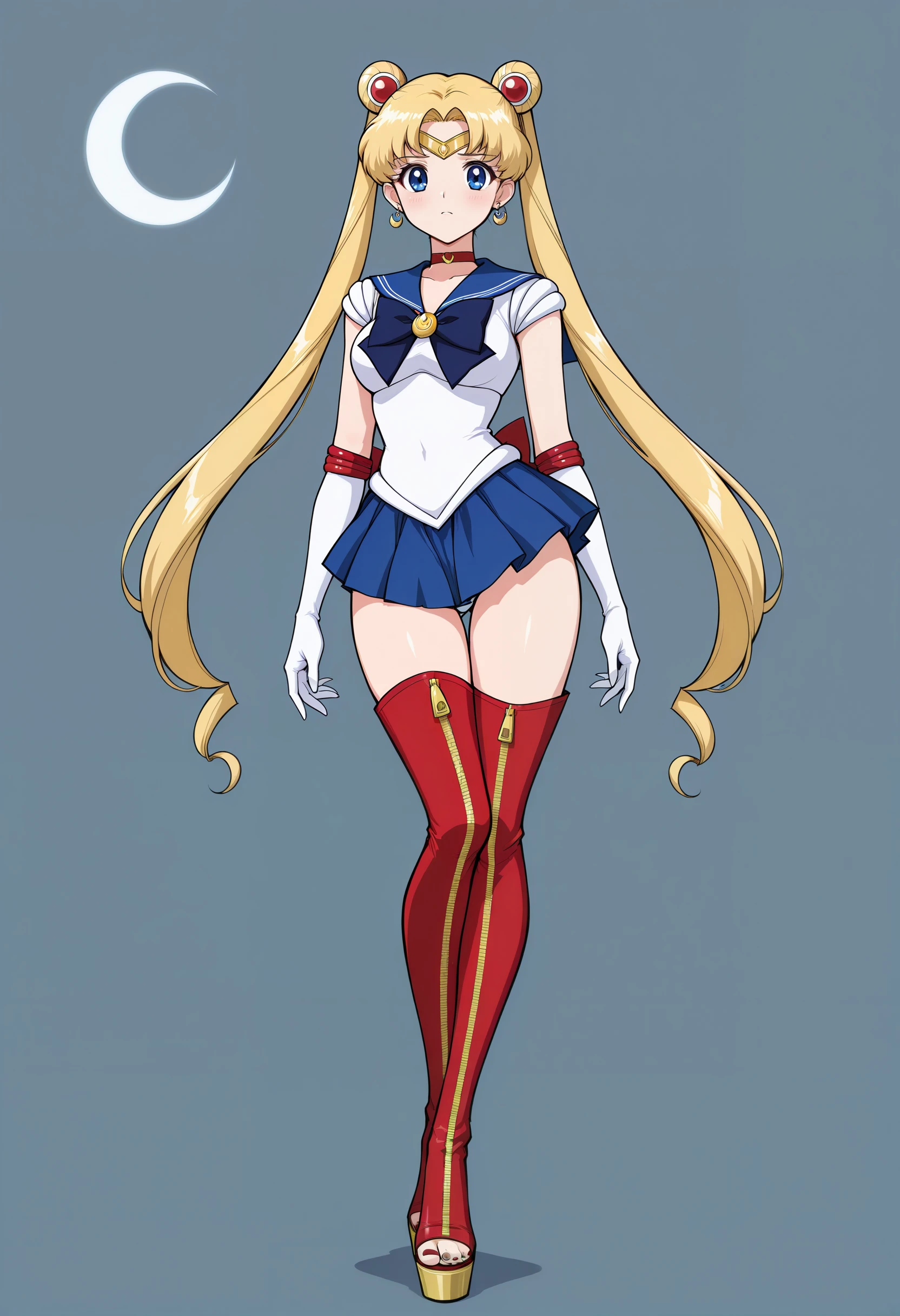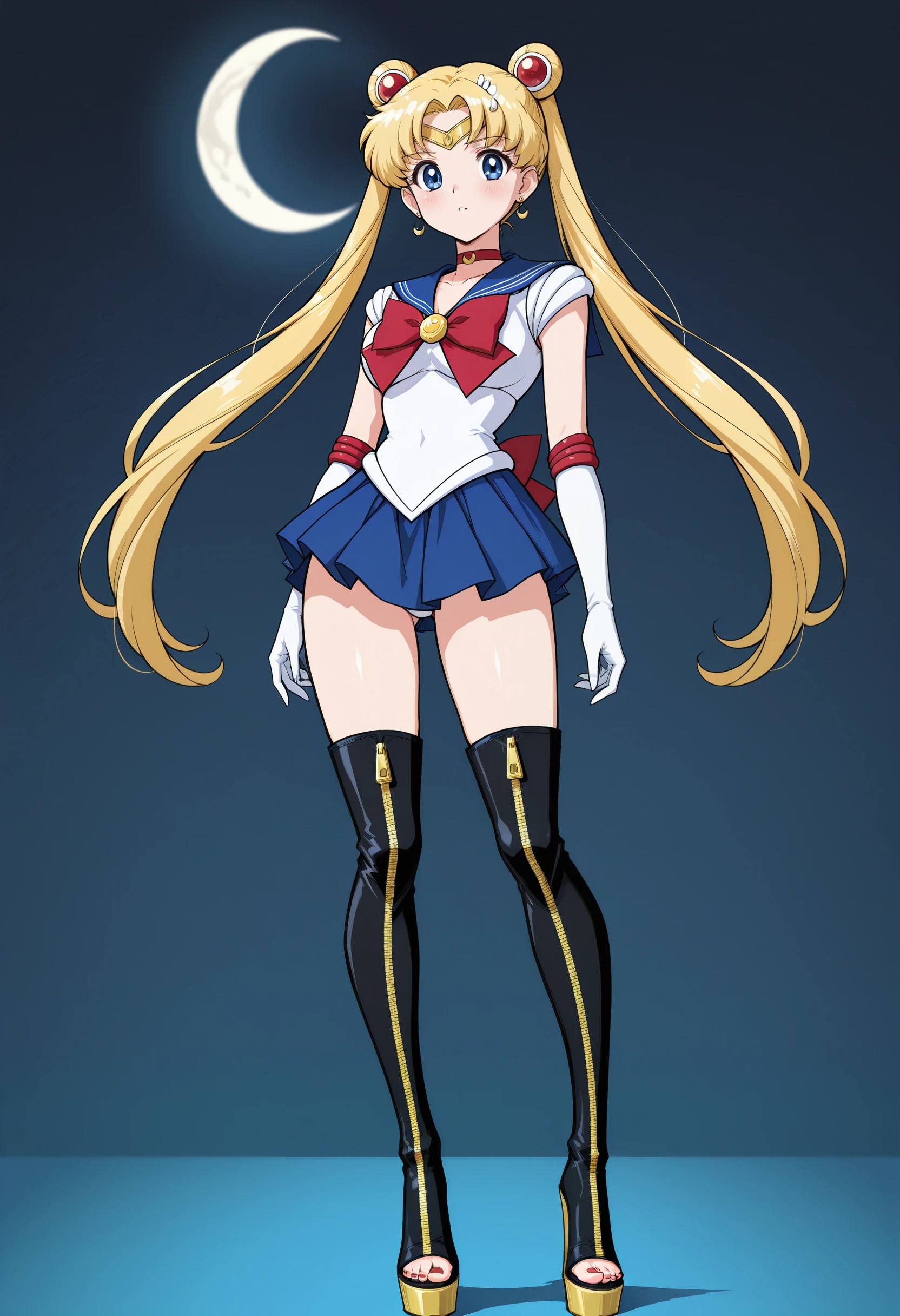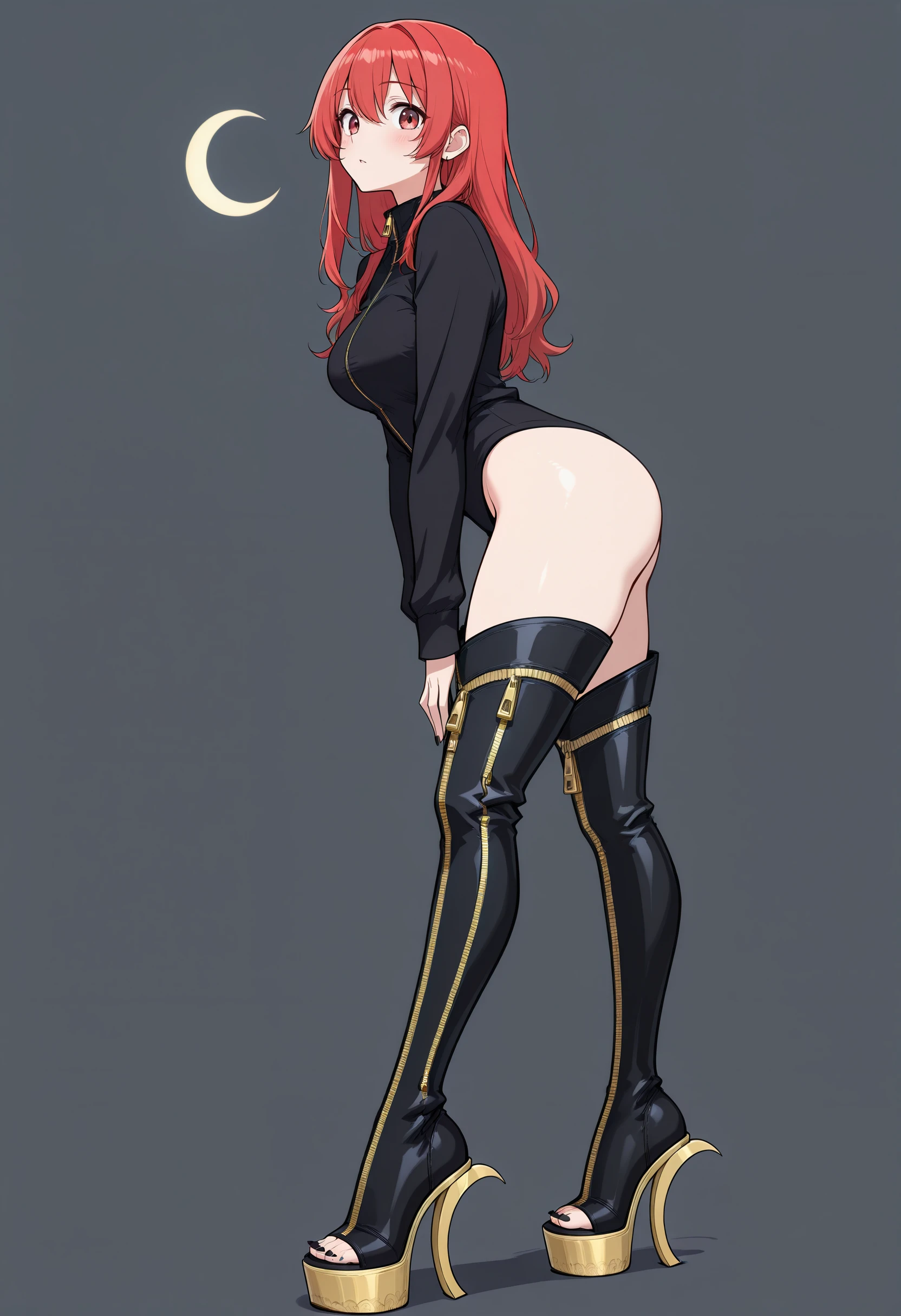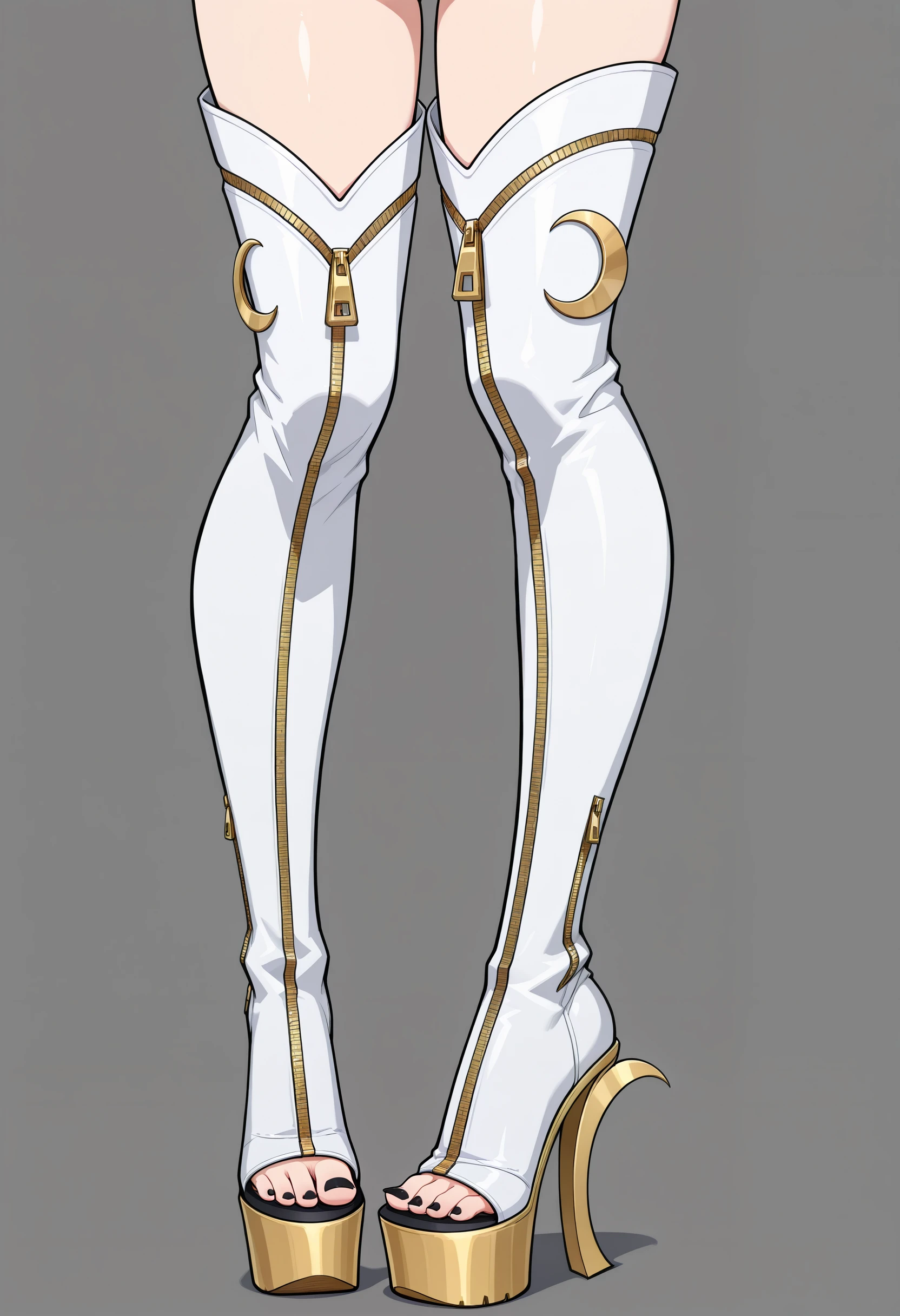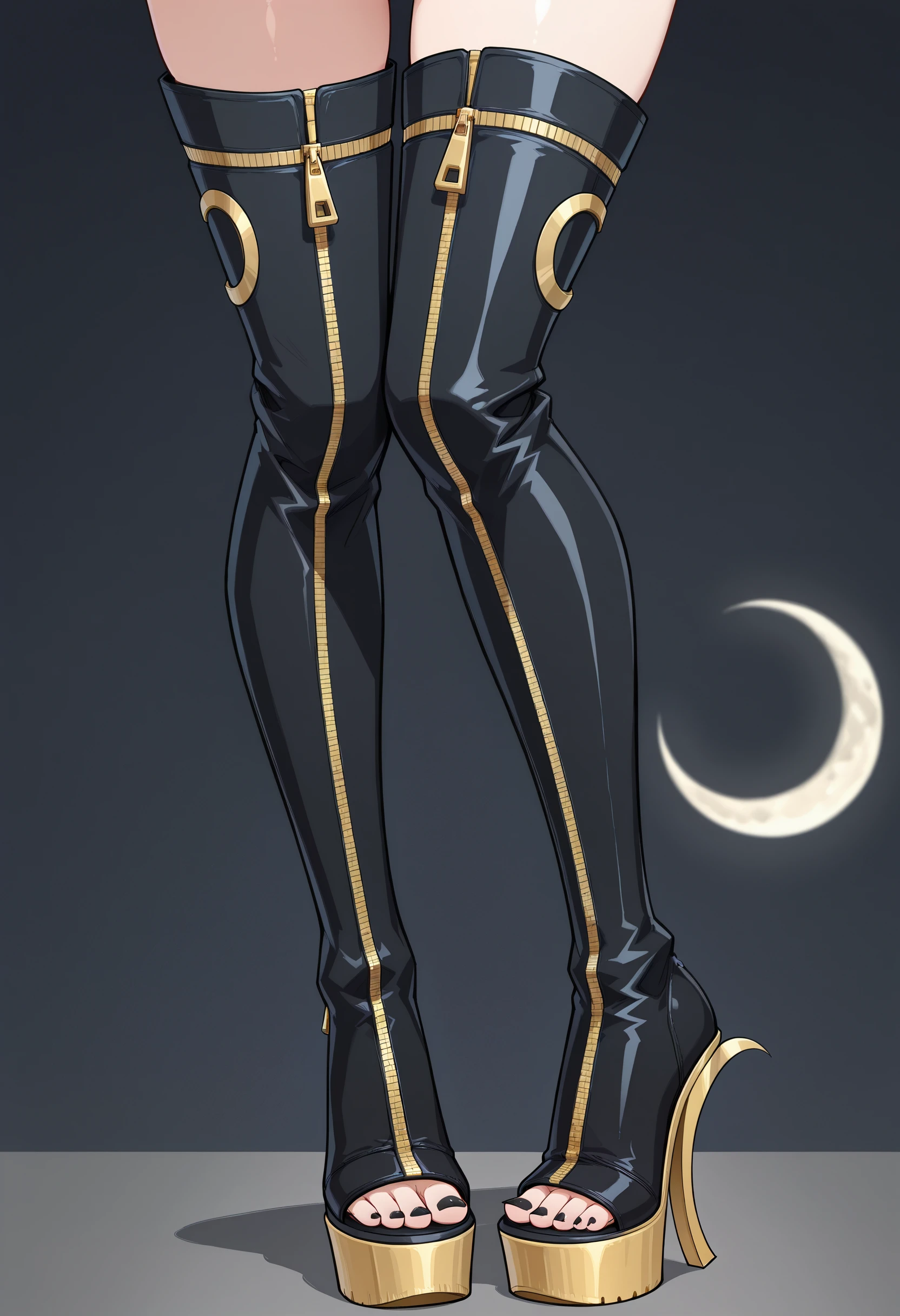 zipper, crescent moon thigh boots, platform footwear, open-toe shoes