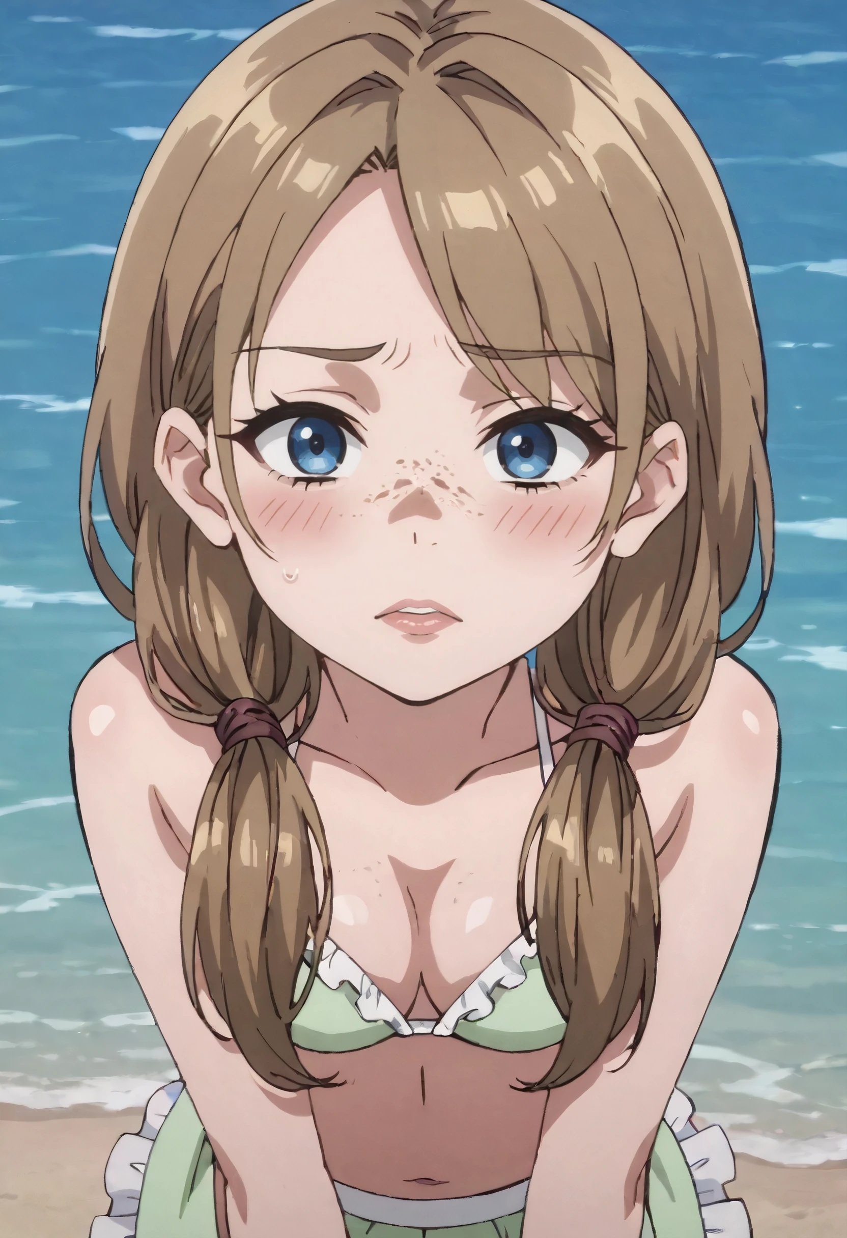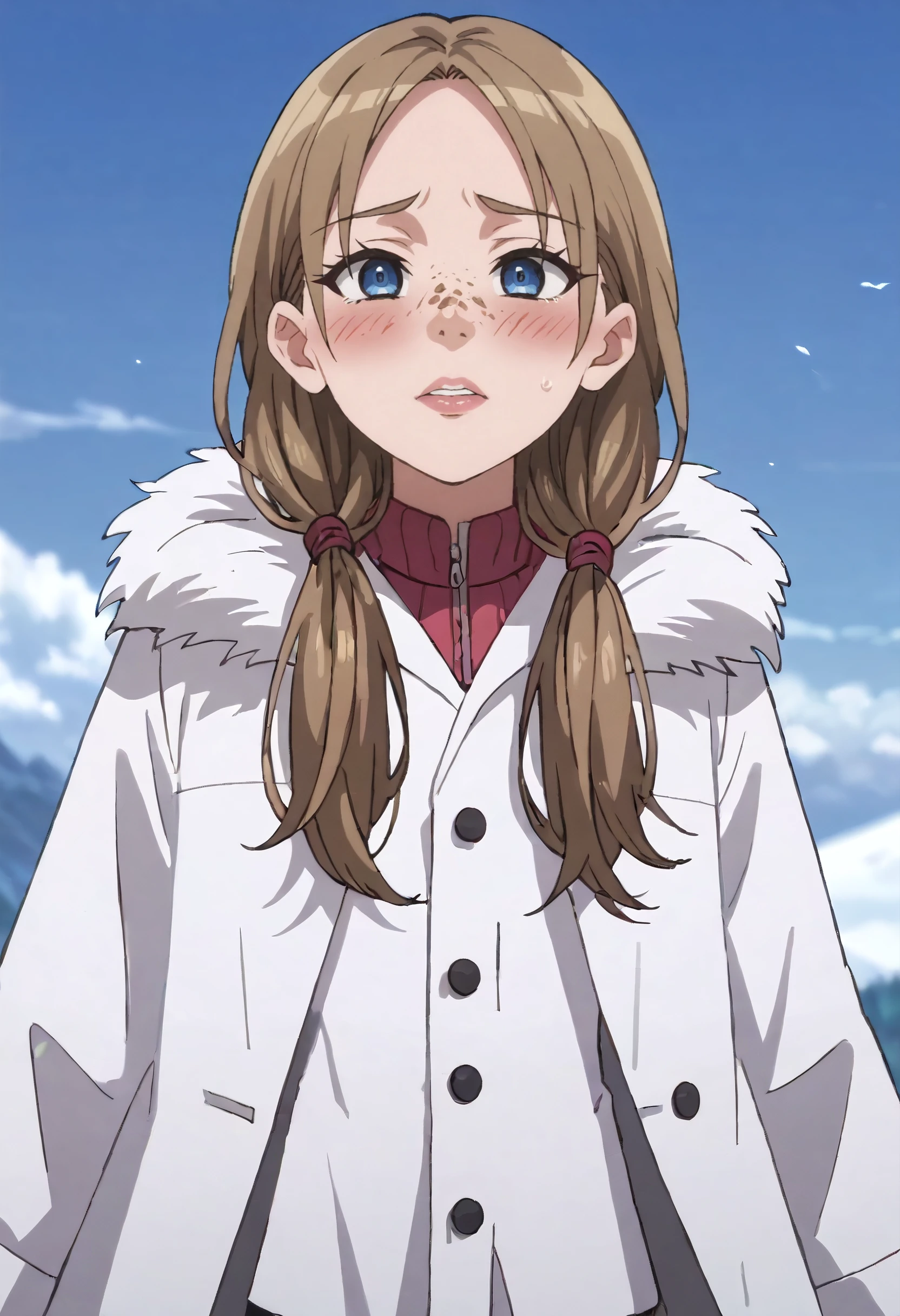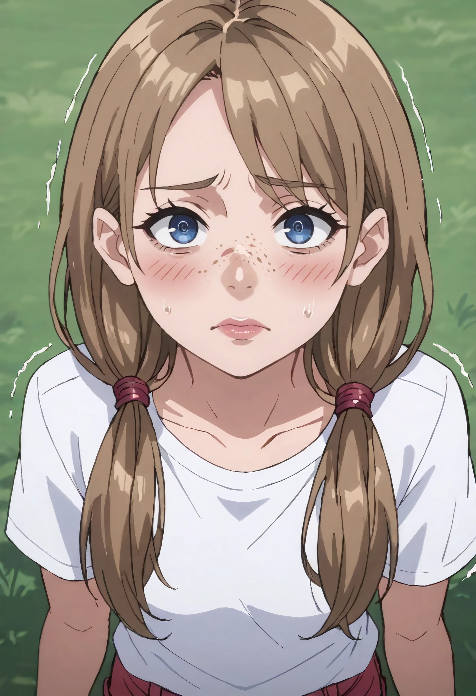 MOKKathy, long hair, brown hair, low twintails, twintails, freckles, blue eyes,