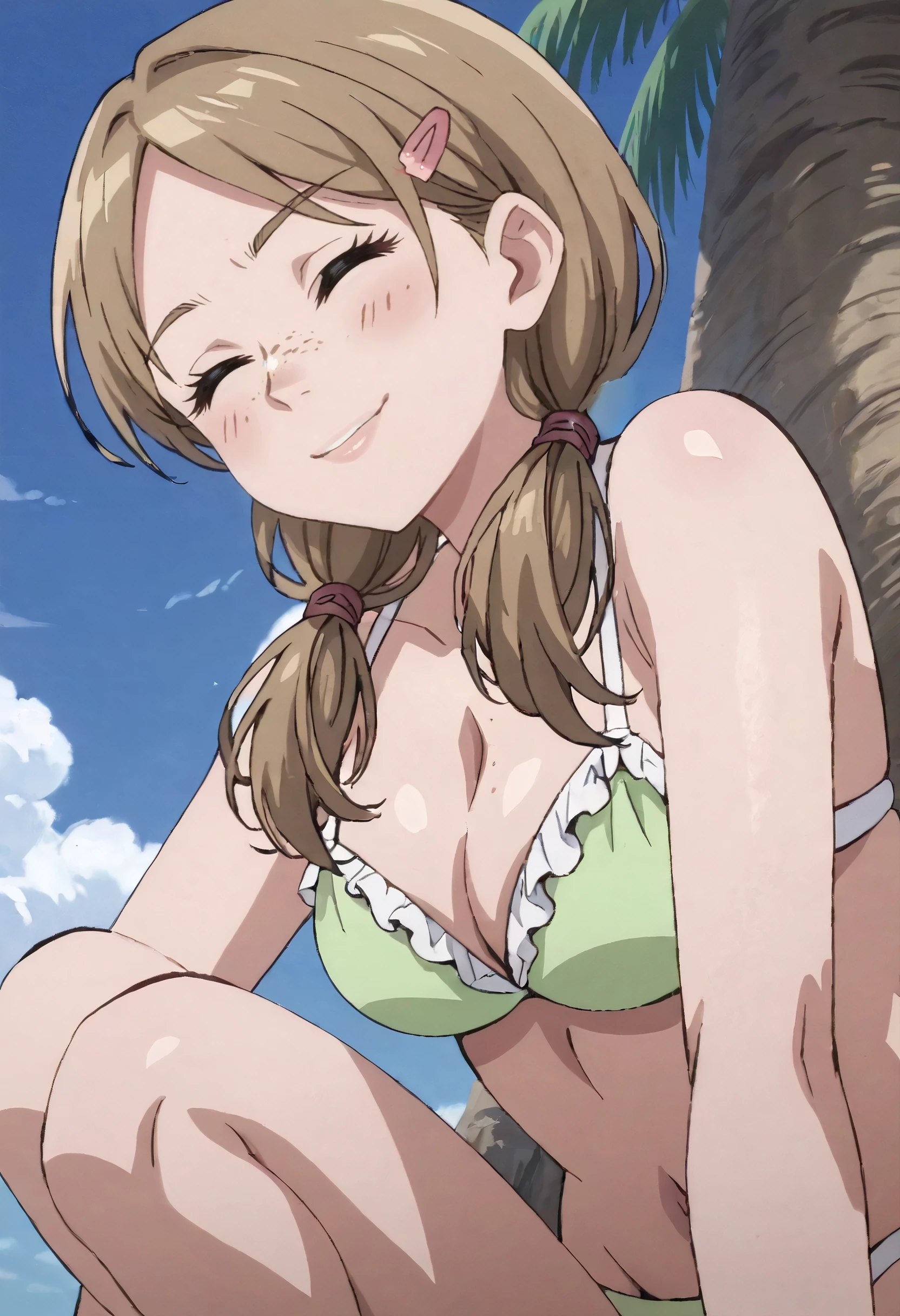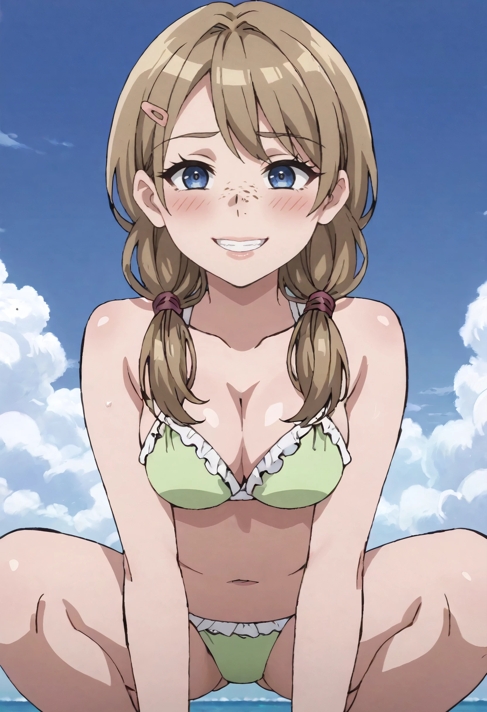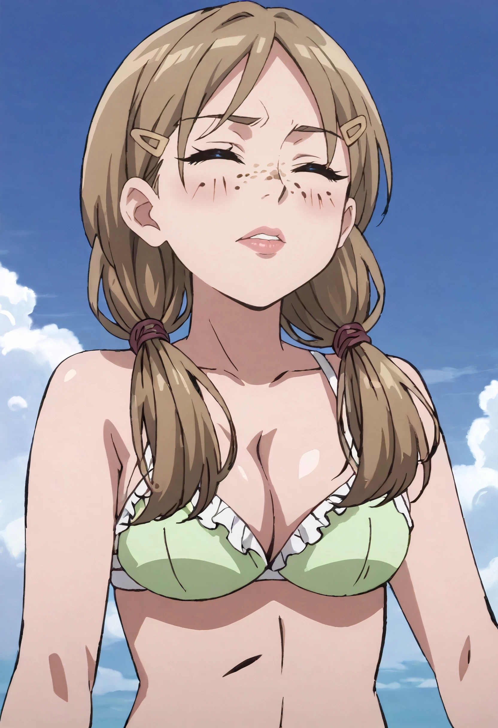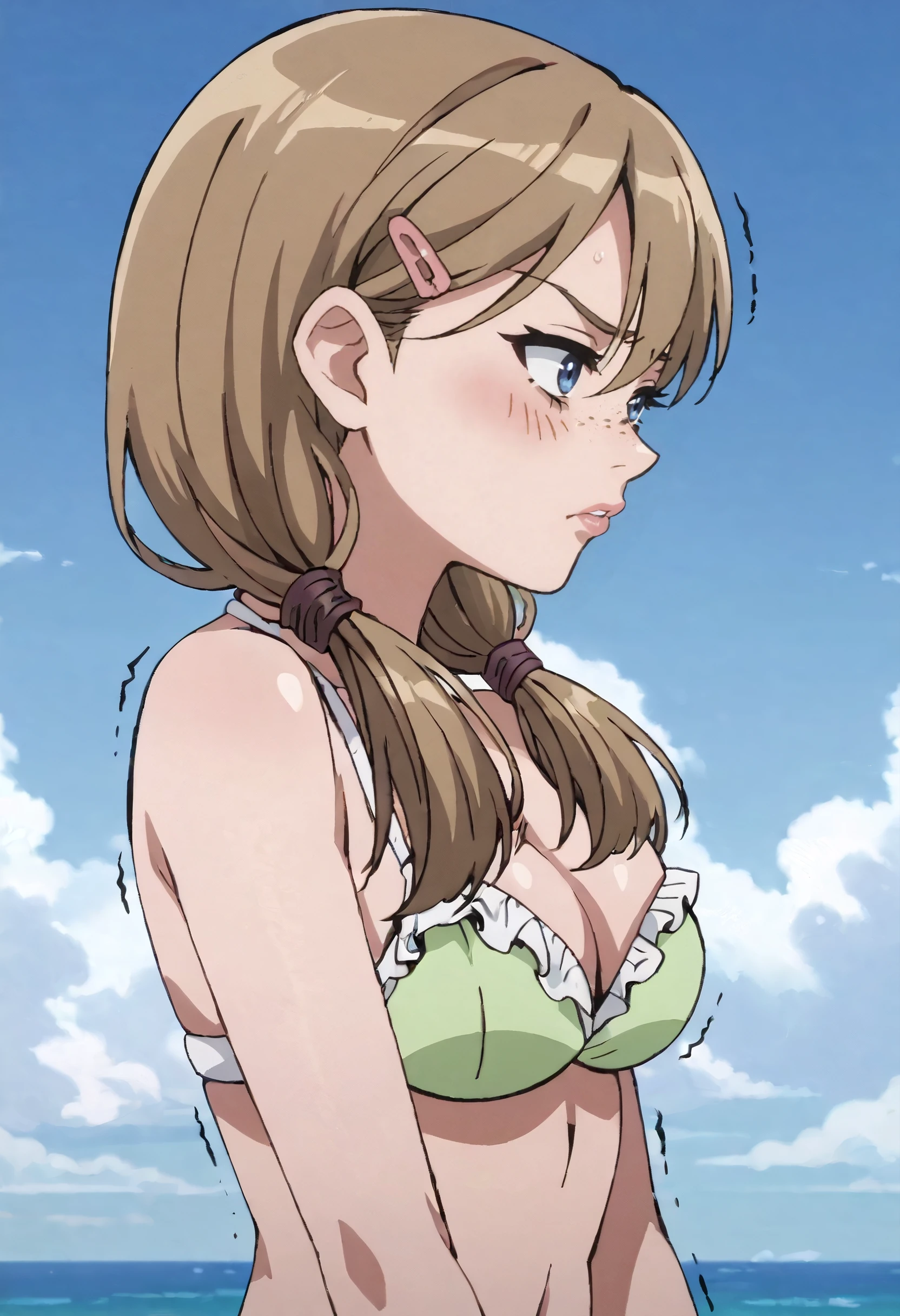 KathySwimwear, bikini, swimsuit, green bikini, frilled bikini, cleavage, frills, hairclip, hair ornament,