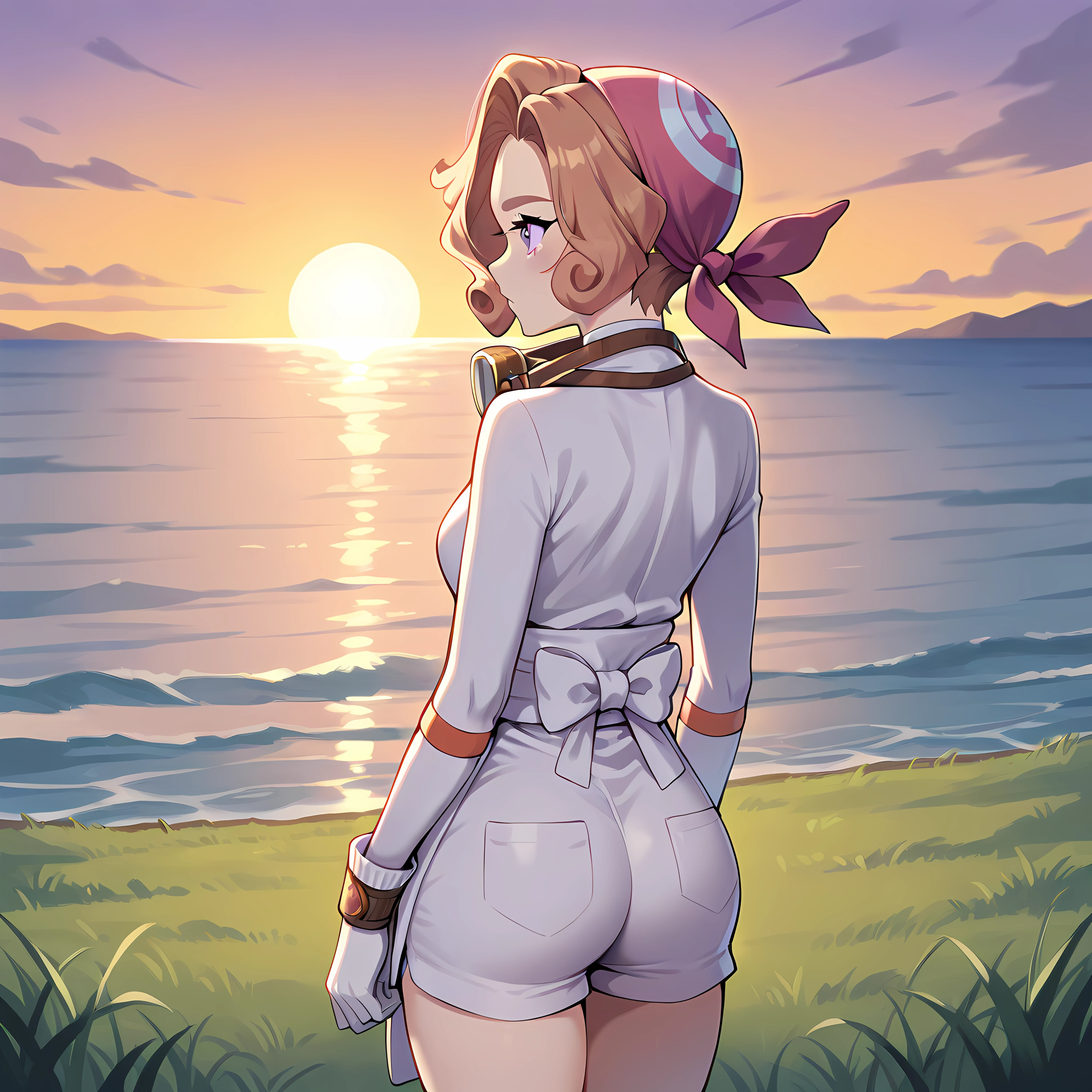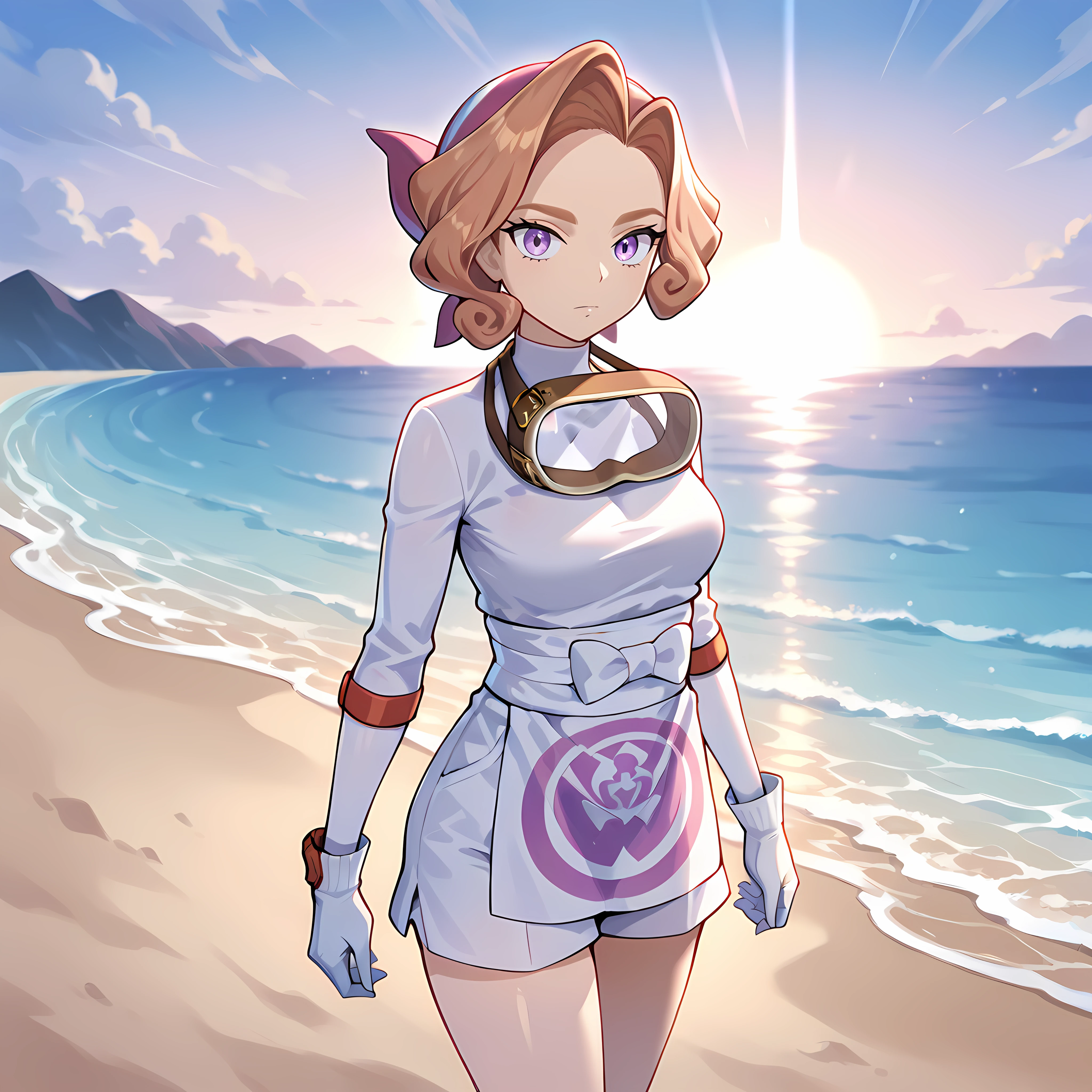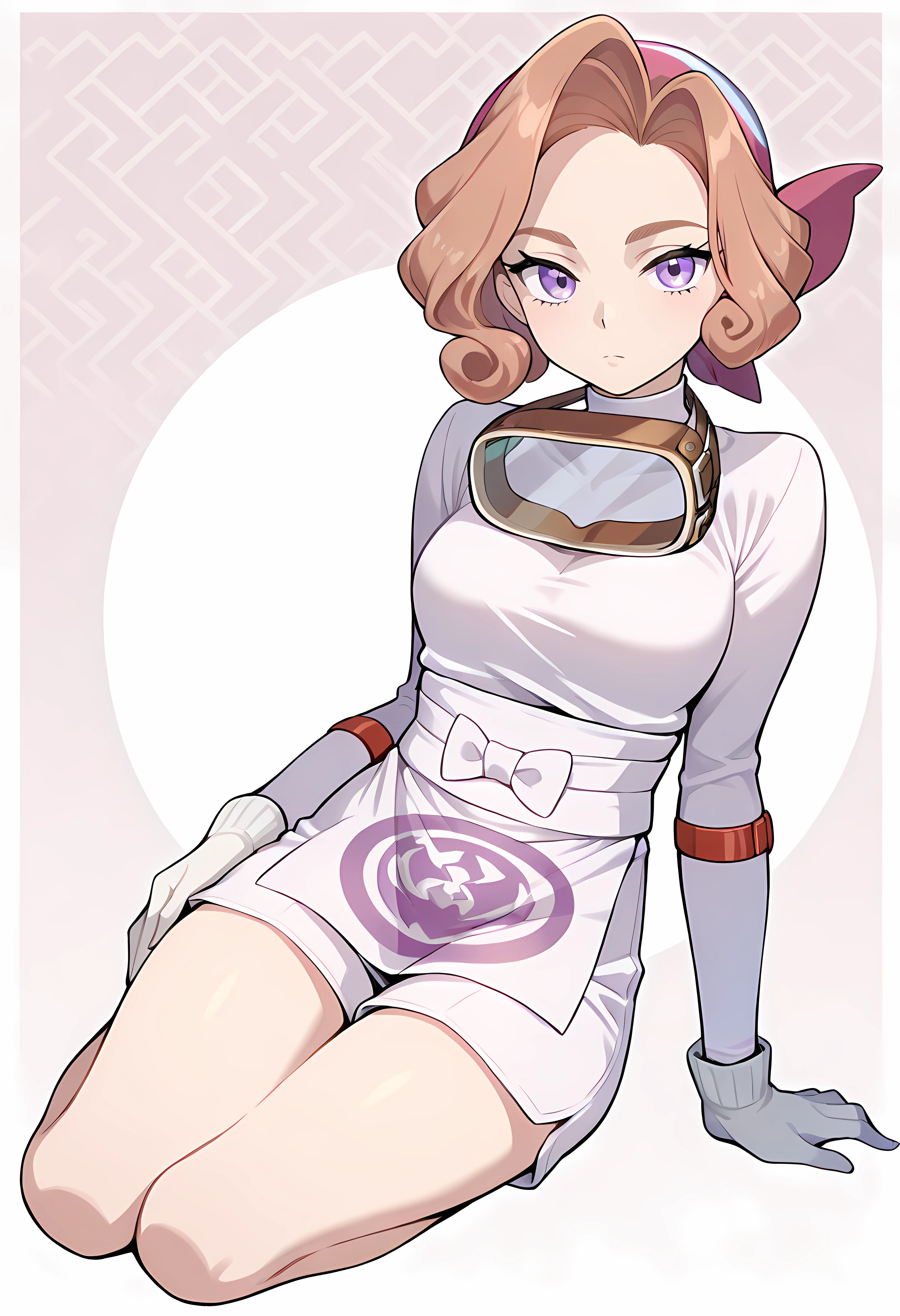 brown hair, short hair, purple eyes, goggles around neck, white shirt, white shorts, waist apron, white gloves, bandana