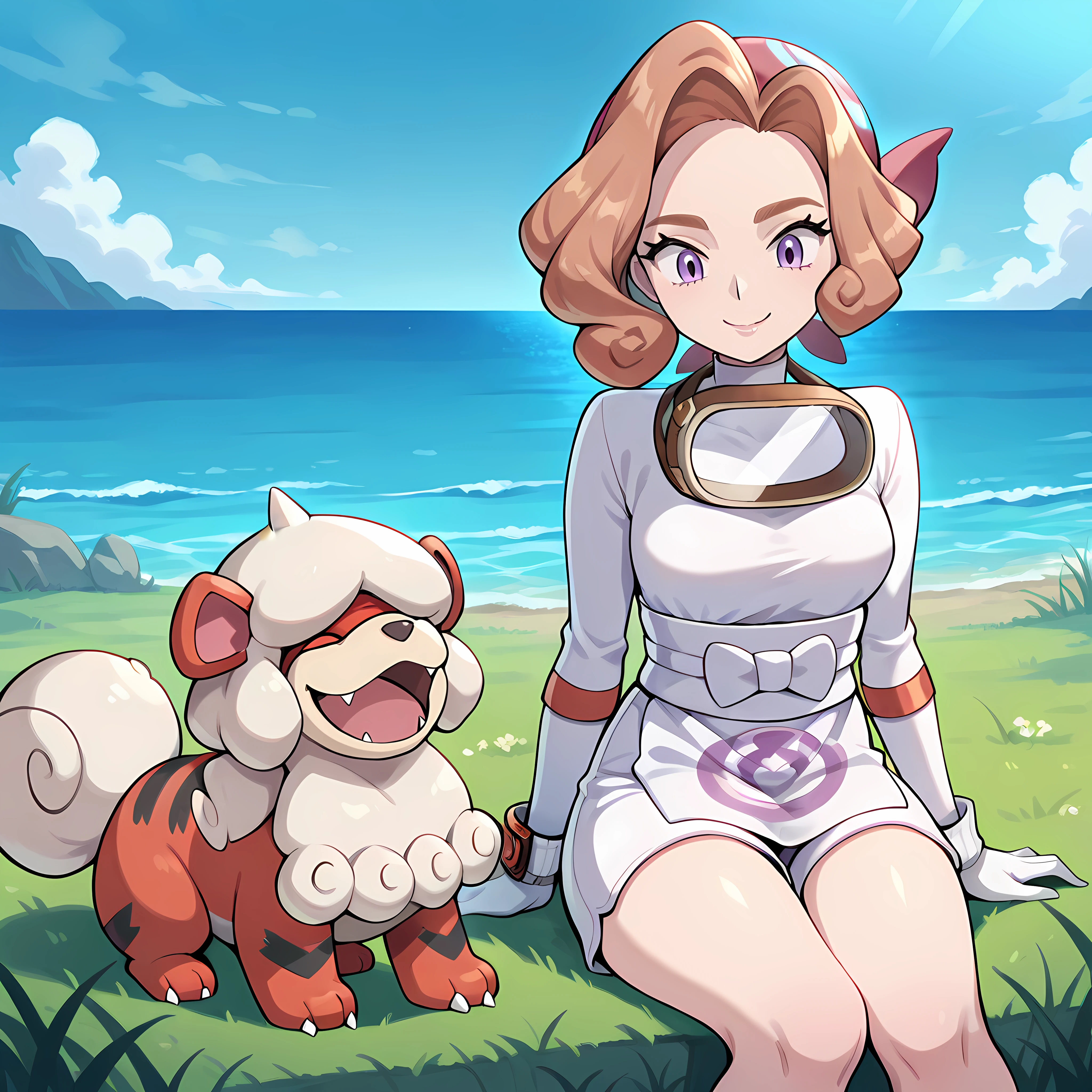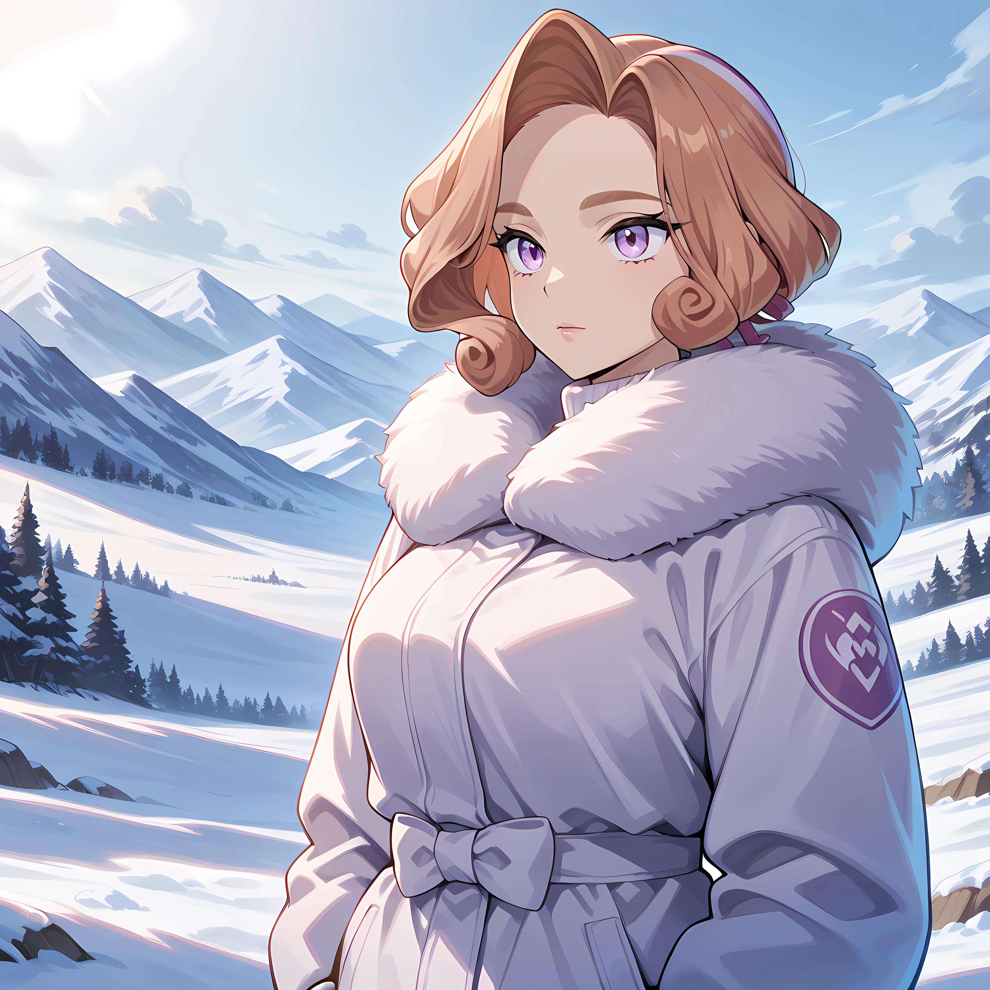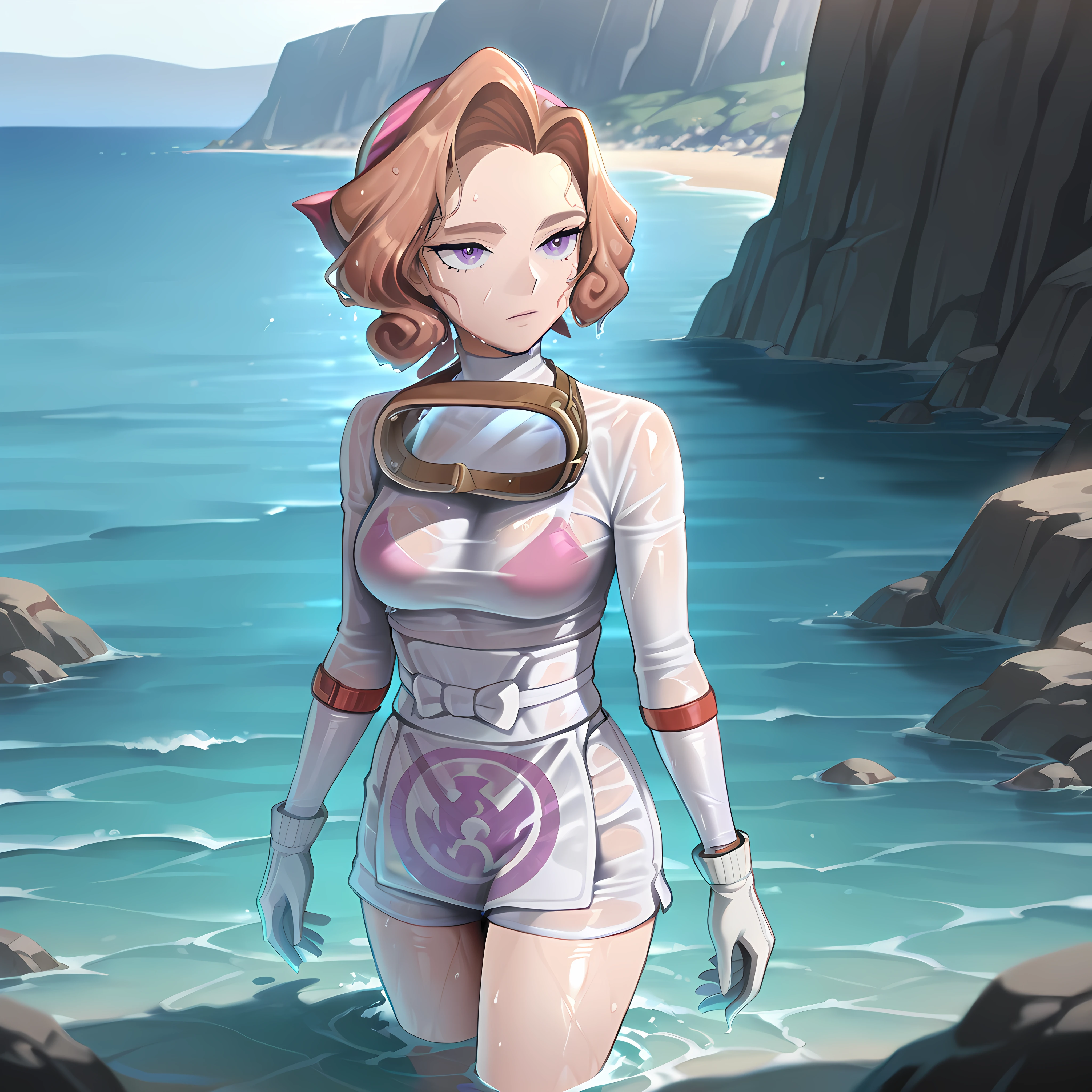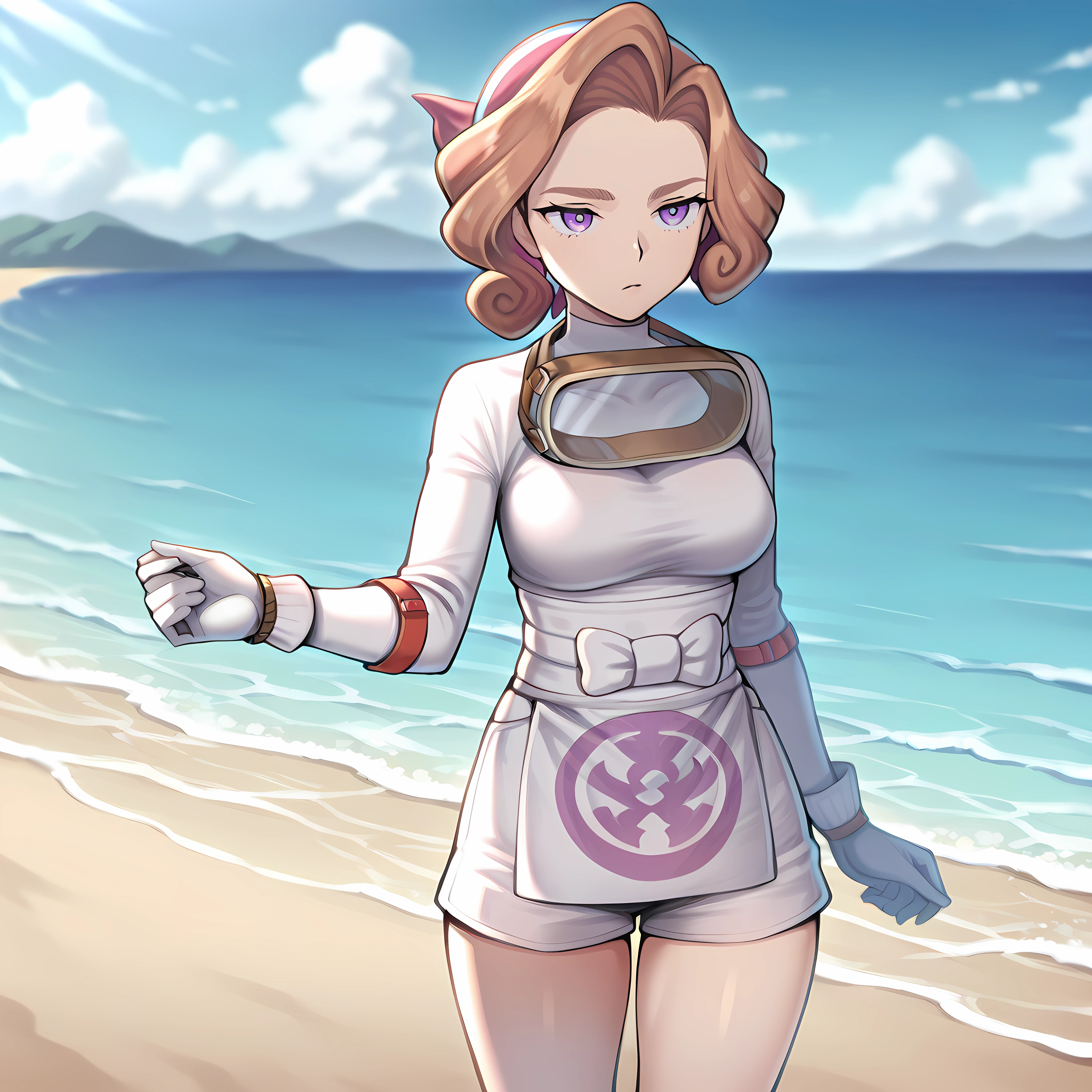 brown hair, short hair, purple eyes, goggles around neck, white shirt, white shorts, waist apron, white gloves, bandana