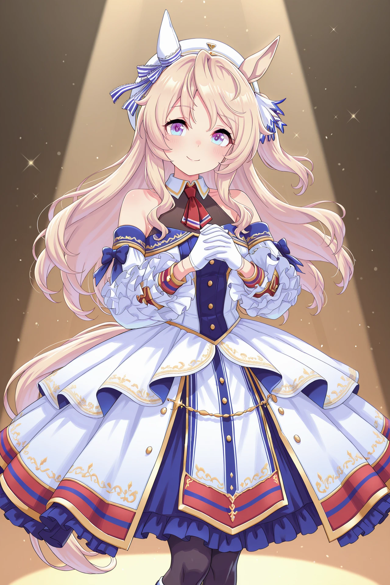 horse girl,horse ears,horse tail,blonde hair,long hair,very long hair,hair between eyes,bangs,single ear cover,blue eye,ear ornament,