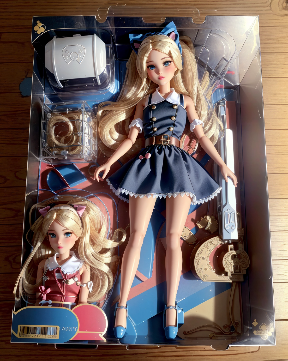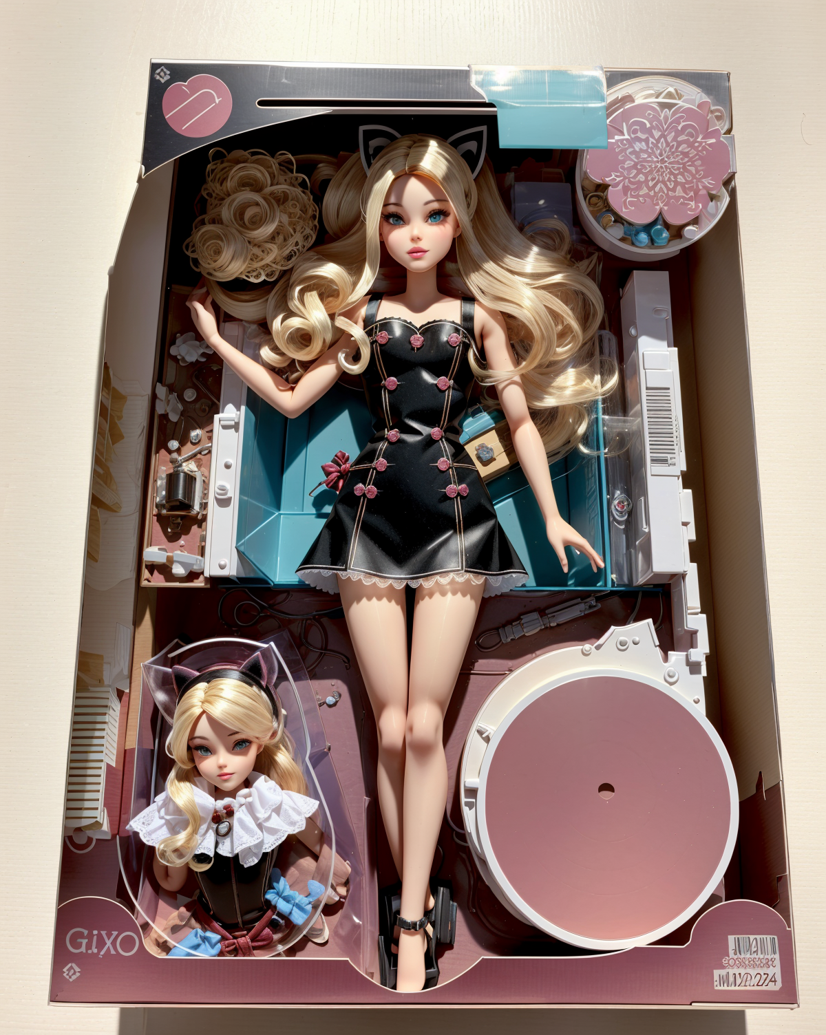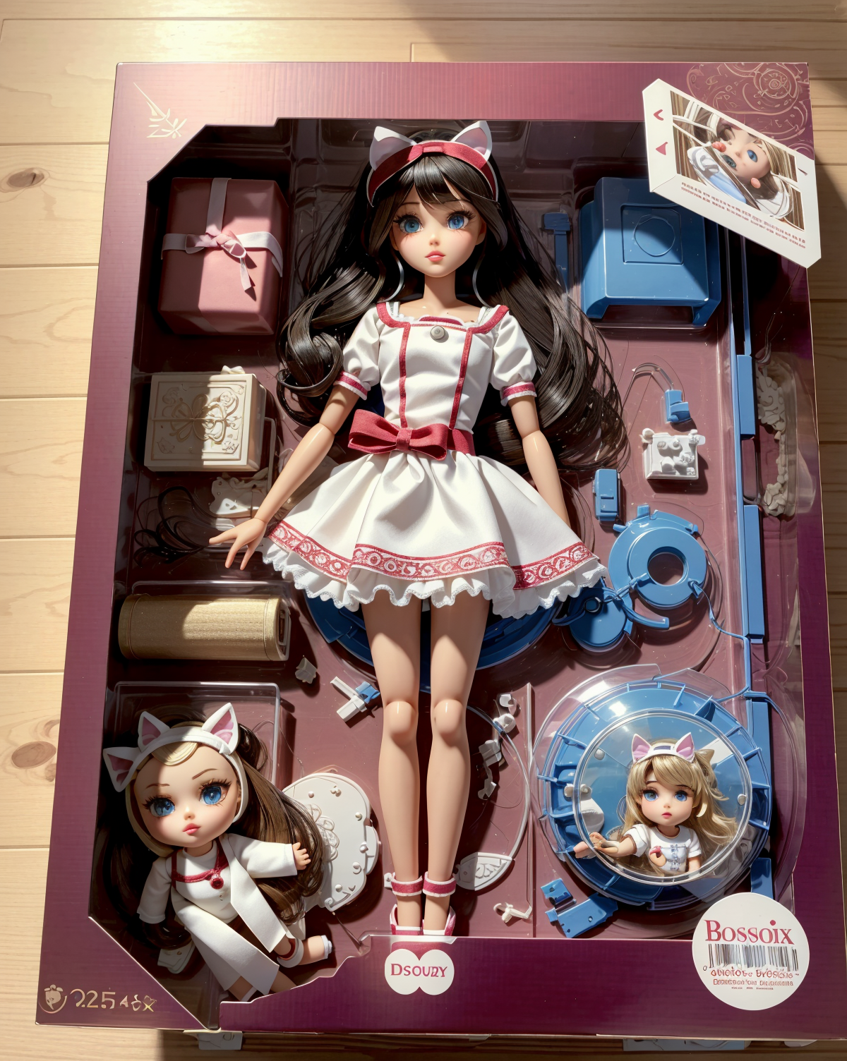 ππ Trigger: inboxDollPlaySetQuiron style, gift box, no humans, playset, in a box, full body, cover page, toy, character print, doll, toy playset pack, in a gift box, <lora:quiron_inboxDollPlaySet_v2_lora:1>