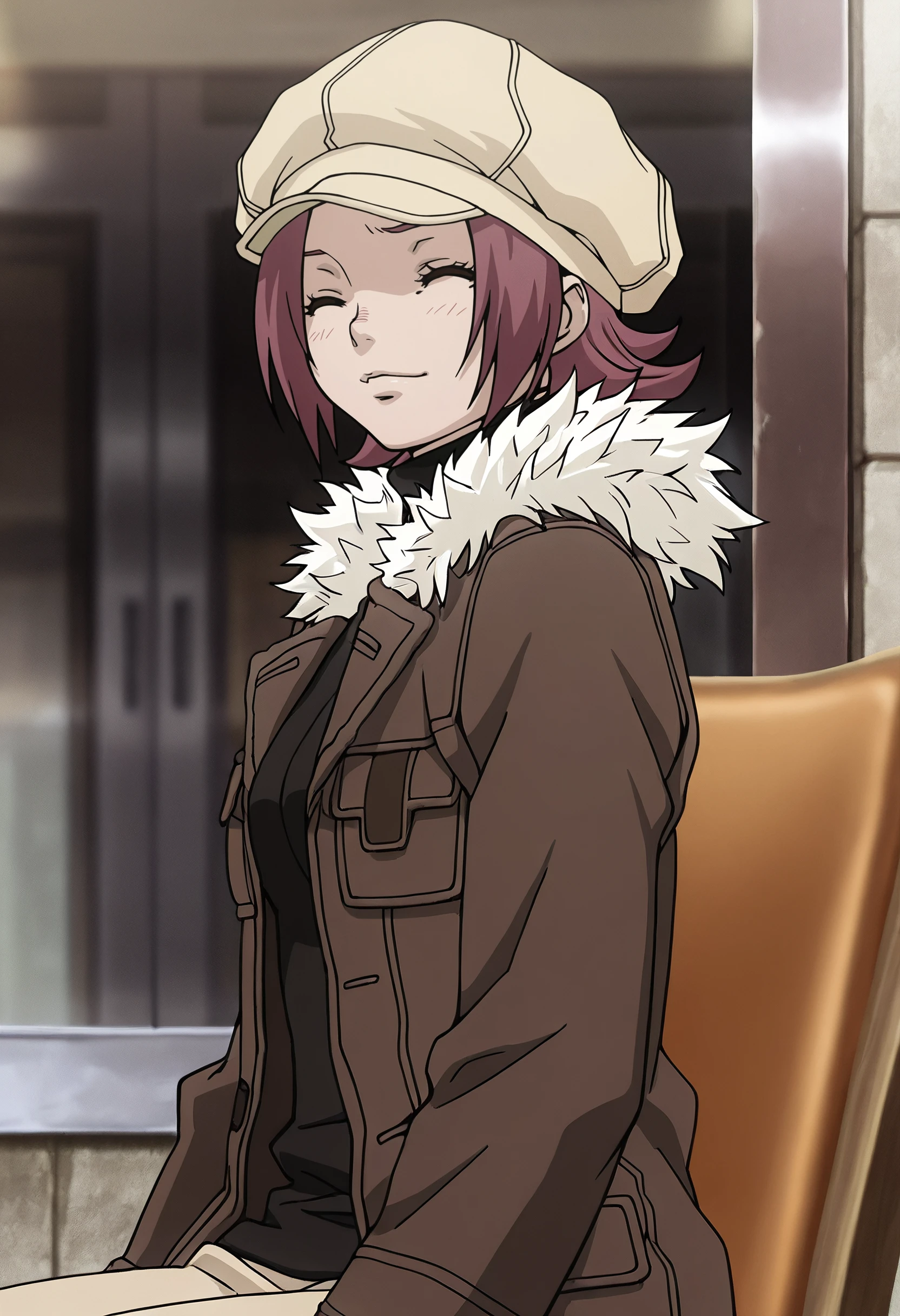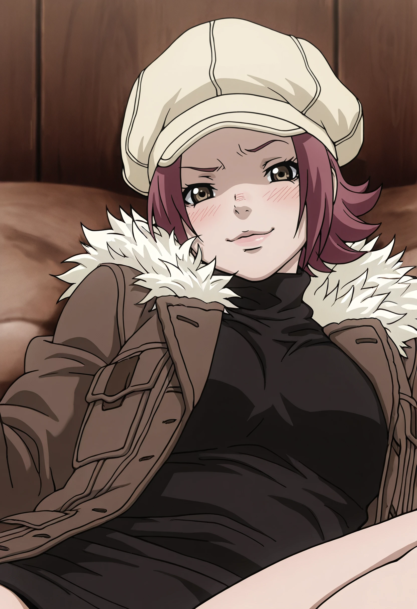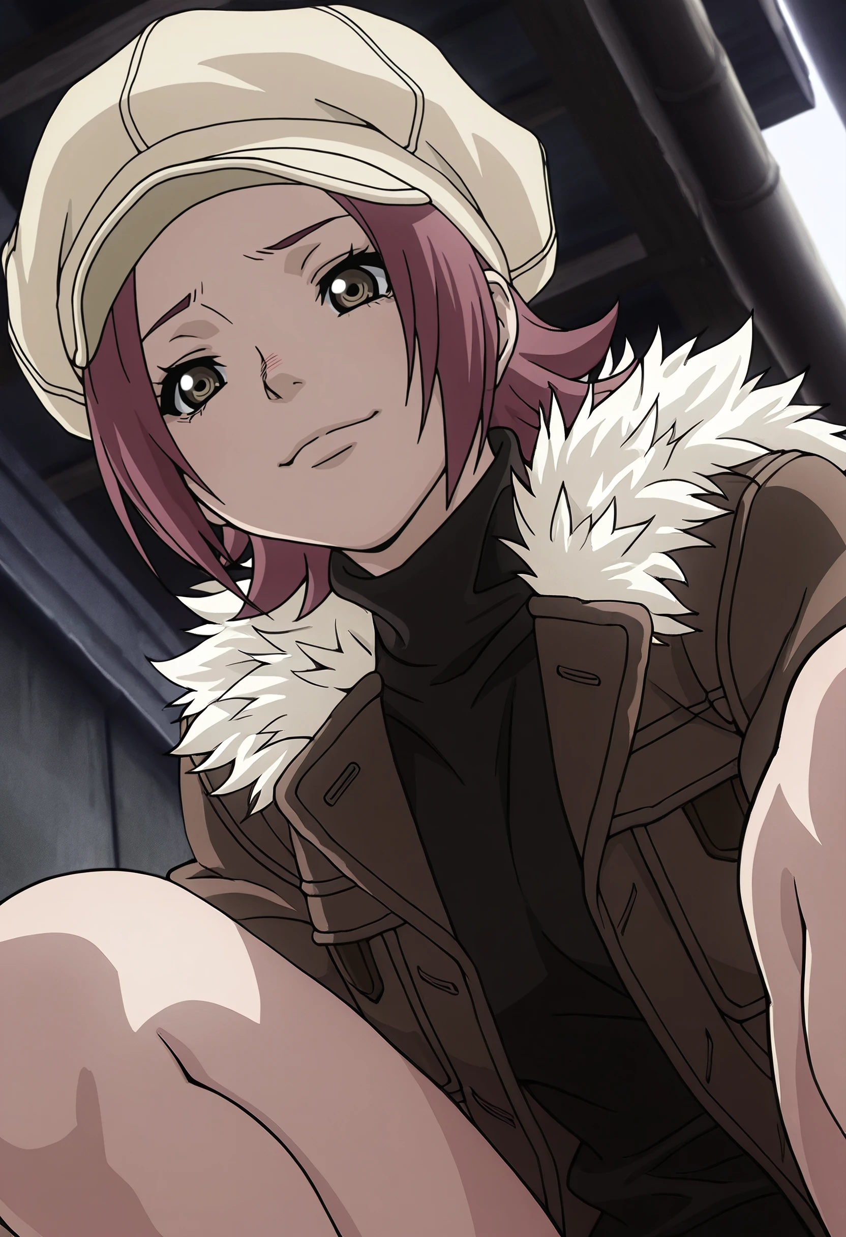 HanakoJacket, fur trim, jacket, hat, cabbie hat, turtleneck, fur-trimmed jacket, open clothes, winter clothes, brown coat, white hat, fur collar, black sweater, brown jacket, turtleneck sweater, sweater, open jacket, long sleeves, pocket,