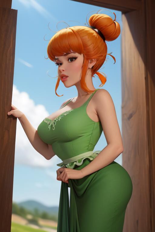 1 girl, Agecanonix, orange hair, single bun, green dress