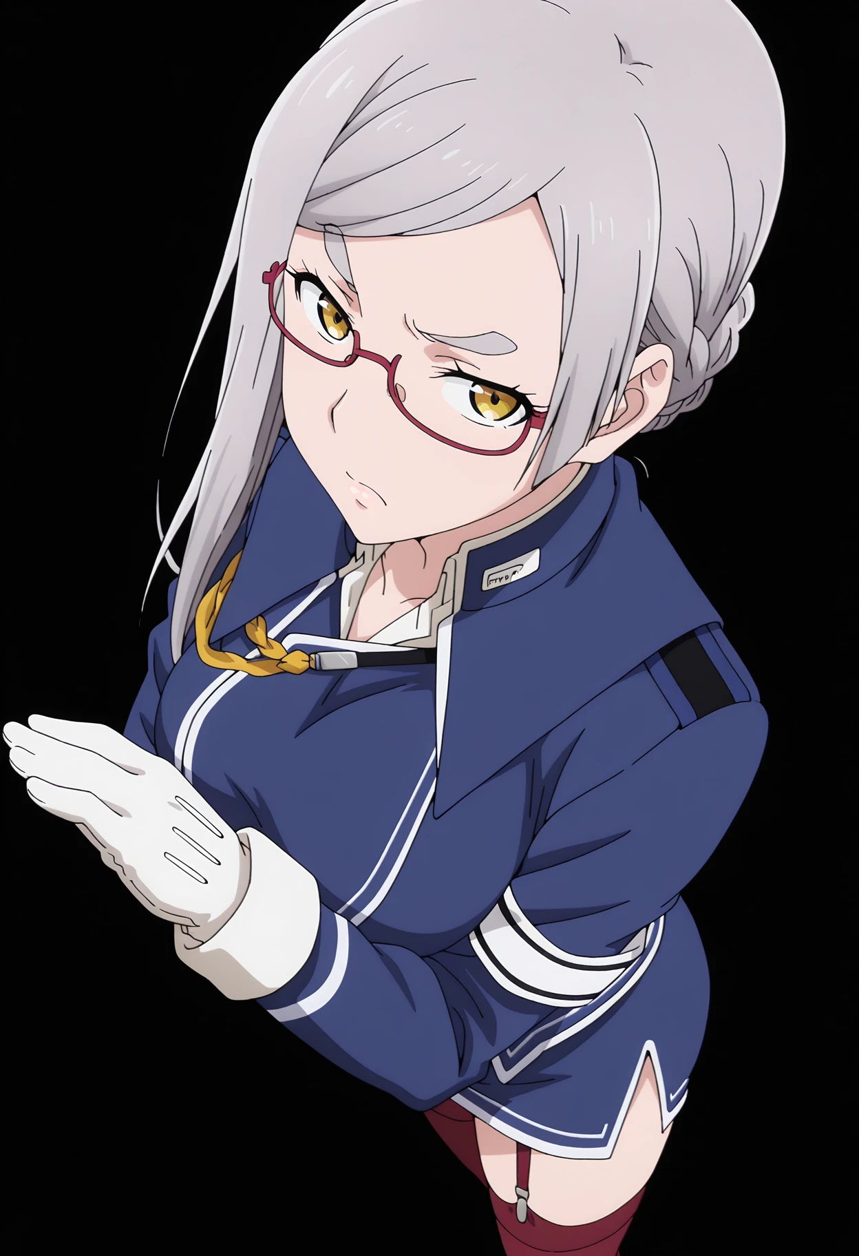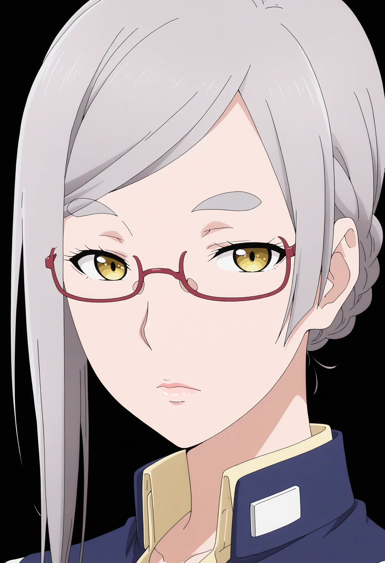 1girl, solo, erin, mature female, grey hair, glasses, semi-rimless eyewear, yellow eyes, braid,hair bun