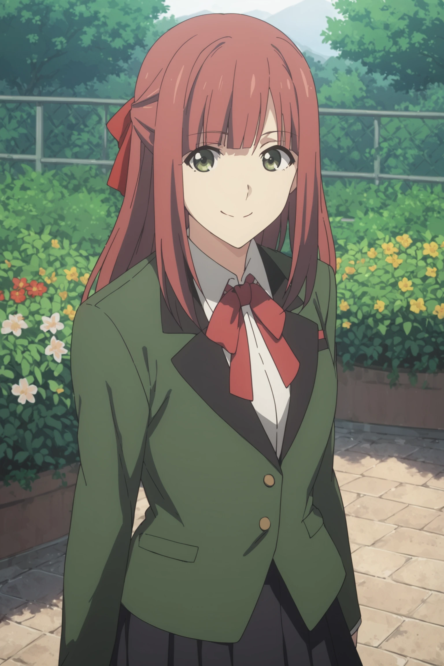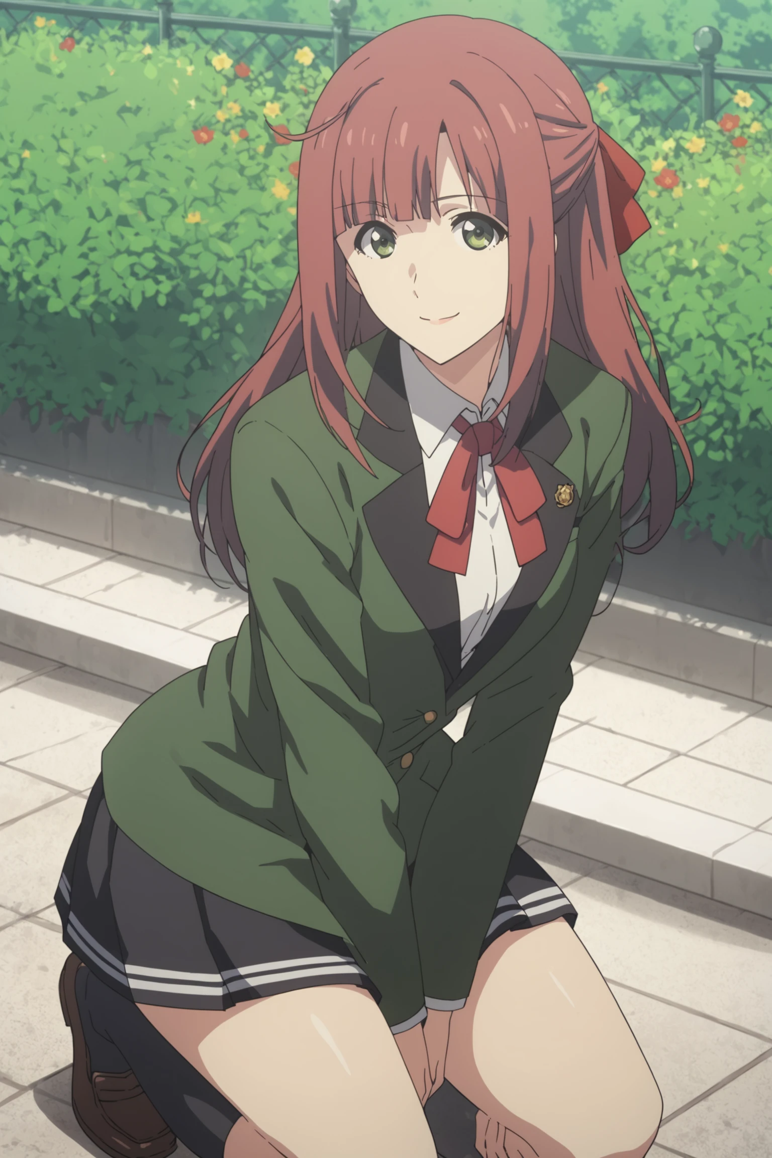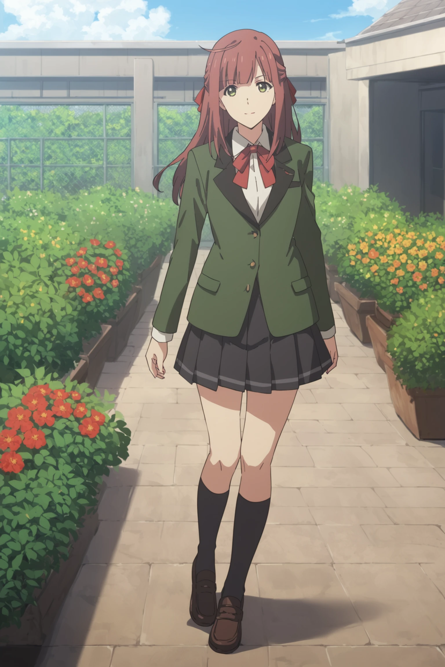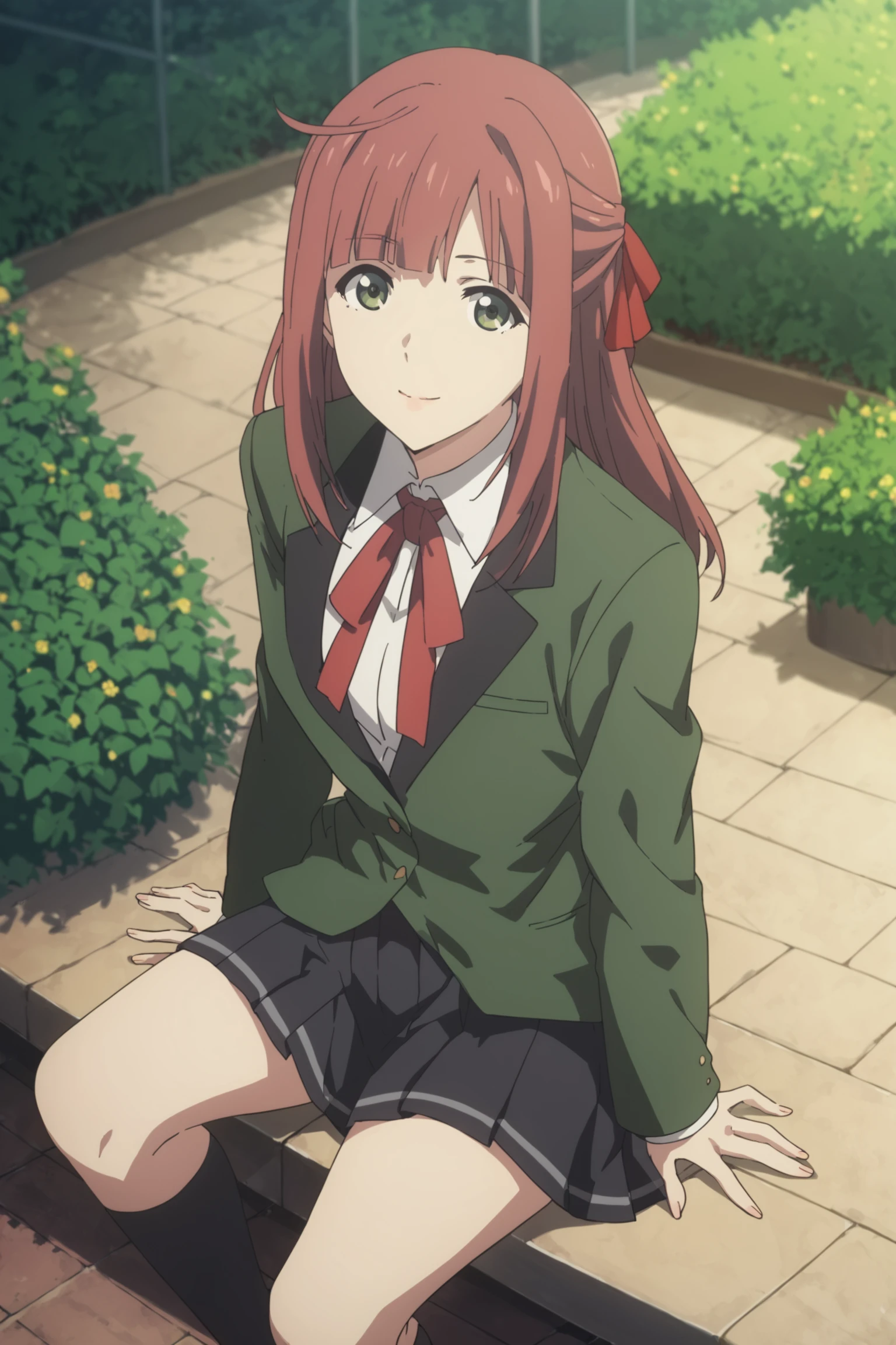 homura suzuko, long hair, red hair, green eyes, hair ribbon, school uniform, red bowtie, white shirt, jacket, green jacket, black skirt, pleated skirt, black kneehighs, loafers