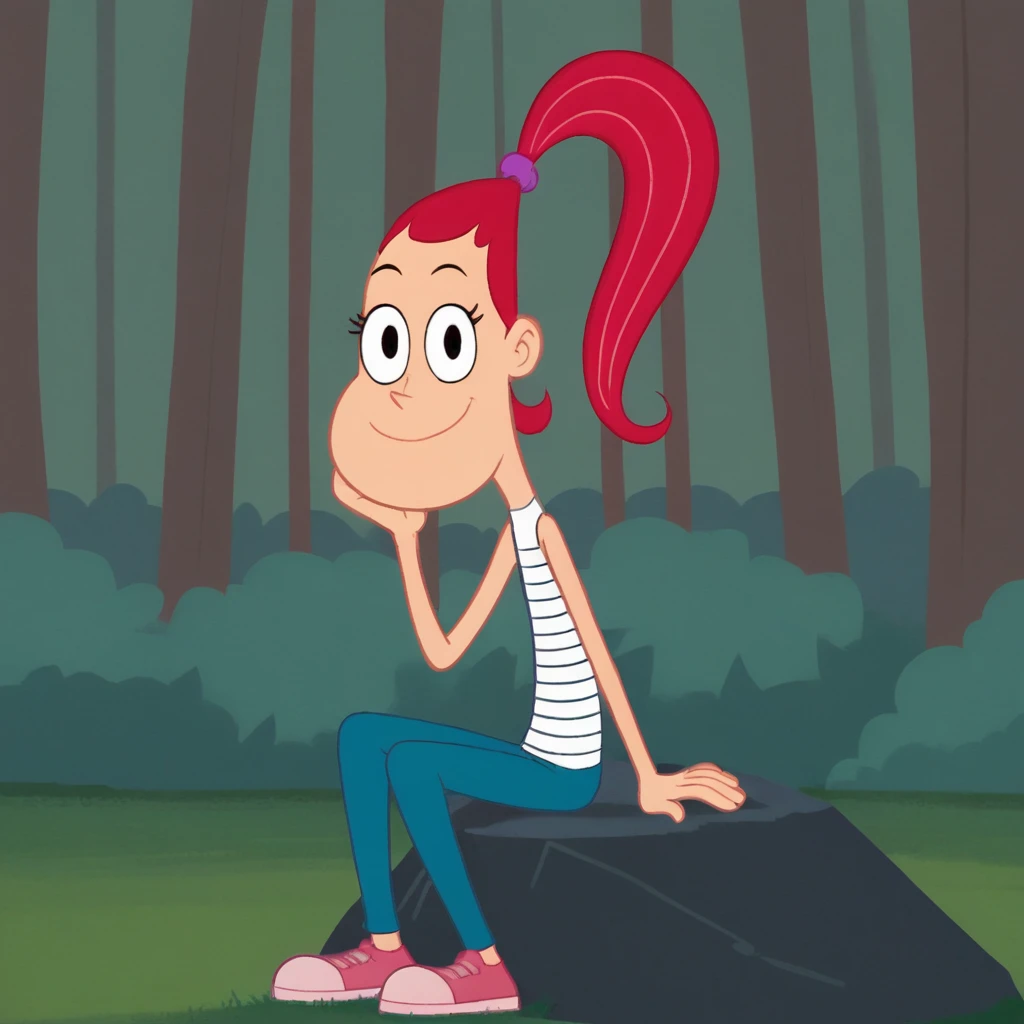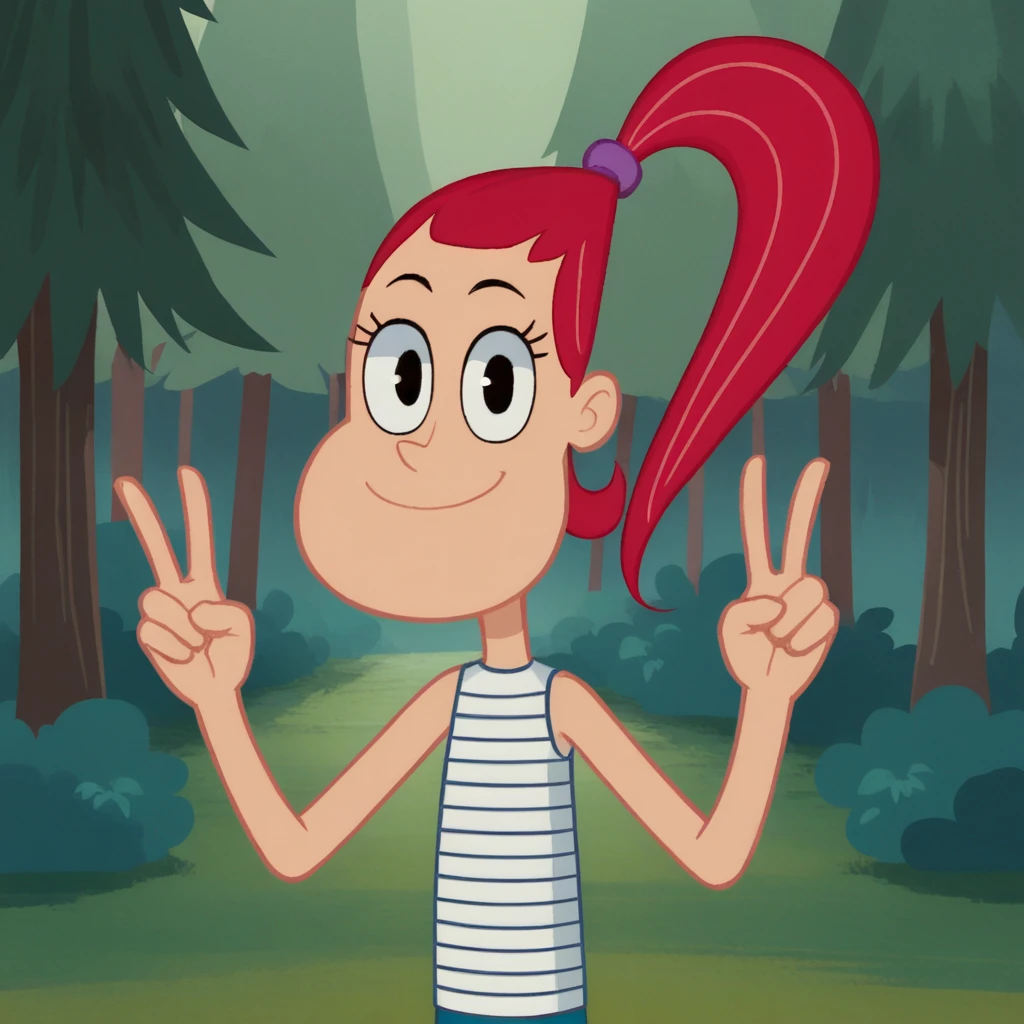 skyegunderson, 1girl, solo, red hair, high ponytail, black eyes,