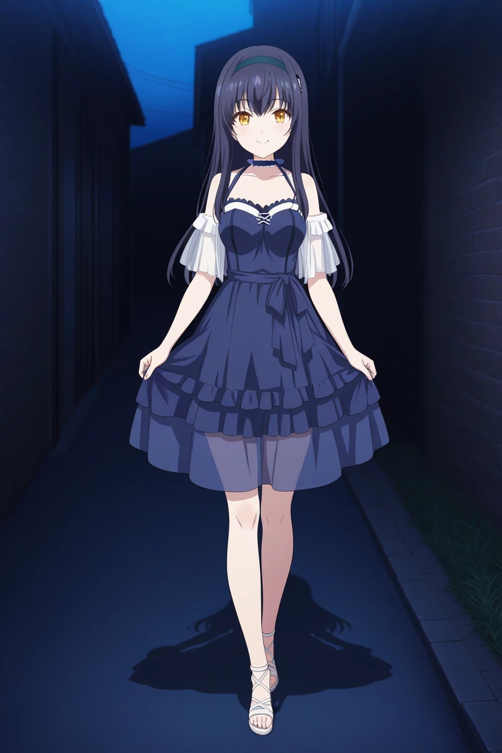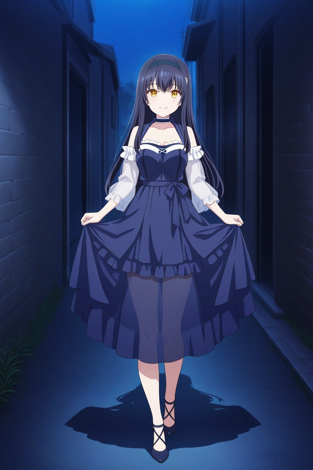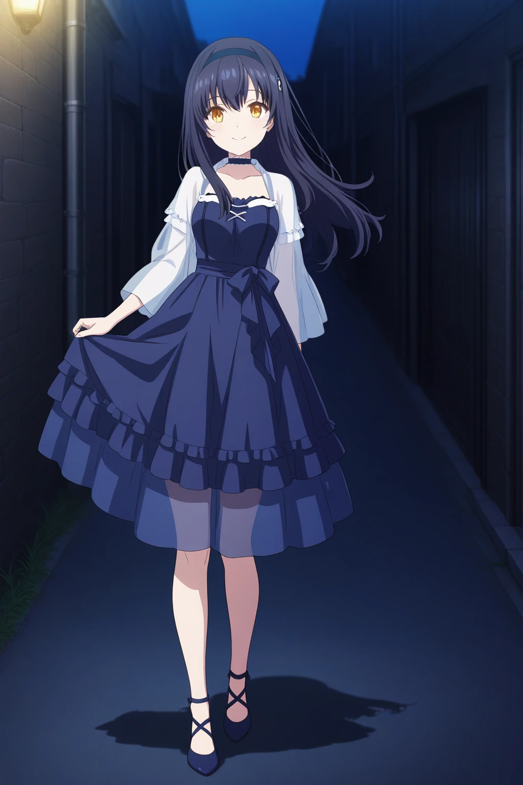 kamome_kushima, 1girl, solo, long hair, yellow eyes, dress, black hair, hairband, choker, layered skirt, see through,