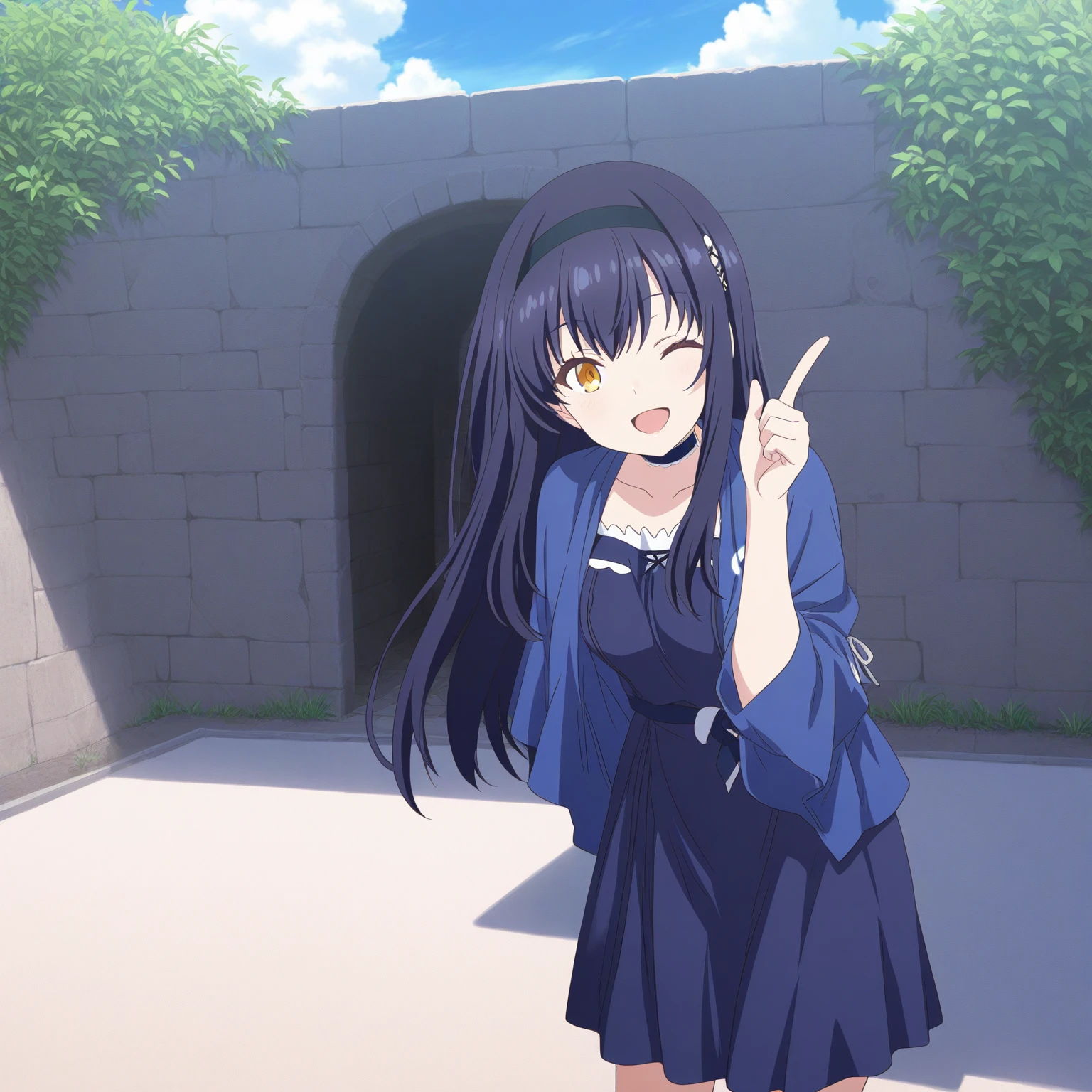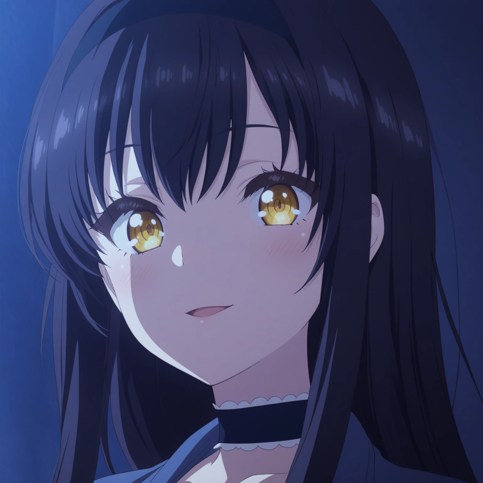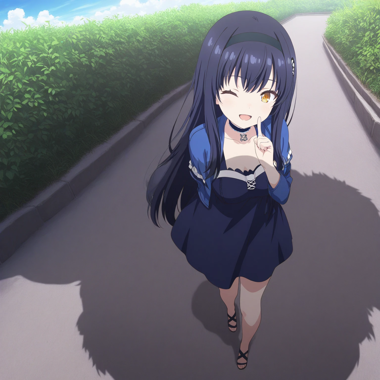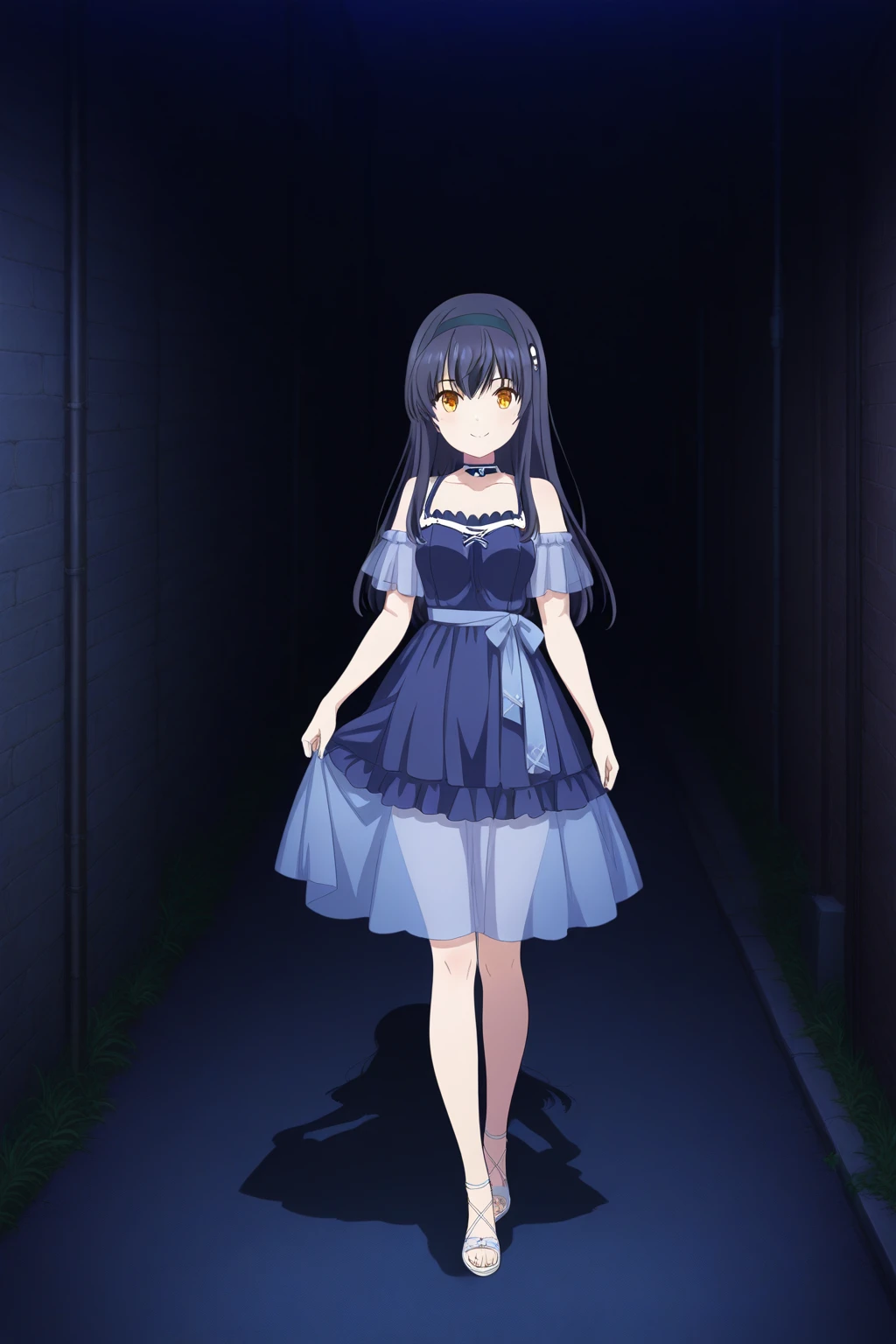 kamome_kushima, 1girl, solo, long hair, yellow eyes, dress, black hair, hairband, choker, layered skirt, see through,